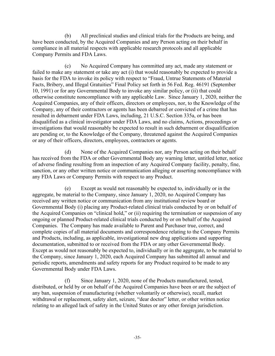 -35- (b) All preclinical studies and clinical trials for the Products are being, and have been conducted, by the Acquired Companies and any Person acting on their behalf in compliance in all material respects with applicable research protocols and all applicable Company Permits and FDA Laws. (c) No Acquired Company has committed any act, made any statement or failed to make any statement or take any act (i) that would reasonably be expected to provide a basis for the FDA to invoke its policy with respect to “Fraud, Untrue Statements of Material Facts, Bribery, and Illegal Gratuities” Final Policy set forth in 56 Fed. Reg. 46191 (September 10, 1991) or for any Governmental Body to invoke any similar policy, or (ii) that could otherwise constitute noncompliance with any applicable Law. Since January 1, 2020, neither the Acquired Companies, any of their officers, directors or employees, nor, to the Knowledge of the Company, any of their contractors or agents has been debarred or convicted of a crime that has resulted in debarment under FDA Laws, including, 21 U.S.C. Section 335a, or has been disqualified as a clinical investigator under FDA Laws, and no claims, Actions, proceedings or investigations that would reasonably be expected to result in such debarment or disqualification are pending or, to the Knowledge of the Company, threatened against the Acquired Companies or any of their officers, directors, employees, contractors or agents. (d) None of the Acquired Companies nor, any Person acting on their behalf has received from the FDA or other Governmental Body any warning letter, untitled letter, notice of adverse finding resulting from an inspection of any Acquired Company facility, penalty, fine, sanction, or any other written notice or communication alleging or asserting noncompliance with any FDA Laws or Company Permits with respect to any Product. (e) Except as would not reasonably be expected to, individually or in the aggregate, be material to the Company, since January 1, 2020, no Acquired Company has received any written notice or communication from any institutional review board or Governmental Body (i) placing any Product-related clinical trials conducted by or on behalf of the Acquired Companies on “clinical hold,” or (ii) requiring the termination or suspension of any ongoing or planned Product-related clinical trials conducted by or on behalf of the Acquired Companies. The Company has made available to Parent and Purchaser true, correct, and complete copies of all material documents and correspondence relating to the Company Permits and Products, including, as applicable, investigational new drug applications and supporting documentation, submitted to or received from the FDA or any other Governmental Body. Except as would not reasonably be expected to, individually or in the aggregate, to be material to the Company, since January 1, 2020, each Acquired Company has submitted all annual and periodic reports, amendments and safety reports for any Product required to be made to any Governmental Body under FDA Laws. (f) Since January 1, 2020, none of the Products manufactured, tested, distributed, or held by or on behalf of the Acquired Companies have been or are the subject of any ban, suspension of manufacturing (whether voluntarily or otherwise), recall, market withdrawal or replacement, safety alert, seizure, “dear doctor” letter, or other written notice relating to an alleged lack of safety in the United States or any other foreign jurisdiction.