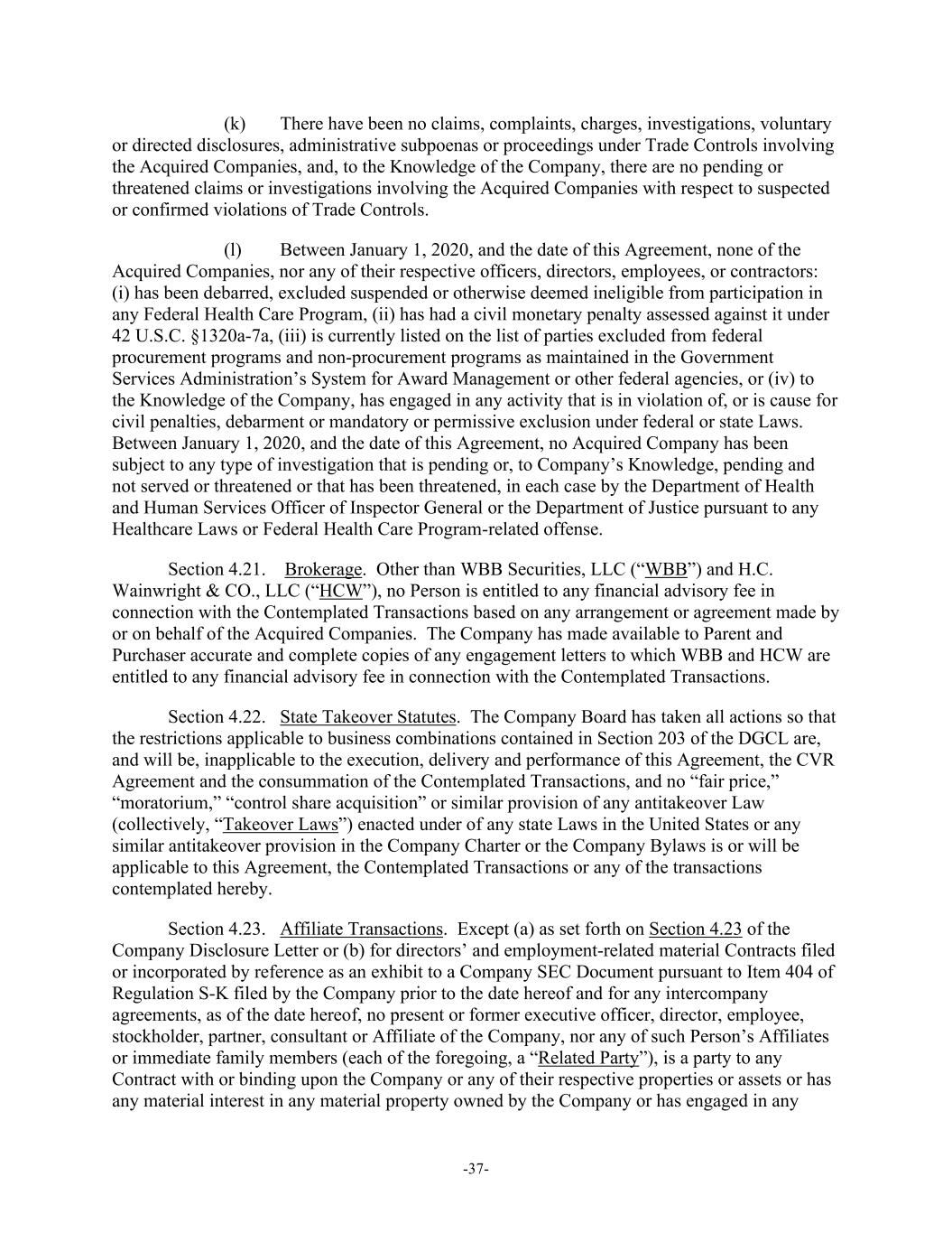 -37- (k) There have been no claims, complaints, charges, investigations, voluntary or directed disclosures, administrative subpoenas or proceedings under Trade Controls involving the Acquired Companies, and, to the Knowledge of the Company, there are no pending or threatened claims or investigations involving the Acquired Companies with respect to suspected or confirmed violations of Trade Controls. (l) Between January 1, 2020, and the date of this Agreement, none of the Acquired Companies, nor any of their respective officers, directors, employees, or contractors: (i) has been debarred, excluded suspended or otherwise deemed ineligible from participation in any Federal Health Care Program, (ii) has had a civil monetary penalty assessed against it under 42 U.S.C. §1320a-7a, (iii) is currently listed on the list of parties excluded from federal procurement programs and non-procurement programs as maintained in the Government Services Administration’s System for Award Management or other federal agencies, or (iv) to the Knowledge of the Company, has engaged in any activity that is in violation of, or is cause for civil penalties, debarment or mandatory or permissive exclusion under federal or state Laws. Between January 1, 2020, and the date of this Agreement, no Acquired Company has been subject to any type of investigation that is pending or, to Company’s Knowledge, pending and not served or threatened or that has been threatened, in each case by the Department of Health and Human Services Officer of Inspector General or the Department of Justice pursuant to any Healthcare Laws or Federal Health Care Program-related offense. Section 4.21. Brokerage. Other than WBB Securities, LLC (“WBB”) and H.C. Wainwright & CO., LLC (“HCW”), no Person is entitled to any financial advisory fee in connection with the Contemplated Transactions based on any arrangement or agreement made by or on behalf of the Acquired Companies. The Company has made available to Parent and Purchaser accurate and complete copies of any engagement letters to which WBB and HCW are entitled to any financial advisory fee in connection with the Contemplated Transactions. Section 4.22. State Takeover Statutes. The Company Board has taken all actions so that the restrictions applicable to business combinations contained in Section 203 of the DGCL are, and will be, inapplicable to the execution, delivery and performance of this Agreement, the CVR Agreement and the consummation of the Contemplated Transactions, and no “fair price,” “moratorium,” “control share acquisition” or similar provision of any antitakeover Law (collectively, “Takeover Laws”) enacted under of any state Laws in the United States or any similar antitakeover provision in the Company Charter or the Company Bylaws is or will be applicable to this Agreement, the Contemplated Transactions or any of the transactions contemplated hereby. Section 4.23. Affiliate Transactions. Except (a) as set forth on Section 4.23 of the Company Disclosure Letter or (b) for directors’ and employment-related material Contracts filed or incorporated by reference as an exhibit to a Company SEC Document pursuant to Item 404 of Regulation S-K filed by the Company prior to the date hereof and for any intercompany agreements, as of the date hereof, no present or former executive officer, director, employee, stockholder, partner, consultant or Affiliate of the Company, nor any of such Person’s Affiliates or immediate family members (each of the foregoing, a “Related Party”), is a party to any Contract with or binding upon the Company or any of their respective properties or assets or has any material interest in any material property owned by the Company or has engaged in any