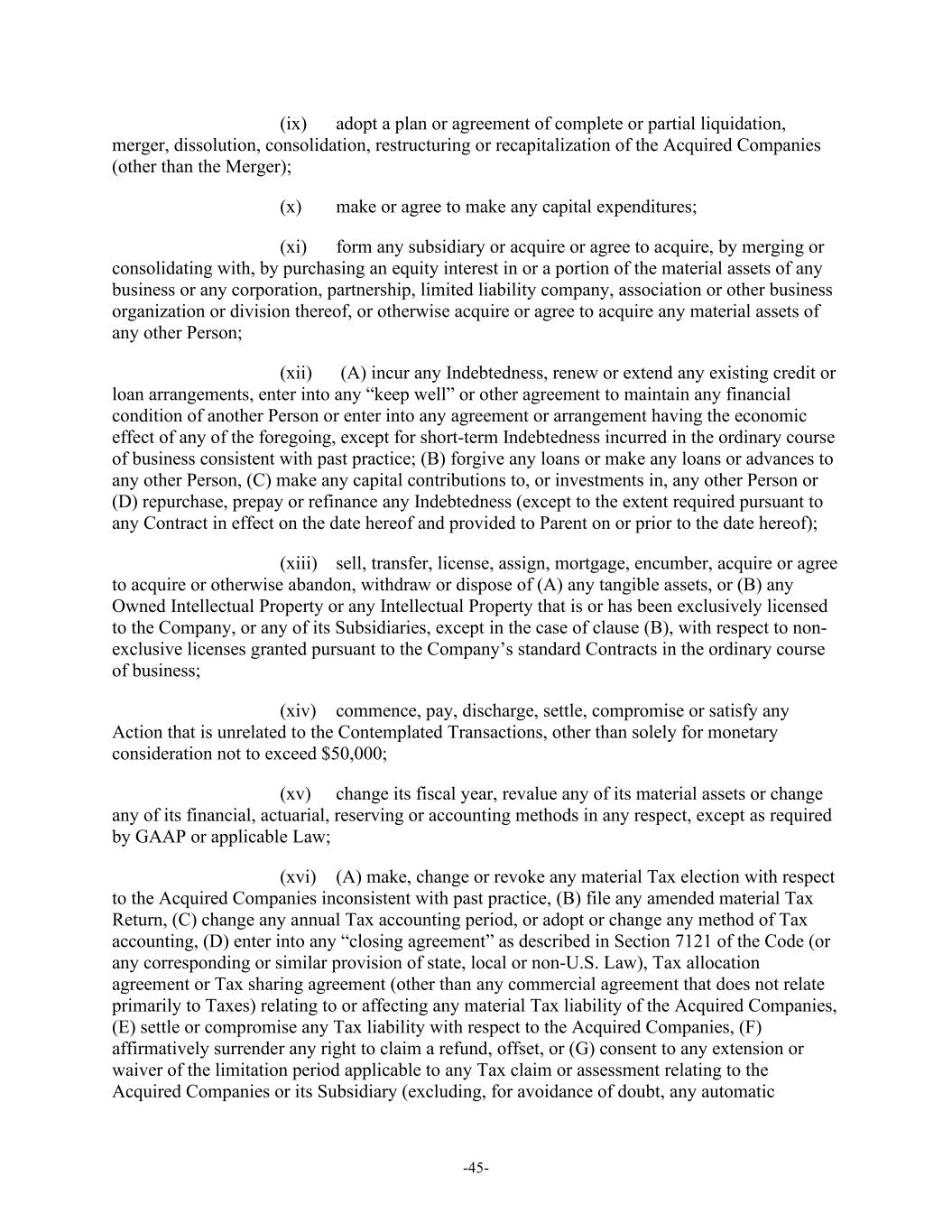 -45- (ix) adopt a plan or agreement of complete or partial liquidation, merger, dissolution, consolidation, restructuring or recapitalization of the Acquired Companies (other than the Merger); (x) make or agree to make any capital expenditures; (xi) form any subsidiary or acquire or agree to acquire, by merging or consolidating with, by purchasing an equity interest in or a portion of the material assets of any business or any corporation, partnership, limited liability company, association or other business organization or division thereof, or otherwise acquire or agree to acquire any material assets of any other Person; (xii) (A) incur any Indebtedness, renew or extend any existing credit or loan arrangements, enter into any “keep well” or other agreement to maintain any financial condition of another Person or enter into any agreement or arrangement having the economic effect of any of the foregoing, except for short-term Indebtedness incurred in the ordinary course of business consistent with past practice; (B) forgive any loans or make any loans or advances to any other Person, (C) make any capital contributions to, or investments in, any other Person or (D) repurchase, prepay or refinance any Indebtedness (except to the extent required pursuant to any Contract in effect on the date hereof and provided to Parent on or prior to the date hereof); (xiii) sell, transfer, license, assign, mortgage, encumber, acquire or agree to acquire or otherwise abandon, withdraw or dispose of (A) any tangible assets, or (B) any Owned Intellectual Property or any Intellectual Property that is or has been exclusively licensed to the Company, or any of its Subsidiaries, except in the case of clause (B), with respect to non- exclusive licenses granted pursuant to the Company’s standard Contracts in the ordinary course of business; (xiv) commence, pay, discharge, settle, compromise or satisfy any Action that is unrelated to the Contemplated Transactions, other than solely for monetary consideration not to exceed $50,000; (xv) change its fiscal year, revalue any of its material assets or change any of its financial, actuarial, reserving or accounting methods in any respect, except as required by GAAP or applicable Law; (xvi) (A) make, change or revoke any material Tax election with respect to the Acquired Companies inconsistent with past practice, (B) file any amended material Tax Return, (C) change any annual Tax accounting period, or adopt or change any method of Tax accounting, (D) enter into any “closing agreement” as described in Section 7121 of the Code (or any corresponding or similar provision of state, local or non-U.S. Law), Tax allocation agreement or Tax sharing agreement (other than any commercial agreement that does not relate primarily to Taxes) relating to or affecting any material Tax liability of the Acquired Companies, (E) settle or compromise any Tax liability with respect to the Acquired Companies, (F) affirmatively surrender any right to claim a refund, offset, or (G) consent to any extension or waiver of the limitation period applicable to any Tax claim or assessment relating to the Acquired Companies or its Subsidiary (excluding, for avoidance of doubt, any automatic
