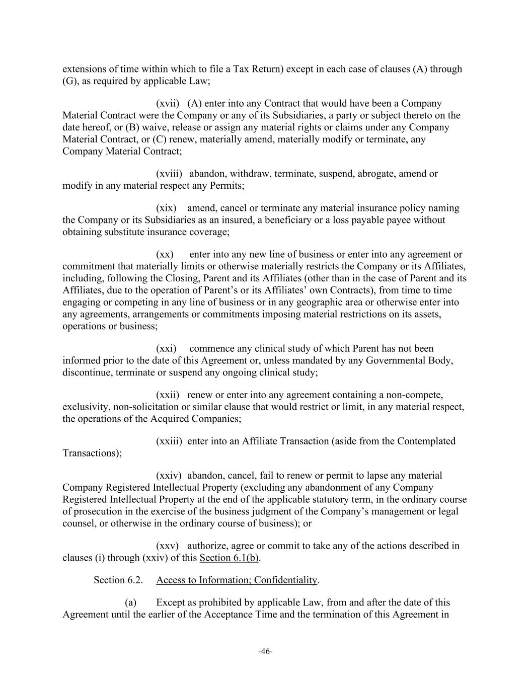 -46- extensions of time within which to file a Tax Return) except in each case of clauses (A) through (G), as required by applicable Law; (xvii) (A) enter into any Contract that would have been a Company Material Contract were the Company or any of its Subsidiaries, a party or subject thereto on the date hereof, or (B) waive, release or assign any material rights or claims under any Company Material Contract, or (C) renew, materially amend, materially modify or terminate, any Company Material Contract; (xviii)  abandon, withdraw, terminate, suspend, abrogate, amend or modify in any material respect any Permits; (xix) amend, cancel or terminate any material insurance policy naming the Company or its Subsidiaries as an insured, a beneficiary or a loss payable payee without obtaining substitute insurance coverage; (xx)  enter into any new line of business or enter into any agreement or commitment that materially limits or otherwise materially restricts the Company or its Affiliates, including, following the Closing, Parent and its Affiliates (other than in the case of Parent and its Affiliates, due to the operation of Parent’s or its Affiliates’ own Contracts), from time to time engaging or competing in any line of business or in any geographic area or otherwise enter into any agreements, arrangements or commitments imposing material restrictions on its assets, operations or business; (xxi)  commence any clinical study of which Parent has not been informed prior to the date of this Agreement or, unless mandated by any Governmental Body, discontinue, terminate or suspend any ongoing clinical study; (xxii) renew or enter into any agreement containing a non-compete, exclusivity, non-solicitation or similar clause that would restrict or limit, in any material respect, the operations of the Acquired Companies; (xxiii) enter into an Affiliate Transaction (aside from the Contemplated Transactions); (xxiv) abandon, cancel, fail to renew or permit to lapse any material Company Registered Intellectual Property (excluding any abandonment of any Company Registered Intellectual Property at the end of the applicable statutory term, in the ordinary course of prosecution in the exercise of the business judgment of the Company’s management or legal counsel, or otherwise in the ordinary course of business); or (xxv) authorize, agree or commit to take any of the actions described in clauses (i) through (xxiv) of this Section 6.1(b). Section 6.2. Access to Information; Confidentiality. (a) Except as prohibited by applicable Law, from and after the date of this Agreement until the earlier of the Acceptance Time and the termination of this Agreement in
