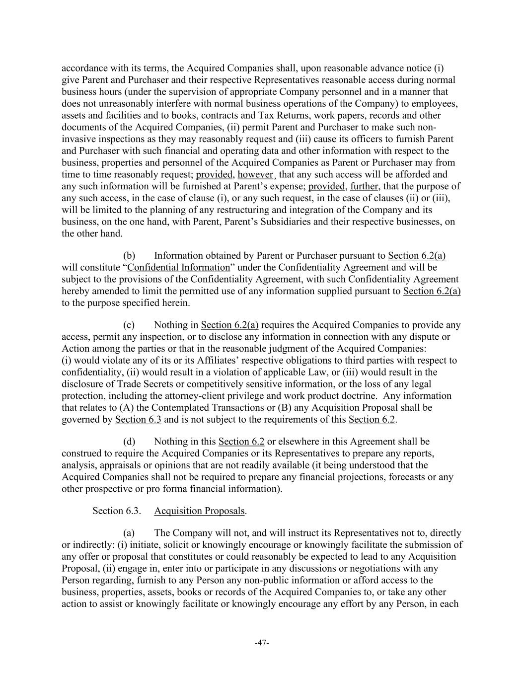 -47- accordance with its terms, the Acquired Companies shall, upon reasonable advance notice (i) give Parent and Purchaser and their respective Representatives reasonable access during normal business hours (under the supervision of appropriate Company personnel and in a manner that does not unreasonably interfere with normal business operations of the Company) to employees, assets and facilities and to books, contracts and Tax Returns, work papers, records and other documents of the Acquired Companies, (ii) permit Parent and Purchaser to make such non- invasive inspections as they may reasonably request and (iii) cause its officers to furnish Parent and Purchaser with such financial and operating data and other information with respect to the business, properties and personnel of the Acquired Companies as Parent or Purchaser may from time to time reasonably request; provided, however ̧that any such access will be afforded and any such information will be furnished at Parent’s expense; provided, further, that the purpose of any such access, in the case of clause (i), or any such request, in the case of clauses (ii) or (iii), will be limited to the planning of any restructuring and integration of the Company and its business, on the one hand, with Parent, Parent’s Subsidiaries and their respective businesses, on the other hand. (b) Information obtained by Parent or Purchaser pursuant to Section 6.2(a) will constitute “Confidential Information” under the Confidentiality Agreement and will be subject to the provisions of the Confidentiality Agreement, with such Confidentiality Agreement hereby amended to limit the permitted use of any information supplied pursuant to Section 6.2(a) to the purpose specified herein. (c) Nothing in Section 6.2(a) requires the Acquired Companies to provide any access, permit any inspection, or to disclose any information in connection with any dispute or Action among the parties or that in the reasonable judgment of the Acquired Companies: (i) would violate any of its or its Affiliates’ respective obligations to third parties with respect to confidentiality, (ii) would result in a violation of applicable Law, or (iii) would result in the disclosure of Trade Secrets or competitively sensitive information, or the loss of any legal protection, including the attorney-client privilege and work product doctrine. Any information that relates to (A) the Contemplated Transactions or (B) any Acquisition Proposal shall be governed by Section 6.3 and is not subject to the requirements of this Section 6.2. (d) Nothing in this Section 6.2 or elsewhere in this Agreement shall be construed to require the Acquired Companies or its Representatives to prepare any reports, analysis, appraisals or opinions that are not readily available (it being understood that the Acquired Companies shall not be required to prepare any financial projections, forecasts or any other prospective or pro forma financial information). Section 6.3. Acquisition Proposals. (a) The Company will not, and will instruct its Representatives not to, directly or indirectly: (i) initiate, solicit or knowingly encourage or knowingly facilitate the submission of any offer or proposal that constitutes or could reasonably be expected to lead to any Acquisition Proposal, (ii) engage in, enter into or participate in any discussions or negotiations with any Person regarding, furnish to any Person any non-public information or afford access to the business, properties, assets, books or records of the Acquired Companies to, or take any other action to assist or knowingly facilitate or knowingly encourage any effort by any Person, in each
