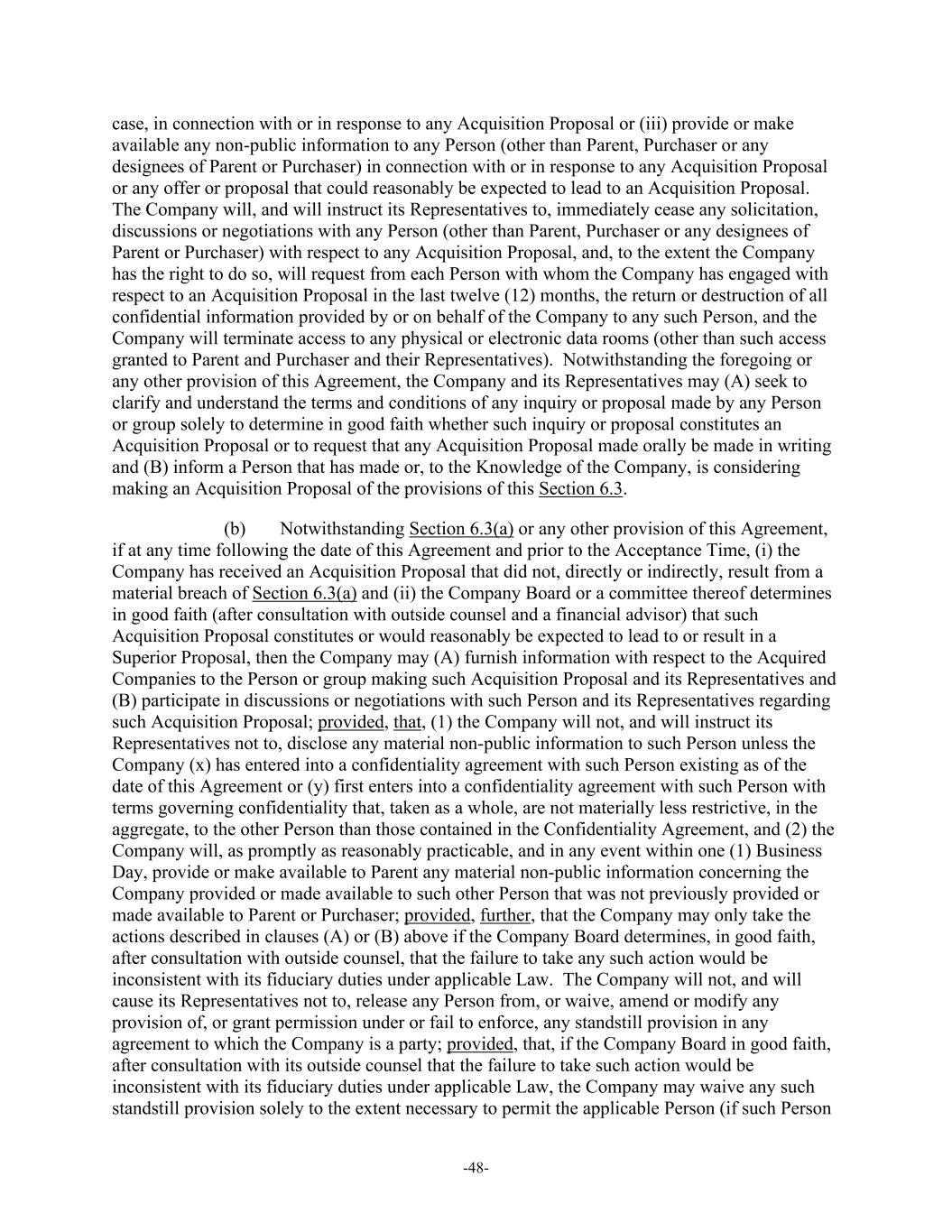 -48- case, in connection with or in response to any Acquisition Proposal or (iii) provide or make available any non-public information to any Person (other than Parent, Purchaser or any designees of Parent or Purchaser) in connection with or in response to any Acquisition Proposal or any offer or proposal that could reasonably be expected to lead to an Acquisition Proposal. The Company will, and will instruct its Representatives to, immediately cease any solicitation, discussions or negotiations with any Person (other than Parent, Purchaser or any designees of Parent or Purchaser) with respect to any Acquisition Proposal, and, to the extent the Company has the right to do so, will request from each Person with whom the Company has engaged with respect to an Acquisition Proposal in the last twelve (12) months, the return or destruction of all confidential information provided by or on behalf of the Company to any such Person, and the Company will terminate access to any physical or electronic data rooms (other than such access granted to Parent and Purchaser and their Representatives). Notwithstanding the foregoing or any other provision of this Agreement, the Company and its Representatives may (A) seek to clarify and understand the terms and conditions of any inquiry or proposal made by any Person or group solely to determine in good faith whether such inquiry or proposal constitutes an Acquisition Proposal or to request that any Acquisition Proposal made orally be made in writing and (B) inform a Person that has made or, to the Knowledge of the Company, is considering making an Acquisition Proposal of the provisions of this Section 6.3. (b) Notwithstanding Section 6.3(a) or any other provision of this Agreement, if at any time following the date of this Agreement and prior to the Acceptance Time, (i) the Company has received an Acquisition Proposal that did not, directly or indirectly, result from a material breach of Section 6.3(a) and (ii) the Company Board or a committee thereof determines in good faith (after consultation with outside counsel and a financial advisor) that such Acquisition Proposal constitutes or would reasonably be expected to lead to or result in a Superior Proposal, then the Company may (A) furnish information with respect to the Acquired Companies to the Person or group making such Acquisition Proposal and its Representatives and (B) participate in discussions or negotiations with such Person and its Representatives regarding such Acquisition Proposal; provided, that, (1) the Company will not, and will instruct its Representatives not to, disclose any material non-public information to such Person unless the Company (x) has entered into a confidentiality agreement with such Person existing as of the date of this Agreement or (y) first enters into a confidentiality agreement with such Person with terms governing confidentiality that, taken as a whole, are not materially less restrictive, in the aggregate, to the other Person than those contained in the Confidentiality Agreement, and (2) the Company will, as promptly as reasonably practicable, and in any event within one (1) Business Day, provide or make available to Parent any material non-public information concerning the Company provided or made available to such other Person that was not previously provided or made available to Parent or Purchaser; provided, further, that the Company may only take the actions described in clauses (A) or (B) above if the Company Board determines, in good faith, after consultation with outside counsel, that the failure to take any such action would be inconsistent with its fiduciary duties under applicable Law. The Company will not, and will cause its Representatives not to, release any Person from, or waive, amend or modify any provision of, or grant permission under or fail to enforce, any standstill provision in any agreement to which the Company is a party; provided, that, if the Company Board in good faith, after consultation with its outside counsel that the failure to take such action would be inconsistent with its fiduciary duties under applicable Law, the Company may waive any such standstill provision solely to the extent necessary to permit the applicable Person (if such Person