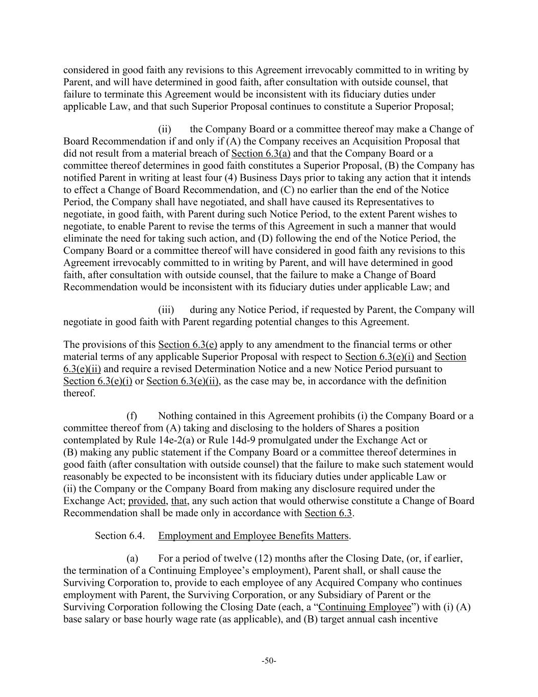-50- considered in good faith any revisions to this Agreement irrevocably committed to in writing by Parent, and will have determined in good faith, after consultation with outside counsel, that failure to terminate this Agreement would be inconsistent with its fiduciary duties under applicable Law, and that such Superior Proposal continues to constitute a Superior Proposal; (ii) the Company Board or a committee thereof may make a Change of Board Recommendation if and only if (A) the Company receives an Acquisition Proposal that did not result from a material breach of Section 6.3(a) and that the Company Board or a committee thereof determines in good faith constitutes a Superior Proposal, (B) the Company has notified Parent in writing at least four (4) Business Days prior to taking any action that it intends to effect a Change of Board Recommendation, and (C) no earlier than the end of the Notice Period, the Company shall have negotiated, and shall have caused its Representatives to negotiate, in good faith, with Parent during such Notice Period, to the extent Parent wishes to negotiate, to enable Parent to revise the terms of this Agreement in such a manner that would eliminate the need for taking such action, and (D) following the end of the Notice Period, the Company Board or a committee thereof will have considered in good faith any revisions to this Agreement irrevocably committed to in writing by Parent, and will have determined in good faith, after consultation with outside counsel, that the failure to make a Change of Board Recommendation would be inconsistent with its fiduciary duties under applicable Law; and (iii) during any Notice Period, if requested by Parent, the Company will negotiate in good faith with Parent regarding potential changes to this Agreement. The provisions of this Section 6.3(e) apply to any amendment to the financial terms or other material terms of any applicable Superior Proposal with respect to Section 6.3(e)(i) and Section 6.3(e)(ii) and require a revised Determination Notice and a new Notice Period pursuant to Section 6.3(e)(i) or Section 6.3(e)(ii), as the case may be, in accordance with the definition thereof. (f) Nothing contained in this Agreement prohibits (i) the Company Board or a committee thereof from (A) taking and disclosing to the holders of Shares a position contemplated by Rule 14e-2(a) or Rule 14d-9 promulgated under the Exchange Act or (B) making any public statement if the Company Board or a committee thereof determines in good faith (after consultation with outside counsel) that the failure to make such statement would reasonably be expected to be inconsistent with its fiduciary duties under applicable Law or (ii) the Company or the Company Board from making any disclosure required under the Exchange Act; provided, that, any such action that would otherwise constitute a Change of Board Recommendation shall be made only in accordance with Section 6.3. Section 6.4. Employment and Employee Benefits Matters. (a) For a period of twelve (12) months after the Closing Date, (or, if earlier, the termination of a Continuing Employee’s employment), Parent shall, or shall cause the Surviving Corporation to, provide to each employee of any Acquired Company who continues employment with Parent, the Surviving Corporation, or any Subsidiary of Parent or the Surviving Corporation following the Closing Date (each, a “Continuing Employee”) with (i) (A) base salary or base hourly wage rate (as applicable), and (B) target annual cash incentive