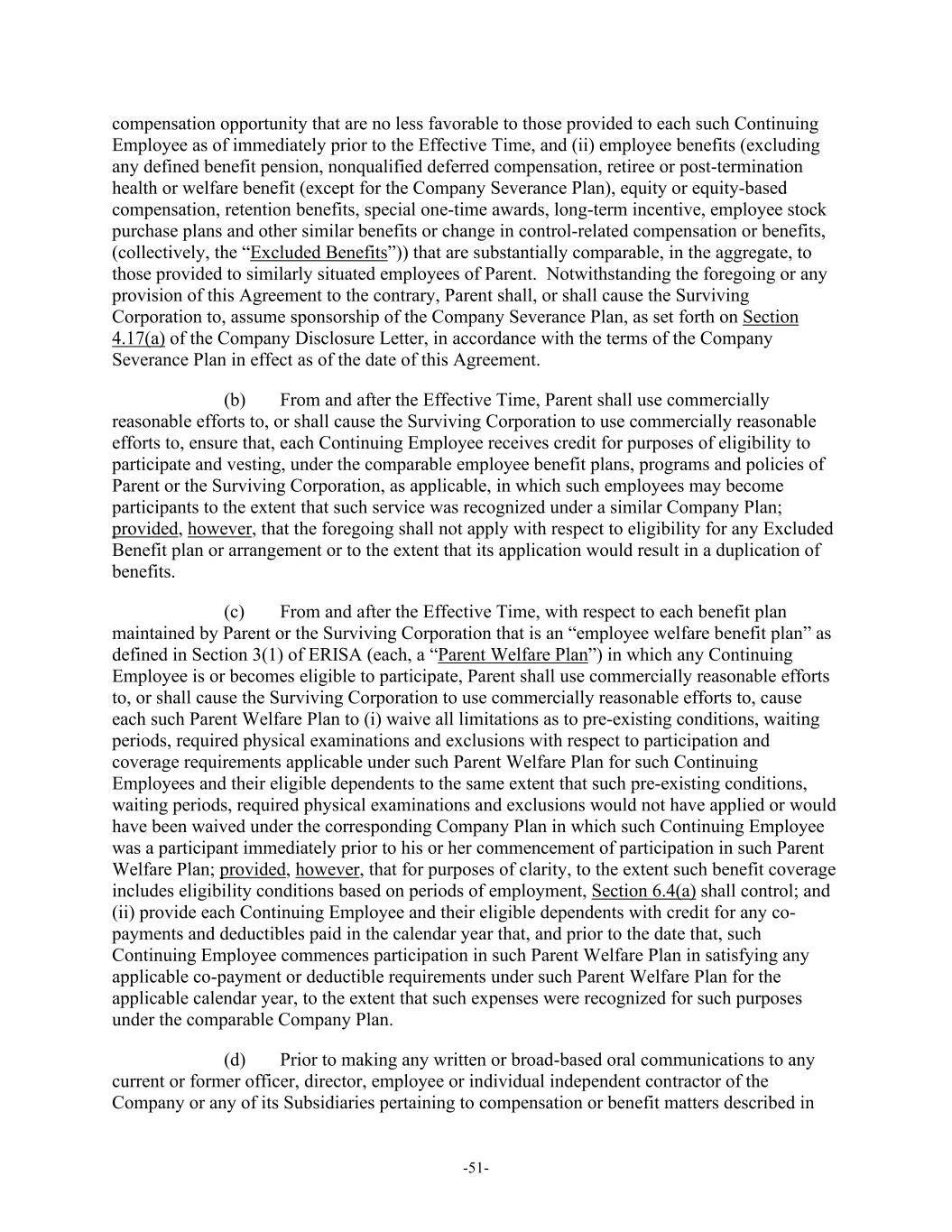-51- compensation opportunity that are no less favorable to those provided to each such Continuing Employee as of immediately prior to the Effective Time, and (ii) employee benefits (excluding any defined benefit pension, nonqualified deferred compensation, retiree or post-termination health or welfare benefit (except for the Company Severance Plan), equity or equity-based compensation, retention benefits, special one-time awards, long-term incentive, employee stock purchase plans and other similar benefits or change in control-related compensation or benefits, (collectively, the “Excluded Benefits”)) that are substantially comparable, in the aggregate, to those provided to similarly situated employees of Parent. Notwithstanding the foregoing or any provision of this Agreement to the contrary, Parent shall, or shall cause the Surviving Corporation to, assume sponsorship of the Company Severance Plan, as set forth on Section 4.17(a) of the Company Disclosure Letter, in accordance with the terms of the Company Severance Plan in effect as of the date of this Agreement. (b) From and after the Effective Time, Parent shall use commercially reasonable efforts to, or shall cause the Surviving Corporation to use commercially reasonable efforts to, ensure that, each Continuing Employee receives credit for purposes of eligibility to participate and vesting, under the comparable employee benefit plans, programs and policies of Parent or the Surviving Corporation, as applicable, in which such employees may become participants to the extent that such service was recognized under a similar Company Plan; provided, however, that the foregoing shall not apply with respect to eligibility for any Excluded Benefit plan or arrangement or to the extent that its application would result in a duplication of benefits. (c) From and after the Effective Time, with respect to each benefit plan maintained by Parent or the Surviving Corporation that is an “employee welfare benefit plan” as defined in Section 3(1) of ERISA (each, a “Parent Welfare Plan”) in which any Continuing Employee is or becomes eligible to participate, Parent shall use commercially reasonable efforts to, or shall cause the Surviving Corporation to use commercially reasonable efforts to, cause each such Parent Welfare Plan to (i) waive all limitations as to pre-existing conditions, waiting periods, required physical examinations and exclusions with respect to participation and coverage requirements applicable under such Parent Welfare Plan for such Continuing Employees and their eligible dependents to the same extent that such pre-existing conditions, waiting periods, required physical examinations and exclusions would not have applied or would have been waived under the corresponding Company Plan in which such Continuing Employee was a participant immediately prior to his or her commencement of participation in such Parent Welfare Plan; provided, however, that for purposes of clarity, to the extent such benefit coverage includes eligibility conditions based on periods of employment, Section 6.4(a) shall control; and (ii) provide each Continuing Employee and their eligible dependents with credit for any co- payments and deductibles paid in the calendar year that, and prior to the date that, such Continuing Employee commences participation in such Parent Welfare Plan in satisfying any applicable co-payment or deductible requirements under such Parent Welfare Plan for the applicable calendar year, to the extent that such expenses were recognized for such purposes under the comparable Company Plan. (d) Prior to making any written or broad-based oral communications to any current or former officer, director, employee or individual independent contractor of the Company or any of its Subsidiaries pertaining to compensation or benefit matters described in
