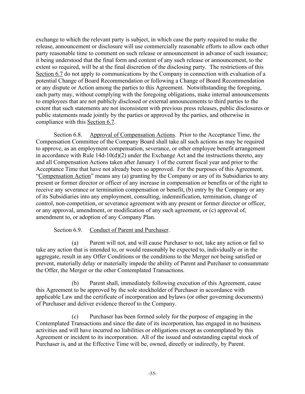 -55- exchange to which the relevant party is subject, in which case the party required to make the release, announcement or disclosure will use commercially reasonable efforts to allow each other party reasonable time to comment on such release or announcement in advance of such issuance; it being understood that the final form and content of any such release or announcement, to the extent so required, will be at the final discretion of the disclosing party. The restrictions of this Section 6.7 do not apply to communications by the Company in connection with evaluation of a potential Change of Board Recommendation or following a Change of Board Recommendation or any dispute or Action among the parties to this Agreement. Notwithstanding the foregoing, each party may, without complying with the foregoing obligations, make internal announcements to employees that are not publicly disclosed or external announcements to third parties to the extent that such statements are not inconsistent with previous press releases, public disclosures or public statements made jointly by the parties or approved by the parties, and otherwise in compliance with this Section 6.7. Section 6.8. Approval of Compensation Actions. Prior to the Acceptance Time, the Compensation Committee of the Company Board shall take all such actions as may be required to approve, as an employment compensation, severance, or other employee benefit arrangement in accordance with Rule 14d-10(d)(2) under the Exchange Act and the instructions thereto, any and all Compensation Actions taken after January 1 of the current fiscal year and prior to the Acceptance Time that have not already been so approved. For the purposes of this Agreement, “Compensation Action” means any (a) granting by the Company or any of its Subsidiaries to any present or former director or officer of any increase in compensation or benefits or of the right to receive any severance or termination compensation or benefit, (b) entry by the Company or any of its Subsidiaries into any employment, consulting, indemnification, termination, change of control, non-competition, or severance agreement with any present or former director or officer, or any approval, amendment, or modification of any such agreement, or (c) approval of, amendment to, or adoption of any Company Plan. Section 6.9. Conduct of Parent and Purchaser. (a) Parent will not, and will cause Purchaser to not, take any action or fail to take any action that is intended to, or would reasonably be expected to, individually or in the aggregate, result in any Offer Conditions or the conditions to the Merger not being satisfied or prevent, materially delay or materially impede the ability of Parent and Purchaser to consummate the Offer, the Merger or the other Contemplated Transactions. (b) Parent shall, immediately following execution of this Agreement, cause this Agreement to be approved by the sole stockholder of Purchaser in accordance with applicable Law and the certificate of incorporation and bylaws (or other governing documents) of Purchaser and deliver evidence thereof to the Company. (c) Purchaser has been formed solely for the purpose of engaging in the Contemplated Transactions and since the date of its incorporation, has engaged in no business activities and will have incurred no liabilities or obligations except as contemplated by this Agreement or incident to its incorporation. All of the issued and outstanding capital stock of Purchaser is, and at the Effective Time will be, owned, directly or indirectly, by Parent.