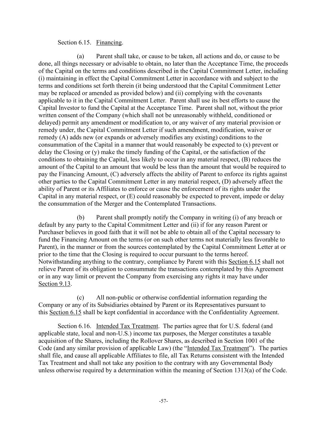 -57- Section 6.15. Financing. (a) Parent shall take, or cause to be taken, all actions and do, or cause to be done, all things necessary or advisable to obtain, no later than the Acceptance Time, the proceeds of the Capital on the terms and conditions described in the Capital Commitment Letter, including (i) maintaining in effect the Capital Commitment Letter in accordance with and subject to the terms and conditions set forth therein (it being understood that the Capital Commitment Letter may be replaced or amended as provided below) and (ii) complying with the covenants applicable to it in the Capital Commitment Letter. Parent shall use its best efforts to cause the Capital Investor to fund the Capital at the Acceptance Time. Parent shall not, without the prior written consent of the Company (which shall not be unreasonably withheld, conditioned or delayed) permit any amendment or modification to, or any waiver of any material provision or remedy under, the Capital Commitment Letter if such amendment, modification, waiver or remedy (A) adds new (or expands or adversely modifies any existing) conditions to the consummation of the Capital in a manner that would reasonably be expected to (x) prevent or delay the Closing or (y) make the timely funding of the Capital, or the satisfaction of the conditions to obtaining the Capital, less likely to occur in any material respect, (B) reduces the amount of the Capital to an amount that would be less than the amount that would be required to pay the Financing Amount, (C) adversely affects the ability of Parent to enforce its rights against other parties to the Capital Commitment Letter in any material respect, (D) adversely affect the ability of Parent or its Affiliates to enforce or cause the enforcement of its rights under the Capital in any material respect, or (E) could reasonably be expected to prevent, impede or delay the consummation of the Merger and the Contemplated Transactions. (b) Parent shall promptly notify the Company in writing (i) of any breach or default by any party to the Capital Commitment Letter and (ii) if for any reason Parent or Purchaser believes in good faith that it will not be able to obtain all of the Capital necessary to fund the Financing Amount on the terms (or on such other terms not materially less favorable to Parent), in the manner or from the sources contemplated by the Capital Commitment Letter at or prior to the time that the Closing is required to occur pursuant to the terms hereof. Notwithstanding anything to the contrary, compliance by Parent with this Section 6.15 shall not relieve Parent of its obligation to consummate the transactions contemplated by this Agreement or in any way limit or prevent the Company from exercising any rights it may have under Section 9.13. (c) All non-public or otherwise confidential information regarding the Company or any of its Subsidiaries obtained by Parent or its Representatives pursuant to this Section 6.15 shall be kept confidential in accordance with the Confidentiality Agreement. Section 6.16. Intended Tax Treatment. The parties agree that for U.S. federal (and applicable state, local and non-U.S.) income tax purposes, the Merger constitutes a taxable acquisition of the Shares, including the Rollover Shares, as described in Section 1001 of the Code (and any similar provision of applicable Law) (the “Intended Tax Treatment”). The parties shall file, and cause all applicable Affiliates to file, all Tax Returns consistent with the Intended Tax Treatment and shall not take any position to the contrary with any Governmental Body unless otherwise required by a determination within the meaning of Section 1313(a) of the Code.