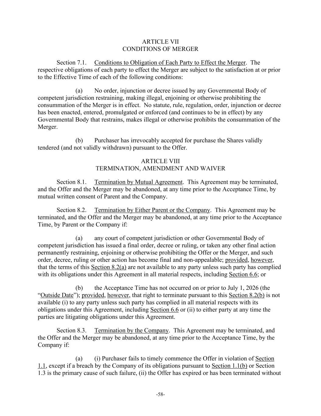 -58- ARTICLE VII CONDITIONS OF MERGER Section 7.1. Conditions to Obligation of Each Party to Effect the Merger. The respective obligations of each party to effect the Merger are subject to the satisfaction at or prior to the Effective Time of each of the following conditions: (a) No order, injunction or decree issued by any Governmental Body of competent jurisdiction restraining, making illegal, enjoining or otherwise prohibiting the consummation of the Merger is in effect. No statute, rule, regulation, order, injunction or decree has been enacted, entered, promulgated or enforced (and continues to be in effect) by any Governmental Body that restrains, makes illegal or otherwise prohibits the consummation of the Merger. (b) Purchaser has irrevocably accepted for purchase the Shares validly tendered (and not validly withdrawn) pursuant to the Offer. ARTICLE VIII TERMINATION, AMENDMENT AND WAIVER Section 8.1. Termination by Mutual Agreement. This Agreement may be terminated, and the Offer and the Merger may be abandoned, at any time prior to the Acceptance Time, by mutual written consent of Parent and the Company. Section 8.2. Termination by Either Parent or the Company. This Agreement may be terminated, and the Offer and the Merger may be abandoned, at any time prior to the Acceptance Time, by Parent or the Company if: (a) any court of competent jurisdiction or other Governmental Body of competent jurisdiction has issued a final order, decree or ruling, or taken any other final action permanently restraining, enjoining or otherwise prohibiting the Offer or the Merger, and such order, decree, ruling or other action has become final and non-appealable; provided, however, that the terms of this Section 8.2(a) are not available to any party unless such party has complied with its obligations under this Agreement in all material respects, including Section 6.6; or (b) the Acceptance Time has not occurred on or prior to July 1, 2026 (the “Outside Date”); provided, however, that right to terminate pursuant to this Section 8.2(b) is not available (i) to any party unless such party has complied in all material respects with its obligations under this Agreement, including Section 6.6 or (ii) to either party at any time the parties are litigating obligations under this Agreement. Section 8.3. Termination by the Company. This Agreement may be terminated, and the Offer and the Merger may be abandoned, at any time prior to the Acceptance Time, by the Company if: (a) (i) Purchaser fails to timely commence the Offer in violation of Section 1.1, except if a breach by the Company of its obligations pursuant to Section 1.1(b) or Section 1.3 is the primary cause of such failure, (ii) the Offer has expired or has been terminated without