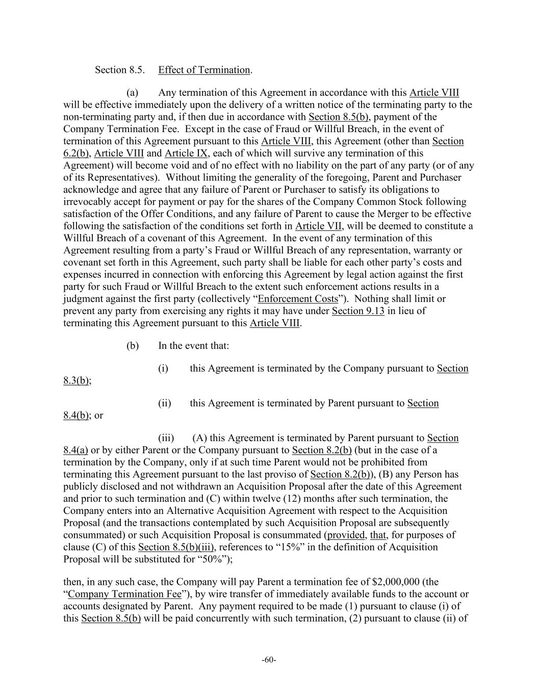 -60- Section 8.5. Effect of Termination. (a) Any termination of this Agreement in accordance with this Article VIII will be effective immediately upon the delivery of a written notice of the terminating party to the non-terminating party and, if then due in accordance with Section 8.5(b), payment of the Company Termination Fee. Except in the case of Fraud or Willful Breach, in the event of termination of this Agreement pursuant to this Article VIII, this Agreement (other than Section 6.2(b), Article VIII and Article IX, each of which will survive any termination of this Agreement) will become void and of no effect with no liability on the part of any party (or of any of its Representatives). Without limiting the generality of the foregoing, Parent and Purchaser acknowledge and agree that any failure of Parent or Purchaser to satisfy its obligations to irrevocably accept for payment or pay for the shares of the Company Common Stock following satisfaction of the Offer Conditions, and any failure of Parent to cause the Merger to be effective following the satisfaction of the conditions set forth in Article VII, will be deemed to constitute a Willful Breach of a covenant of this Agreement. In the event of any termination of this Agreement resulting from a party’s Fraud or Willful Breach of any representation, warranty or covenant set forth in this Agreement, such party shall be liable for each other party’s costs and expenses incurred in connection with enforcing this Agreement by legal action against the first party for such Fraud or Willful Breach to the extent such enforcement actions results in a judgment against the first party (collectively “Enforcement Costs”). Nothing shall limit or prevent any party from exercising any rights it may have under Section 9.13 in lieu of terminating this Agreement pursuant to this Article VIII. (b) In the event that: (i) this Agreement is terminated by the Company pursuant to Section 8.3(b); (ii) this Agreement is terminated by Parent pursuant to Section 8.4(b); or (iii) (A) this Agreement is terminated by Parent pursuant to Section 8.4(a) or by either Parent or the Company pursuant to Section 8.2(b) (but in the case of a termination by the Company, only if at such time Parent would not be prohibited from terminating this Agreement pursuant to the last proviso of Section 8.2(b)), (B) any Person has publicly disclosed and not withdrawn an Acquisition Proposal after the date of this Agreement and prior to such termination and (C) within twelve (12) months after such termination, the Company enters into an Alternative Acquisition Agreement with respect to the Acquisition Proposal (and the transactions contemplated by such Acquisition Proposal are subsequently consummated) or such Acquisition Proposal is consummated (provided, that, for purposes of clause (C) of this Section 8.5(b)(iii), references to “15%” in the definition of Acquisition Proposal will be substituted for “50%”); then, in any such case, the Company will pay Parent a termination fee of $2,000,000 (the “Company Termination Fee”), by wire transfer of immediately available funds to the account or accounts designated by Parent. Any payment required to be made (1) pursuant to clause (i) of this Section 8.5(b) will be paid concurrently with such termination, (2) pursuant to clause (ii) of