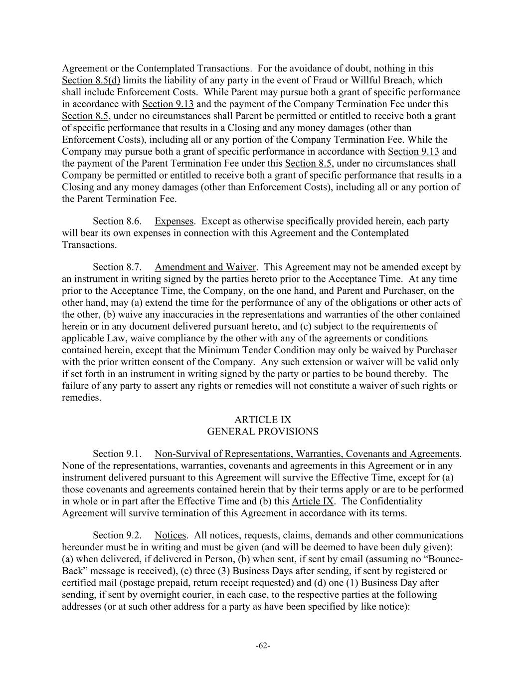 -62- Agreement or the Contemplated Transactions. For the avoidance of doubt, nothing in this Section 8.5(d) limits the liability of any party in the event of Fraud or Willful Breach, which shall include Enforcement Costs. While Parent may pursue both a grant of specific performance in accordance with Section 9.13 and the payment of the Company Termination Fee under this Section 8.5, under no circumstances shall Parent be permitted or entitled to receive both a grant of specific performance that results in a Closing and any money damages (other than Enforcement Costs), including all or any portion of the Company Termination Fee. While the Company may pursue both a grant of specific performance in accordance with Section 9.13 and the payment of the Parent Termination Fee under this Section 8.5, under no circumstances shall Company be permitted or entitled to receive both a grant of specific performance that results in a Closing and any money damages (other than Enforcement Costs), including all or any portion of the Parent Termination Fee. Section 8.6. Expenses. Except as otherwise specifically provided herein, each party will bear its own expenses in connection with this Agreement and the Contemplated Transactions. Section 8.7. Amendment and Waiver. This Agreement may not be amended except by an instrument in writing signed by the parties hereto prior to the Acceptance Time. At any time prior to the Acceptance Time, the Company, on the one hand, and Parent and Purchaser, on the other hand, may (a) extend the time for the performance of any of the obligations or other acts of the other, (b) waive any inaccuracies in the representations and warranties of the other contained herein or in any document delivered pursuant hereto, and (c) subject to the requirements of applicable Law, waive compliance by the other with any of the agreements or conditions contained herein, except that the Minimum Tender Condition may only be waived by Purchaser with the prior written consent of the Company. Any such extension or waiver will be valid only if set forth in an instrument in writing signed by the party or parties to be bound thereby. The failure of any party to assert any rights or remedies will not constitute a waiver of such rights or remedies. ARTICLE IX GENERAL PROVISIONS Section 9.1. Non-Survival of Representations, Warranties, Covenants and Agreements. None of the representations, warranties, covenants and agreements in this Agreement or in any instrument delivered pursuant to this Agreement will survive the Effective Time, except for (a) those covenants and agreements contained herein that by their terms apply or are to be performed in whole or in part after the Effective Time and (b) this Article IX. The Confidentiality Agreement will survive termination of this Agreement in accordance with its terms. Section 9.2. Notices. All notices, requests, claims, demands and other communications hereunder must be in writing and must be given (and will be deemed to have been duly given): (a) when delivered, if delivered in Person, (b) when sent, if sent by email (assuming no “Bounce- Back” message is received), (c) three (3) Business Days after sending, if sent by registered or certified mail (postage prepaid, return receipt requested) and (d) one (1) Business Day after sending, if sent by overnight courier, in each case, to the respective parties at the following addresses (or at such other address for a party as have been specified by like notice):