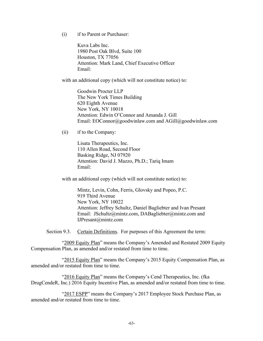 -63- (i) if to Parent or Purchaser: Kuva Labs Inc. 1980 Post Oak Blvd, Suite 100 Houston, TX 77056 Attention: Mark Land, Chief Executive Officer Email: with an additional copy (which will not constitute notice) to: Goodwin Procter LLP The New York Times Building 620 Eighth Avenue New York, NY 10018 Attention: Edwin O’Connor and Amanda J. Gill Email: EOConnor@goodwinlaw.com and AGill@goodwinlaw.com (ii) if to the Company: Lisata Therapeutics, Inc. 110 Allen Road, Second Floor Basking Ridge, NJ 07920 Attention: David J. Mazzo, Ph.D.; Tariq Imam Email: with an additional copy (which will not constitute notice) to: Mintz, Levin, Cohn, Ferris, Glovsky and Popeo, P.C. 919 Third Avenue New York, NY 10022 Attention: Jeffrey Schultz, Daniel Bagliebter and Ivan Presant Email: JSchultz@mintz.com, DABagliebter@mintz.com and IJPresant@mintz.com Section 9.3. Certain Definitions. For purposes of this Agreement the term: “2009 Equity Plan” means the Company’s Amended and Restated 2009 Equity Compensation Plan, as amended and/or restated from time to time. “2015 Equity Plan” means the Company’s 2015 Equity Compensation Plan, as amended and/or restated from time to time. “2016 Equity Plan” means the Company’s Cend Therapeutics, Inc. (fka DrugCendeR, Inc.) 2016 Equity Incentive Plan, as amended and/or restated from time to time. “2017 ESPP” means the Company’s 2017 Employee Stock Purchase Plan, as amended and/or restated from time to time.