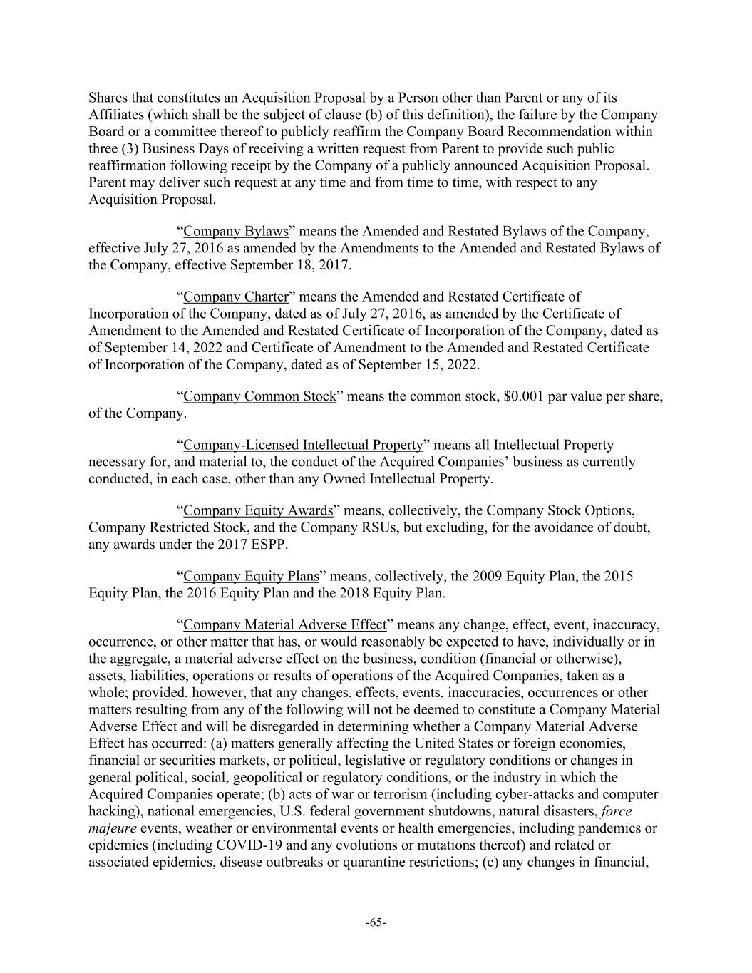 -65- Shares that constitutes an Acquisition Proposal by a Person other than Parent or any of its Affiliates (which shall be the subject of clause (b) of this definition), the failure by the Company Board or a committee thereof to publicly reaffirm the Company Board Recommendation within three (3) Business Days of receiving a written request from Parent to provide such public reaffirmation following receipt by the Company of a publicly announced Acquisition Proposal. Parent may deliver such request at any time and from time to time, with respect to any Acquisition Proposal. “Company Bylaws” means the Amended and Restated Bylaws of the Company, effective July 27, 2016 as amended by the Amendments to the Amended and Restated Bylaws of the Company, effective September 18, 2017. “Company Charter” means the Amended and Restated Certificate of Incorporation of the Company, dated as of July 27, 2016, as amended by the Certificate of Amendment to the Amended and Restated Certificate of Incorporation of the Company, dated as of September 14, 2022 and Certificate of Amendment to the Amended and Restated Certificate of Incorporation of the Company, dated as of September 15, 2022. “Company Common Stock” means the common stock, $0.001 par value per share, of the Company. “Company-Licensed Intellectual Property” means all Intellectual Property necessary for, and material to, the conduct of the Acquired Companies’ business as currently conducted, in each case, other than any Owned Intellectual Property. “Company Equity Awards” means, collectively, the Company Stock Options, Company Restricted Stock, and the Company RSUs, but excluding, for the avoidance of doubt, any awards under the 2017 ESPP. “Company Equity Plans” means, collectively, the 2009 Equity Plan, the 2015 Equity Plan, the 2016 Equity Plan and the 2018 Equity Plan. “Company Material Adverse Effect” means any change, effect, event, inaccuracy, occurrence, or other matter that has, or would reasonably be expected to have, individually or in the aggregate, a material adverse effect on the business, condition (financial or otherwise), assets, liabilities, operations or results of operations of the Acquired Companies, taken as a whole; provided, however, that any changes, effects, events, inaccuracies, occurrences or other matters resulting from any of the following will not be deemed to constitute a Company Material Adverse Effect and will be disregarded in determining whether a Company Material Adverse Effect has occurred: (a) matters generally affecting the United States or foreign economies, financial or securities markets, or political, legislative or regulatory conditions or changes in general political, social, geopolitical or regulatory conditions, or the industry in which the Acquired Companies operate; (b) acts of war or terrorism (including cyber-attacks and computer hacking), national emergencies, U.S. federal government shutdowns, natural disasters, force majeure events, weather or environmental events or health emergencies, including pandemics or epidemics (including COVID-19 and any evolutions or mutations thereof) and related or associated epidemics, disease outbreaks or quarantine restrictions; (c) any changes in financial,
