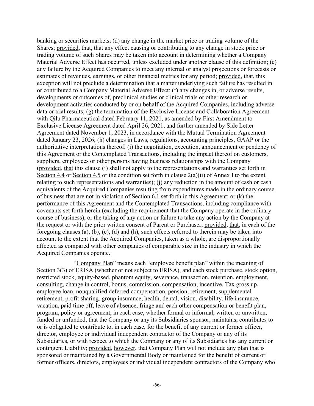 -66- banking or securities markets; (d) any change in the market price or trading volume of the Shares; provided, that, that any effect causing or contributing to any change in stock price or trading volume of such Shares may be taken into account in determining whether a Company Material Adverse Effect has occurred, unless excluded under another clause of this definition; (e) any failure by the Acquired Companies to meet any internal or analyst projections or forecasts or estimates of revenues, earnings, or other financial metrics for any period; provided, that, this exception will not preclude a determination that a matter underlying such failure has resulted in or contributed to a Company Material Adverse Effect; (f) any changes in, or adverse results, developments or outcomes of, preclinical studies or clinical trials or other research or development activities conducted by or on behalf of the Acquired Companies, including adverse data or trial results; (g) the termination of the Exclusive License and Collaboration Agreement with Qilu Pharmaceutical dated February 11, 2021, as amended by First Amendment to Exclusive License Agreement dated April 26, 2021, and further amended by Side Letter Agreement dated November 1, 2023, in accordance with the Mutual Termination Agreement dated January 23, 2026; (h) changes in Laws, regulations, accounting principles, GAAP or the authoritative interpretations thereof; (i) the negotiation, execution, announcement or pendency of this Agreement or the Contemplated Transactions, including the impact thereof on customers, suppliers, employees or other persons having business relationships with the Company (provided, that this clause (i) shall not apply to the representations and warranties set forth in Section 4.4 or Section 4.5 or the condition set forth in clause 2(a)(ii) of Annex I to the extent relating to such representations and warranties); (j) any reduction in the amount of cash or cash equivalents of the Acquired Companies resulting from expenditures made in the ordinary course of business that are not in violation of Section 6.1 set forth in this Agreement; or (k) the performance of this Agreement and the Contemplated Transactions, including compliance with covenants set forth herein (excluding the requirement that the Company operate in the ordinary course of business), or the taking of any action or failure to take any action by the Company at the request or with the prior written consent of Parent or Purchaser; provided, that, in each of the foregoing clauses (a), (b), (c), (d) and (h), such effects referred to therein may be taken into account to the extent that the Acquired Companies, taken as a whole, are disproportionally affected as compared with other companies of comparable size in the industry in which the Acquired Companies operate. “Company Plan” means each “employee benefit plan” within the meaning of Section 3(3) of ERISA (whether or not subject to ERISA), and each stock purchase, stock option, restricted stock, equity-based, phantom equity, severance, transaction, retention, employment, consulting, change in control, bonus, commission, compensation, incentive, Tax gross up, employee loan, nonqualified deferred compensation, pension, retirement, supplemental retirement, profit sharing, group insurance, health, dental, vision, disability, life insurance, vacation, paid time off, leave of absence, fringe and each other compensation or benefit plan, program, policy or agreement, in each case, whether formal or informal, written or unwritten, funded or unfunded, that the Company or any its Subsidiaries sponsor, maintains, contributes to or is obligated to contribute to, in each case, for the benefit of any current or former officer, director, employee or individual independent contractor of the Company or any of its Subsidiaries, or with respect to which the Company or any of its Subsidiaries has any current or contingent Liability; provided, however, that Company Plan will not include any plan that is sponsored or maintained by a Governmental Body or maintained for the benefit of current or former officers, directors, employees or individual independent contractors of the Company who