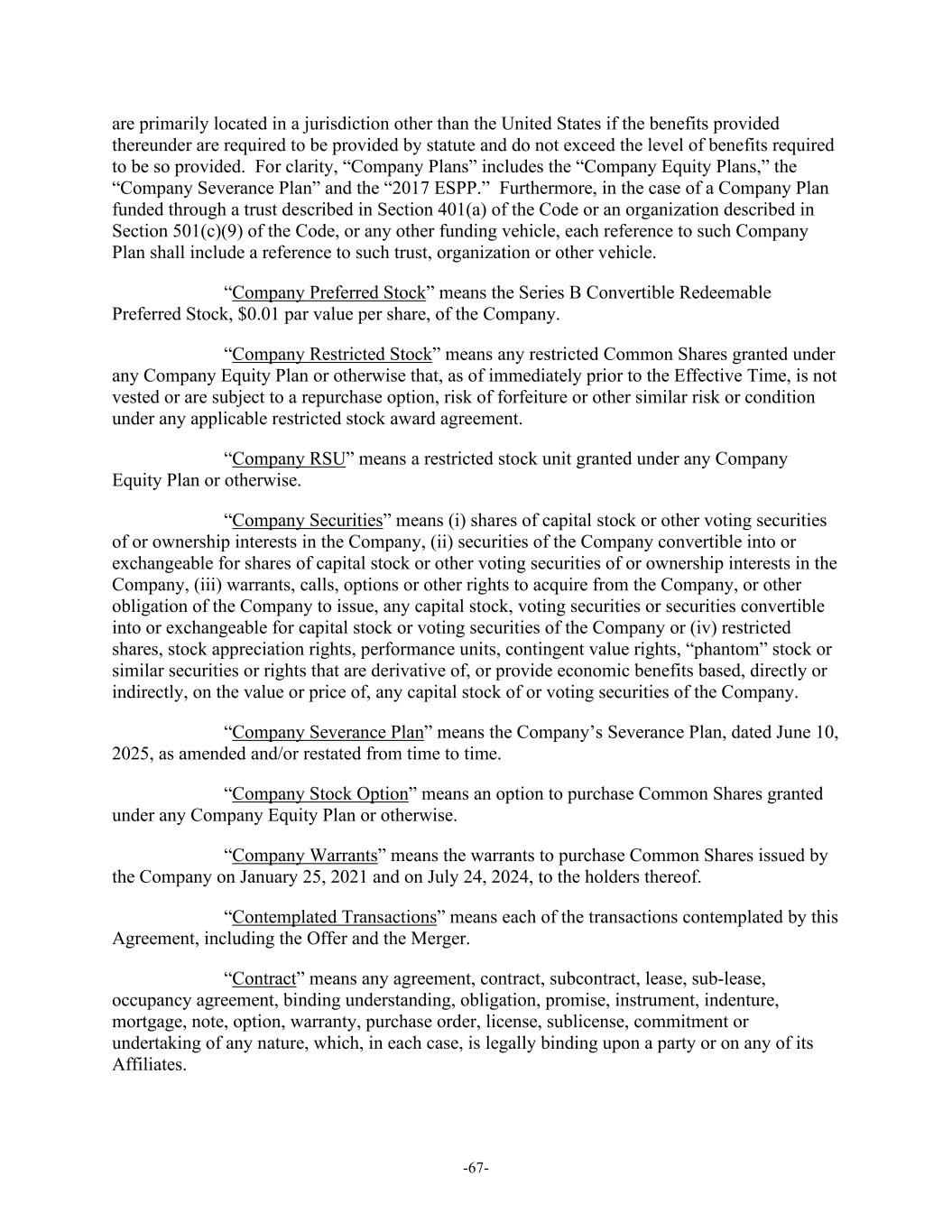 -67- are primarily located in a jurisdiction other than the United States if the benefits provided thereunder are required to be provided by statute and do not exceed the level of benefits required to be so provided. For clarity, “Company Plans” includes the “Company Equity Plans,” the “Company Severance Plan” and the “2017 ESPP.” Furthermore, in the case of a Company Plan funded through a trust described in Section 401(a) of the Code or an organization described in Section 501(c)(9) of the Code, or any other funding vehicle, each reference to such Company Plan shall include a reference to such trust, organization or other vehicle. “Company Preferred Stock” means the Series B Convertible Redeemable Preferred Stock, $0.01 par value per share, of the Company. “Company Restricted Stock” means any restricted Common Shares granted under any Company Equity Plan or otherwise that, as of immediately prior to the Effective Time, is not vested or are subject to a repurchase option, risk of forfeiture or other similar risk or condition under any applicable restricted stock award agreement. “Company RSU” means a restricted stock unit granted under any Company Equity Plan or otherwise. “Company Securities” means (i) shares of capital stock or other voting securities of or ownership interests in the Company, (ii) securities of the Company convertible into or exchangeable for shares of capital stock or other voting securities of or ownership interests in the Company, (iii) warrants, calls, options or other rights to acquire from the Company, or other obligation of the Company to issue, any capital stock, voting securities or securities convertible into or exchangeable for capital stock or voting securities of the Company or (iv) restricted shares, stock appreciation rights, performance units, contingent value rights, “phantom” stock or similar securities or rights that are derivative of, or provide economic benefits based, directly or indirectly, on the value or price of, any capital stock of or voting securities of the Company. “Company Severance Plan” means the Company’s Severance Plan, dated June 10, 2025, as amended and/or restated from time to time. “Company Stock Option” means an option to purchase Common Shares granted under any Company Equity Plan or otherwise. “Company Warrants” means the warrants to purchase Common Shares issued by the Company on January 25, 2021 and on July 24, 2024, to the holders thereof. “Contemplated Transactions” means each of the transactions contemplated by this Agreement, including the Offer and the Merger. “Contract” means any agreement, contract, subcontract, lease, sub-lease, occupancy agreement, binding understanding, obligation, promise, instrument, indenture, mortgage, note, option, warranty, purchase order, license, sublicense, commitment or undertaking of any nature, which, in each case, is legally binding upon a party or on any of its Affiliates.