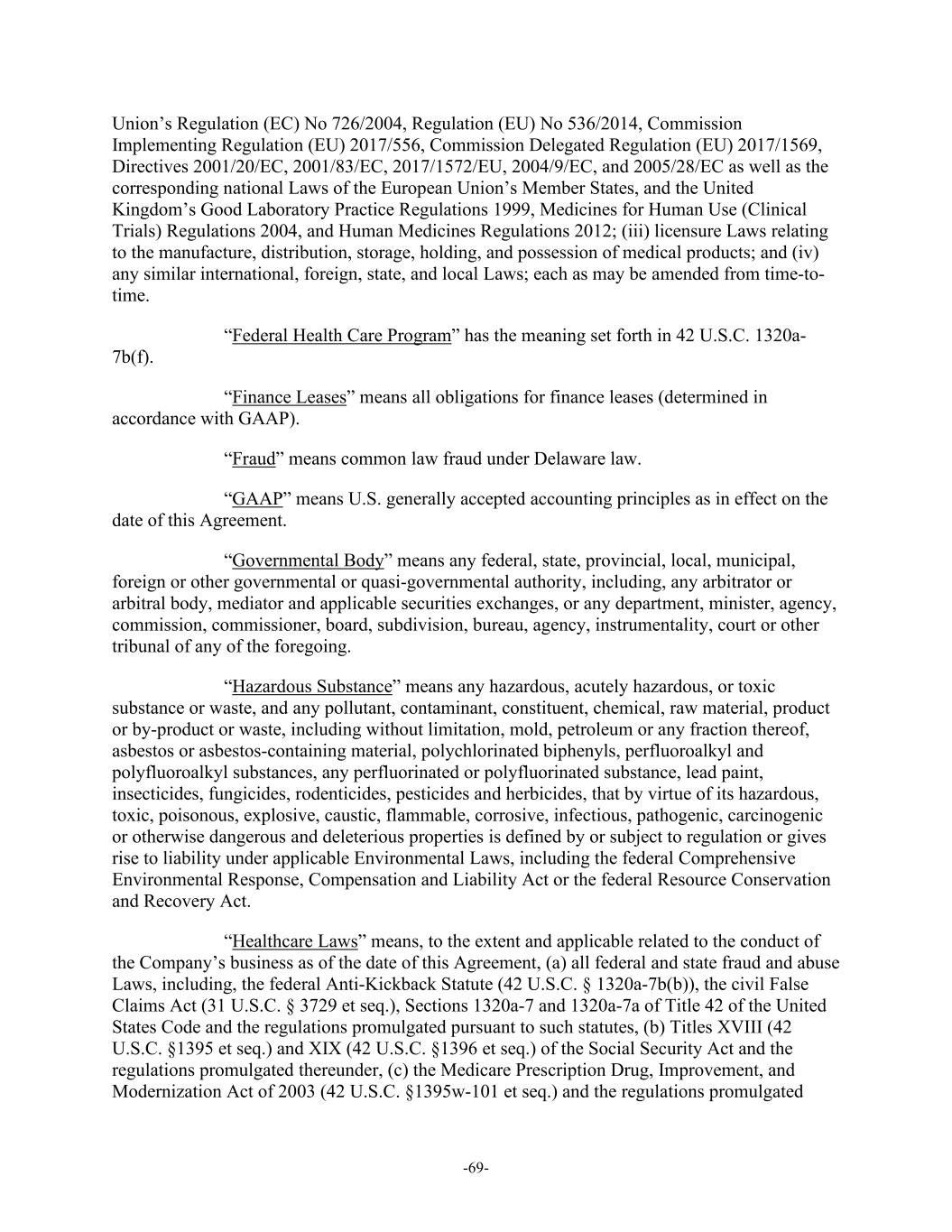 -69- Union’s Regulation (EC) No 726/2004, Regulation (EU) No 536/2014, Commission Implementing Regulation (EU) 2017/556, Commission Delegated Regulation (EU) 2017/1569, Directives 2001/20/EC, 2001/83/EC, 2017/1572/EU, 2004/9/EC, and 2005/28/EC as well as the corresponding national Laws of the European Union’s Member States, and the United Kingdom’s Good Laboratory Practice Regulations 1999, Medicines for Human Use (Clinical Trials) Regulations 2004, and Human Medicines Regulations 2012; (iii) licensure Laws relating to the manufacture, distribution, storage, holding, and possession of medical products; and (iv) any similar international, foreign, state, and local Laws; each as may be amended from time-to- time. “Federal Health Care Program” has the meaning set forth in 42 U.S.C. 1320a- 7b(f). “Finance Leases” means all obligations for finance leases (determined in accordance with GAAP). “Fraud” means common law fraud under Delaware law. “GAAP” means U.S. generally accepted accounting principles as in effect on the date of this Agreement. “Governmental Body” means any federal, state, provincial, local, municipal, foreign or other governmental or quasi-governmental authority, including, any arbitrator or arbitral body, mediator and applicable securities exchanges, or any department, minister, agency, commission, commissioner, board, subdivision, bureau, agency, instrumentality, court or other tribunal of any of the foregoing. “Hazardous Substance” means any hazardous, acutely hazardous, or toxic substance or waste, and any pollutant, contaminant, constituent, chemical, raw material, product or by-product or waste, including without limitation, mold, petroleum or any fraction thereof, asbestos or asbestos-containing material, polychlorinated biphenyls, perfluoroalkyl and polyfluoroalkyl substances, any perfluorinated or polyfluorinated substance, lead paint, insecticides, fungicides, rodenticides, pesticides and herbicides, that by virtue of its hazardous, toxic, poisonous, explosive, caustic, flammable, corrosive, infectious, pathogenic, carcinogenic or otherwise dangerous and deleterious properties is defined by or subject to regulation or gives rise to liability under applicable Environmental Laws, including the federal Comprehensive Environmental Response, Compensation and Liability Act or the federal Resource Conservation and Recovery Act. “Healthcare Laws” means, to the extent and applicable related to the conduct of the Company’s business as of the date of this Agreement, (a) all federal and state fraud and abuse Laws, including, the federal Anti-Kickback Statute (42 U.S.C. § 1320a-7b(b)), the civil False Claims Act (31 U.S.C. § 3729 et seq.), Sections 1320a-7 and 1320a-7a of Title 42 of the United States Code and the regulations promulgated pursuant to such statutes, (b) Titles XVIII (42 U.S.C. §1395 et seq.) and XIX (42 U.S.C. §1396 et seq.) of the Social Security Act and the regulations promulgated thereunder, (c) the Medicare Prescription Drug, Improvement, and Modernization Act of 2003 (42 U.S.C. §1395w-101 et seq.) and the regulations promulgated