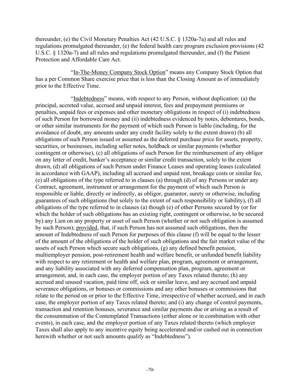 -70- thereunder, (e) the Civil Monetary Penalties Act (42 U.S.C. § 1320a-7a) and all rules and regulations promulgated thereunder, (e) the federal health care program exclusion provisions (42 U.S.C. § 1320a-7) and all rules and regulations promulgated thereunder, and (f) the Patient Protection and Affordable Care Act. “In-The-Money Company Stock Option” means any Company Stock Option that has a per Common Share exercise price that is less than the Closing Amount as of immediately prior to the Effective Time. “Indebtedness” means, with respect to any Person, without duplication: (a) the principal, accreted value, accrued and unpaid interest, fees and prepayment premiums or penalties, unpaid fees or expenses and other monetary obligations in respect of (i) indebtedness of such Person for borrowed money and (ii) indebtedness evidenced by notes, debentures, bonds, or other similar instruments for the payment of which such Person is liable (including, for the avoidance of doubt, any amounts under any credit facility solely to the extent drawn) (b) all obligations of such Person issued or assumed as the deferred purchase price for assets, property, securities, or businesses, including seller notes, holdback or similar payments (whether contingent or otherwise), (c) all obligations of such Person for the reimbursement of any obligor on any letter of credit, banker’s acceptance or similar credit transaction, solely to the extent drawn, (d) all obligations of such Person under Finance Leases and operating leases (calculated in accordance with GAAP), including all accrued and unpaid rent, breakage costs or similar fee, (e) all obligations of the type referred to in clauses (a) through (d) of any Persons or under any Contract, agreement, instrument or arrangement for the payment of which such Person is responsible or liable, directly or indirectly, as obligor, guarantor, surety or otherwise, including guarantees of such obligations (but solely to the extent of such responsibility or liability), (f) all obligations of the type referred to in clauses (a) though (e) of other Persons secured by (or for which the holder of such obligations has an existing right, contingent or otherwise, to be secured by) any Lien on any property or asset of such Person (whether or not such obligation is assumed by such Person); provided, that, if such Person has not assumed such obligations, then the amount of Indebtedness of such Person for purposes of this clause (f) will be equal to the lesser of the amount of the obligations of the holder of such obligations and the fair market value of the assets of such Person which secure such obligations, (g) any defined benefit pension, multiemployer pension, post-retirement health and welfare benefit, or unfunded benefit liability with respect to any retirement or health and welfare plan, program, agreement or arrangement, and any liability associated with any deferred compensation plan, program, agreement or arrangement, and, in each case, the employer portion of any Taxes related thereto; (h) any accrued and unused vacation, paid time off, sick or similar leave, and any accrued and unpaid severance obligations, or bonuses or commissions and any other bonuses or commissions that relate to the period on or prior to the Effective Time, irrespective of whether accrued, and in each case, the employer portion of any Taxes related thereto; and (i) any change of control payments, transaction and retention bonuses, severance and similar payments due or arising as a result of the consummation of the Contemplated Transactions (either alone or in combination with other events), in each case, and the employer portion of any Taxes related thereto (which employer Taxes shall also apply to any incentive equity being accelerated and/or cashed out in connection herewith whether or not such amounts qualify as “Indebtedness”).