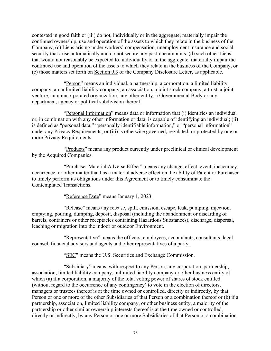 -73- contested in good faith or (iii) do not, individually or in the aggregate, materially impair the continued ownership, use and operation of the assets to which they relate in the business of the Company, (c) Liens arising under workers’ compensation, unemployment insurance and social security that arise automatically and do not secure any past-due amounts, (d) such other Liens that would not reasonably be expected to, individually or in the aggregate, materially impair the continued use and operation of the assets to which they relate in the business of the Company, or (e) those matters set forth on Section 9.3 of the Company Disclosure Letter, as applicable. “Person” means an individual, a partnership, a corporation, a limited liability company, an unlimited liability company, an association, a joint stock company, a trust, a joint venture, an unincorporated organization, any other entity, a Governmental Body or any department, agency or political subdivision thereof. “Personal Information” means data or information that (i) identifies an individual or, in combination with any other information or data, is capable of identifying an individual; (ii) is defined as “personal data,” “personally identifiable information,” or “personal information” under any Privacy Requirements; or (iii) is otherwise governed, regulated, or protected by one or more Privacy Requirements. “Products” means any product currently under preclinical or clinical development by the Acquired Companies. “Purchaser Material Adverse Effect” means any change, effect, event, inaccuracy, occurrence, or other matter that has a material adverse effect on the ability of Parent or Purchaser to timely perform its obligations under this Agreement or to timely consummate the Contemplated Transactions. “Reference Date” means January 1, 2023. “Release” means any release, spill, emission, escape, leak, pumping, injection, emptying, pouring, dumping, deposit, disposal (including the abandonment or discarding of barrels, containers or other receptacles containing Hazardous Substances), discharge, dispersal, leaching or migration into the indoor or outdoor Environment. “Representative” means the officers, employees, accountants, consultants, legal counsel, financial advisors and agents and other representatives of a party. “SEC” means the U.S. Securities and Exchange Commission. “Subsidiary” means, with respect to any Person, any corporation, partnership, association, limited liability company, unlimited liability company or other business entity of which (a) if a corporation, a majority of the total voting power of shares of stock entitled (without regard to the occurrence of any contingency) to vote in the election of directors, managers or trustees thereof is at the time owned or controlled, directly or indirectly, by that Person or one or more of the other Subsidiaries of that Person or a combination thereof or (b) if a partnership, association, limited liability company, or other business entity, a majority of the partnership or other similar ownership interests thereof is at the time owned or controlled, directly or indirectly, by any Person or one or more Subsidiaries of that Person or a combination