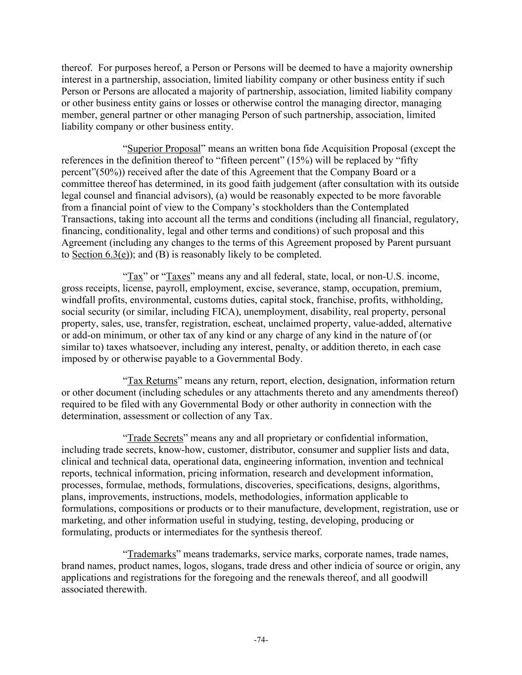 -74- thereof. For purposes hereof, a Person or Persons will be deemed to have a majority ownership interest in a partnership, association, limited liability company or other business entity if such Person or Persons are allocated a majority of partnership, association, limited liability company or other business entity gains or losses or otherwise control the managing director, managing member, general partner or other managing Person of such partnership, association, limited liability company or other business entity. “Superior Proposal” means an written bona fide Acquisition Proposal (except the references in the definition thereof to “fifteen percent” (15%) will be replaced by “fifty percent”(50%)) received after the date of this Agreement that the Company Board or a committee thereof has determined, in its good faith judgement (after consultation with its outside legal counsel and financial advisors), (a) would be reasonably expected to be more favorable from a financial point of view to the Company’s stockholders than the Contemplated Transactions, taking into account all the terms and conditions (including all financial, regulatory, financing, conditionality, legal and other terms and conditions) of such proposal and this Agreement (including any changes to the terms of this Agreement proposed by Parent pursuant to Section 6.3(e)); and (B) is reasonably likely to be completed. “Tax” or “Taxes” means any and all federal, state, local, or non-U.S. income, gross receipts, license, payroll, employment, excise, severance, stamp, occupation, premium, windfall profits, environmental, customs duties, capital stock, franchise, profits, withholding, social security (or similar, including FICA), unemployment, disability, real property, personal property, sales, use, transfer, registration, escheat, unclaimed property, value-added, alternative or add-on minimum, or other tax of any kind or any charge of any kind in the nature of (or similar to) taxes whatsoever, including any interest, penalty, or addition thereto, in each case imposed by or otherwise payable to a Governmental Body. “Tax Returns” means any return, report, election, designation, information return or other document (including schedules or any attachments thereto and any amendments thereof) required to be filed with any Governmental Body or other authority in connection with the determination, assessment or collection of any Tax. “Trade Secrets” means any and all proprietary or confidential information, including trade secrets, know-how, customer, distributor, consumer and supplier lists and data, clinical and technical data, operational data, engineering information, invention and technical reports, technical information, pricing information, research and development information, processes, formulae, methods, formulations, discoveries, specifications, designs, algorithms, plans, improvements, instructions, models, methodologies, information applicable to formulations, compositions or products or to their manufacture, development, registration, use or marketing, and other information useful in studying, testing, developing, producing or formulating, products or intermediates for the synthesis thereof. “Trademarks” means trademarks, service marks, corporate names, trade names, brand names, product names, logos, slogans, trade dress and other indicia of source or origin, any applications and registrations for the foregoing and the renewals thereof, and all goodwill associated therewith.