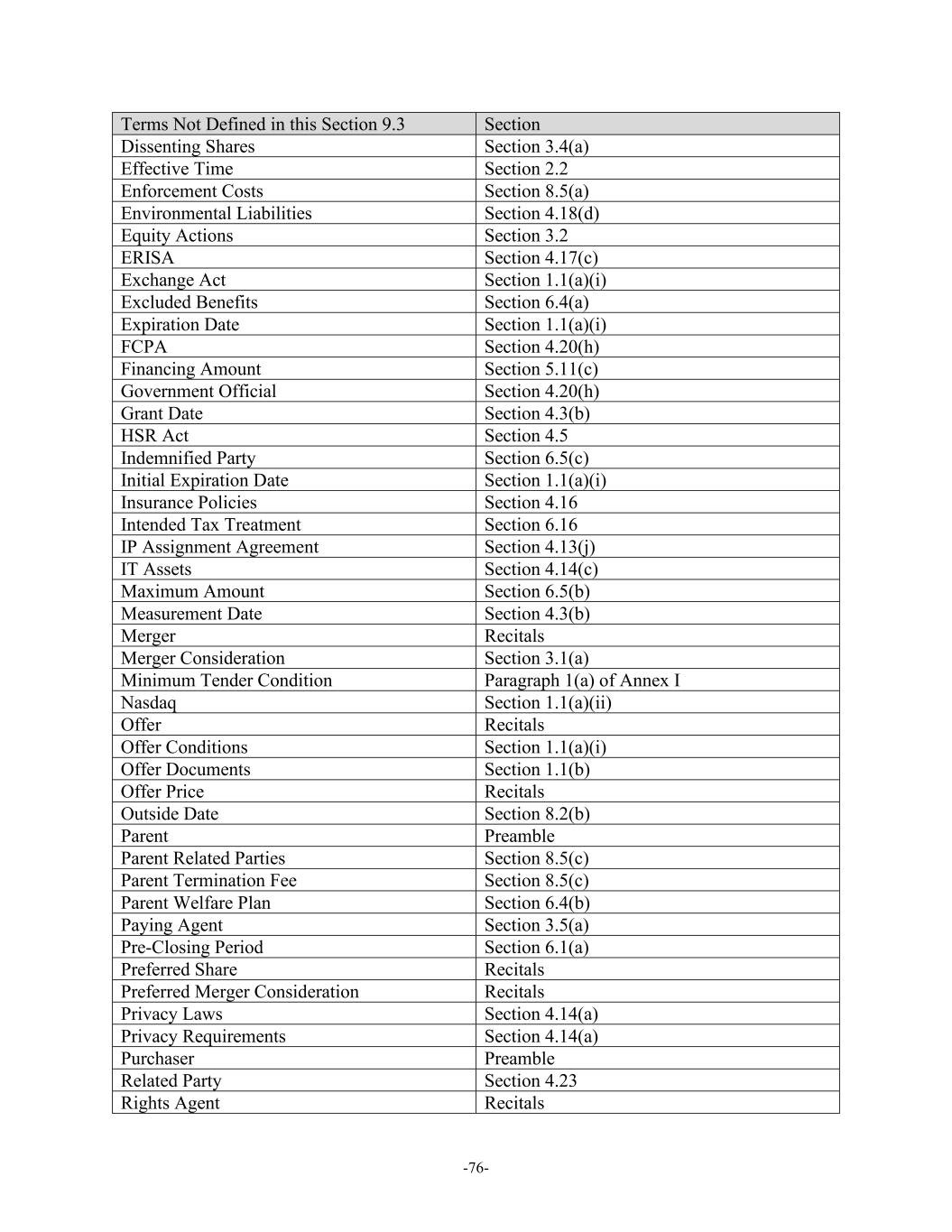 -76- Terms Not Defined in this Section 9.3 Section Dissenting Shares Section 3.4(a) Effective Time Section 2.2 Enforcement Costs Section 8.5(a) Environmental Liabilities Section 4.18(d) Equity Actions Section 3.2 ERISA Section 4.17(c) Exchange Act Section 1.1(a)(i) Excluded Benefits Section 6.4(a) Expiration Date Section 1.1(a)(i) FCPA Section 4.20(h) Financing Amount Section 5.11(c) Government Official Section 4.20(h) Grant Date Section 4.3(b) HSR Act Section 4.5 Indemnified Party Section 6.5(c) Initial Expiration Date Section 1.1(a)(i) Insurance Policies Section 4.16 Intended Tax Treatment Section 6.16 IP Assignment Agreement Section 4.13(j) IT Assets Section 4.14(c) Maximum Amount Section 6.5(b) Measurement Date Section 4.3(b) Merger Recitals Merger Consideration Section 3.1(a) Minimum Tender Condition Paragraph 1(a) of Annex I Nasdaq Section 1.1(a)(ii) Offer Recitals Offer Conditions Section 1.1(a)(i) Offer Documents Section 1.1(b) Offer Price Recitals Outside Date Section 8.2(b) Parent Preamble Parent Related Parties Section 8.5(c) Parent Termination Fee Section 8.5(c) Parent Welfare Plan Section 6.4(b) Paying Agent Section 3.5(a) Pre-Closing Period Section 6.1(a) Preferred Share Recitals Preferred Merger Consideration Recitals Privacy Laws Section 4.14(a) Privacy Requirements Section 4.14(a) Purchaser Preamble Related Party Section 4.23 Rights Agent Recitals