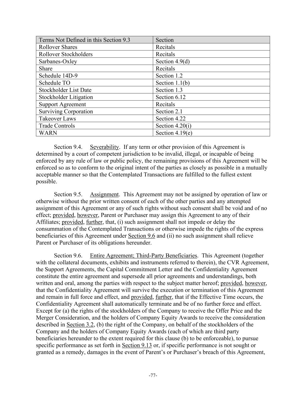 -77- Terms Not Defined in this Section 9.3 Section Rollover Shares Recitals Rollover Stockholders Recitals Sarbanes-Oxley Section 4.9(d) Share Recitals Schedule 14D-9 Section 1.2 Schedule TO Section 1.1(b) Stockholder List Date Section 1.3 Stockholder Litigation Section 6.12 Support Agreement Recitals Surviving Corporation Section 2.1 Takeover Laws Section 4.22 Trade Controls Section 4.20(i) WARN Section 4.19(e) Section 9.4. Severability. If any term or other provision of this Agreement is determined by a court of competent jurisdiction to be invalid, illegal, or incapable of being enforced by any rule of law or public policy, the remaining provisions of this Agreement will be enforced so as to conform to the original intent of the parties as closely as possible in a mutually acceptable manner so that the Contemplated Transactions are fulfilled to the fullest extent possible. Section 9.5. Assignment. This Agreement may not be assigned by operation of law or otherwise without the prior written consent of each of the other parties and any attempted assignment of this Agreement or any of such rights without such consent shall be void and of no effect; provided, however, Parent or Purchaser may assign this Agreement to any of their Affiliates; provided, further, that, (i) such assignment shall not impede or delay the consummation of the Contemplated Transactions or otherwise impede the rights of the express beneficiaries of this Agreement under Section 9.6 and (ii) no such assignment shall relieve Parent or Purchaser of its obligations hereunder. Section 9.6. Entire Agreement; Third-Party Beneficiaries. This Agreement (together with the collateral documents, exhibits and instruments referred to therein), the CVR Agreement, the Support Agreements, the Capital Commitment Letter and the Confidentiality Agreement constitute the entire agreement and supersede all prior agreements and understandings, both written and oral, among the parties with respect to the subject matter hereof; provided, however, that the Confidentiality Agreement will survive the execution or termination of this Agreement and remain in full force and effect, and provided, further, that if the Effective Time occurs, the Confidentiality Agreement shall automatically terminate and be of no further force and effect. Except for (a) the rights of the stockholders of the Company to receive the Offer Price and the Merger Consideration, and the holders of Company Equity Awards to receive the consideration described in Section 3.2, (b) the right of the Company, on behalf of the stockholders of the Company and the holders of Company Equity Awards (each of which are third party beneficiaries hereunder to the extent required for this clause (b) to be enforceable), to pursue specific performance as set forth in Section 9.13 or, if specific performance is not sought or granted as a remedy, damages in the event of Parent’s or Purchaser’s breach of this Agreement,