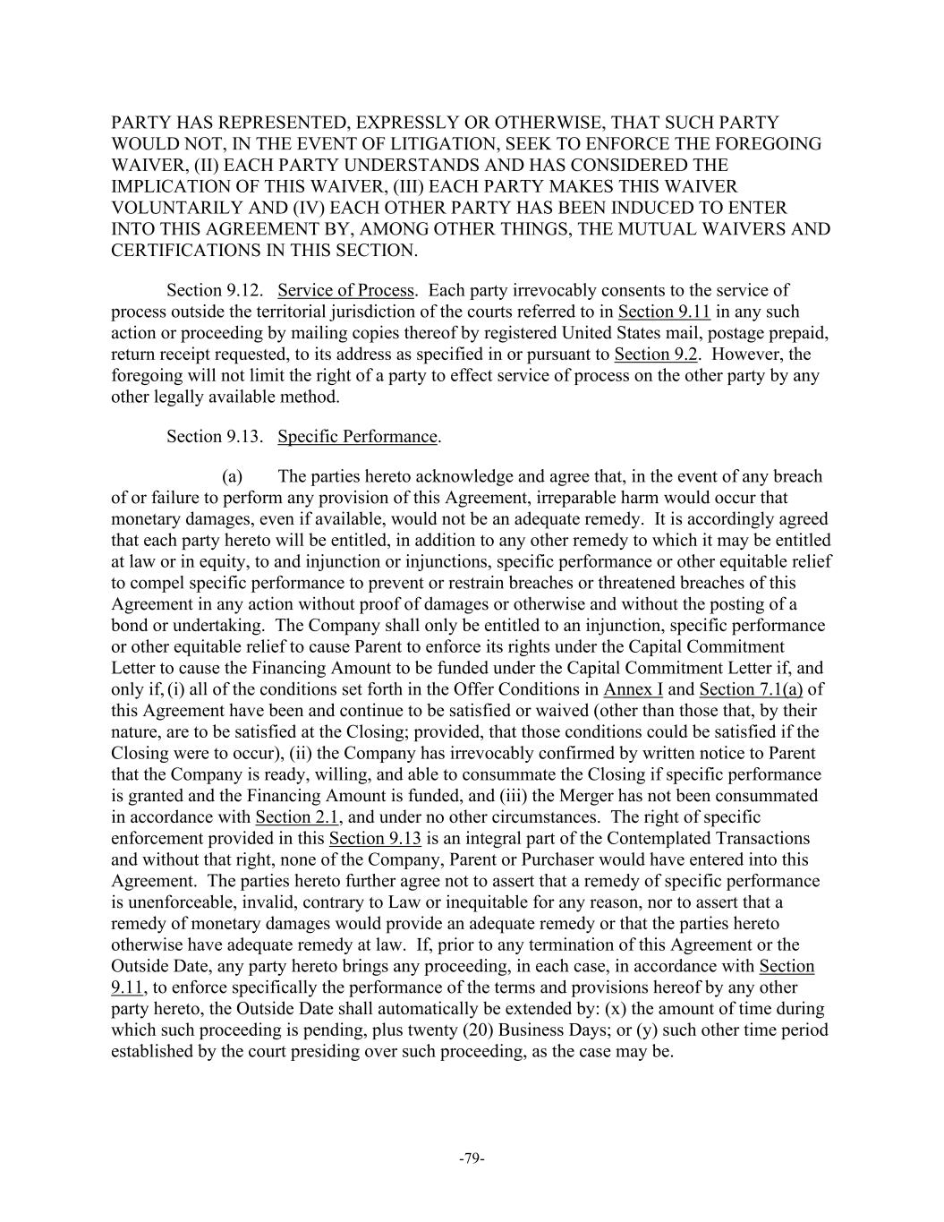 -79- PARTY HAS REPRESENTED, EXPRESSLY OR OTHERWISE, THAT SUCH PARTY WOULD NOT, IN THE EVENT OF LITIGATION, SEEK TO ENFORCE THE FOREGOING WAIVER, (II) EACH PARTY UNDERSTANDS AND HAS CONSIDERED THE IMPLICATION OF THIS WAIVER, (III) EACH PARTY MAKES THIS WAIVER VOLUNTARILY AND (IV) EACH OTHER PARTY HAS BEEN INDUCED TO ENTER INTO THIS AGREEMENT BY, AMONG OTHER THINGS, THE MUTUAL WAIVERS AND CERTIFICATIONS IN THIS SECTION. Section 9.12. Service of Process. Each party irrevocably consents to the service of process outside the territorial jurisdiction of the courts referred to in Section 9.11 in any such action or proceeding by mailing copies thereof by registered United States mail, postage prepaid, return receipt requested, to its address as specified in or pursuant to Section 9.2. However, the foregoing will not limit the right of a party to effect service of process on the other party by any other legally available method. Section 9.13. Specific Performance. (a) The parties hereto acknowledge and agree that, in the event of any breach of or failure to perform any provision of this Agreement, irreparable harm would occur that monetary damages, even if available, would not be an adequate remedy. It is accordingly agreed that each party hereto will be entitled, in addition to any other remedy to which it may be entitled at law or in equity, to and injunction or injunctions, specific performance or other equitable relief to compel specific performance to prevent or restrain breaches or threatened breaches of this Agreement in any action without proof of damages or otherwise and without the posting of a bond or undertaking. The Company shall only be entitled to an injunction, specific performance or other equitable relief to cause Parent to enforce its rights under the Capital Commitment Letter to cause the Financing Amount to be funded under the Capital Commitment Letter if, and only if, (i) all of the conditions set forth in the Offer Conditions in Annex I and Section 7.1(a) of this Agreement have been and continue to be satisfied or waived (other than those that, by their nature, are to be satisfied at the Closing; provided, that those conditions could be satisfied if the Closing were to occur), (ii) the Company has irrevocably confirmed by written notice to Parent that the Company is ready, willing, and able to consummate the Closing if specific performance is granted and the Financing Amount is funded, and (iii) the Merger has not been consummated in accordance with Section 2.1, and under no other circumstances. The right of specific enforcement provided in this Section 9.13 is an integral part of the Contemplated Transactions and without that right, none of the Company, Parent or Purchaser would have entered into this Agreement. The parties hereto further agree not to assert that a remedy of specific performance is unenforceable, invalid, contrary to Law or inequitable for any reason, nor to assert that a remedy of monetary damages would provide an adequate remedy or that the parties hereto otherwise have adequate remedy at law. If, prior to any termination of this Agreement or the Outside Date, any party hereto brings any proceeding, in each case, in accordance with Section 9.11, to enforce specifically the performance of the terms and provisions hereof by any other party hereto, the Outside Date shall automatically be extended by: (x) the amount of time during which such proceeding is pending, plus twenty (20) Business Days; or (y) such other time period established by the court presiding over such proceeding, as the case may be.