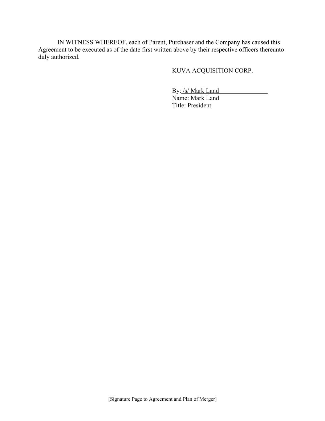 [Signature Page to Agreement and Plan of Merger] IN WITNESS WHEREOF, each of Parent, Purchaser and the Company has caused this Agreement to be executed as of the date first written above by their respective officers thereunto duly authorized. KUVA LABS INC. By: /s/ Mark Land _______________ Name: Mark Land Title: Chief Executive Officer
