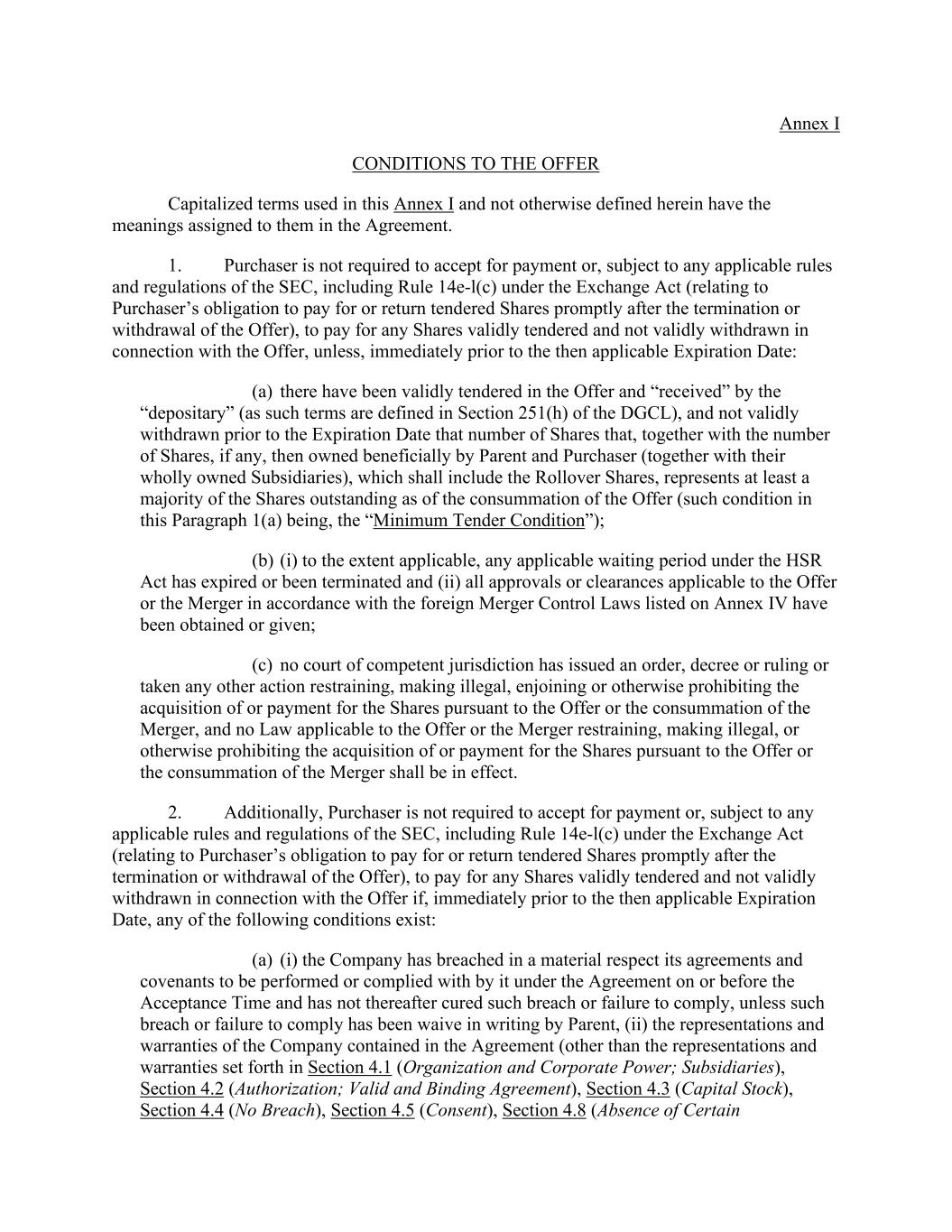 Annex I CONDITIONS TO THE OFFER Capitalized terms used in this Annex I and not otherwise defined herein have the meanings assigned to them in the Agreement. 1. Purchaser is not required to accept for payment or, subject to any applicable rules and regulations of the SEC, including Rule 14e-l(c) under the Exchange Act (relating to Purchaser’s obligation to pay for or return tendered Shares promptly after the termination or withdrawal of the Offer), to pay for any Shares validly tendered and not validly withdrawn in connection with the Offer, unless, immediately prior to the then applicable Expiration Date: (a) there have been validly tendered in the Offer and “received” by the “depositary” (as such terms are defined in Section 251(h) of the DGCL), and not validly withdrawn prior to the Expiration Date that number of Shares that, together with the number of Shares, if any, then owned beneficially by Parent and Purchaser (together with their wholly owned Subsidiaries), which shall include the Rollover Shares, represents at least a majority of the Shares outstanding as of the consummation of the Offer (such condition in this Paragraph 1(a) being, the “Minimum Tender Condition”); (b) (i) to the extent applicable, any applicable waiting period under the HSR Act has expired or been terminated and (ii) all approvals or clearances applicable to the Offer or the Merger in accordance with the foreign Merger Control Laws listed on Annex IV have been obtained or given; (c) no court of competent jurisdiction has issued an order, decree or ruling or taken any other action restraining, making illegal, enjoining or otherwise prohibiting the acquisition of or payment for the Shares pursuant to the Offer or the consummation of the Merger, and no Law applicable to the Offer or the Merger restraining, making illegal, or otherwise prohibiting the acquisition of or payment for the Shares pursuant to the Offer or the consummation of the Merger shall be in effect. 2. Additionally, Purchaser is not required to accept for payment or, subject to any applicable rules and regulations of the SEC, including Rule 14e-l(c) under the Exchange Act (relating to Purchaser’s obligation to pay for or return tendered Shares promptly after the termination or withdrawal of the Offer), to pay for any Shares validly tendered and not validly withdrawn in connection with the Offer if, immediately prior to the then applicable Expiration Date, any of the following conditions exist: (a) (i) the Company has breached in a material respect its agreements and covenants to be performed or complied with by it under the Agreement on or before the Acceptance Time and has not thereafter cured such breach or failure to comply, unless such breach or failure to comply has been waive in writing by Parent, (ii) the representations and warranties of the Company contained in the Agreement (other than the representations and warranties set forth in Section 4.1 (Organization and Corporate Power; Subsidiaries), Section 4.2 (Authorization; Valid and Binding Agreement), Section 4.3 (Capital Stock), Section 4.4 (No Breach), Section 4.5 (Consent), Section 4.8 (Absence of Certain