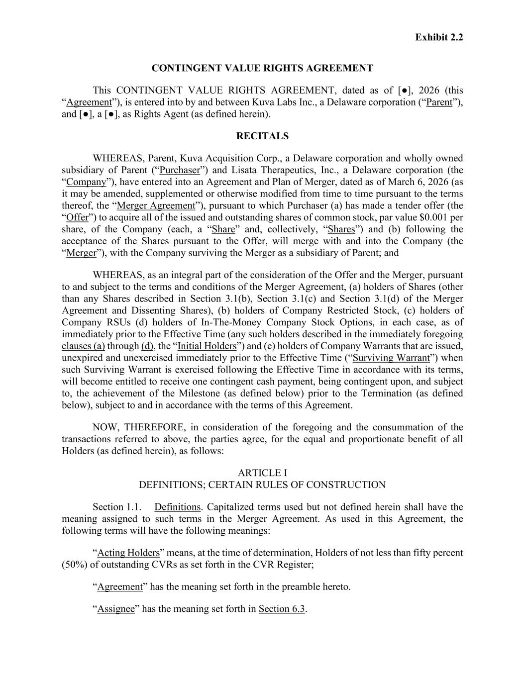 Exhibit 2.2 CONTINGENT VALUE RIGHTS AGREEMENT This CONTINGENT VALUE RIGHTS AGREEMENT, dated as of [●], 2026 (this “Agreement”), is entered into by and between Kuva Labs Inc., a Delaware corporation (“Parent”), and [●], a [●], as Rights Agent (as defined herein). RECITALS WHEREAS, Parent, Kuva Acquisition Corp., a Delaware corporation and wholly owned subsidiary of Parent (“Purchaser”) and Lisata Therapeutics, Inc., a Delaware corporation (the “Company”), have entered into an Agreement and Plan of Merger, dated as of March 6, 2026 (as it may be amended, supplemented or otherwise modified from time to time pursuant to the terms thereof, the “Merger Agreement”), pursuant to which Purchaser (a) has made a tender offer (the “Offer”) to acquire all of the issued and outstanding shares of common stock, par value $0.001 per share, of the Company (each, a “Share” and, collectively, “Shares”) and (b) following the acceptance of the Shares pursuant to the Offer, will merge with and into the Company (the “Merger”), with the Company surviving the Merger as a subsidiary of Parent; and WHEREAS, as an integral part of the consideration of the Offer and the Merger, pursuant to and subject to the terms and conditions of the Merger Agreement, (a) holders of Shares (other than any Shares described in Section 3.1(b), Section 3.1(c) and Section 3.1(d) of the Merger Agreement and Dissenting Shares), (b) holders of Company Restricted Stock, (c) holders of Company RSUs (d) holders of In-The-Money Company Stock Options, in each case, as of immediately prior to the Effective Time (any such holders described in the immediately foregoing clauses (a) through (d), the “Initial Holders”) and (e) holders of Company Warrants that are issued, unexpired and unexercised immediately prior to the Effective Time (“Surviving Warrant”) when such Surviving Warrant is exercised following the Effective Time in accordance with its terms, will become entitled to receive one contingent cash payment, being contingent upon, and subject to, the achievement of the Milestone (as defined below) prior to the Termination (as defined below), subject to and in accordance with the terms of this Agreement. NOW, THEREFORE, in consideration of the foregoing and the consummation of the transactions referred to above, the parties agree, for the equal and proportionate benefit of all Holders (as defined herein), as follows: ARTICLE I DEFINITIONS; CERTAIN RULES OF CONSTRUCTION Section 1.1. Definitions. Capitalized terms used but not defined herein shall have the meaning assigned to such terms in the Merger Agreement. As used in this Agreement, the following terms will have the following meanings: “Acting Holders” means, at the time of determination, Holders of not less than fifty percent (50%) of outstanding CVRs as set forth in the CVR Register; “Agreement” has the meaning set forth in the preamble hereto. “Assignee” has the meaning set forth in Section 6.3.