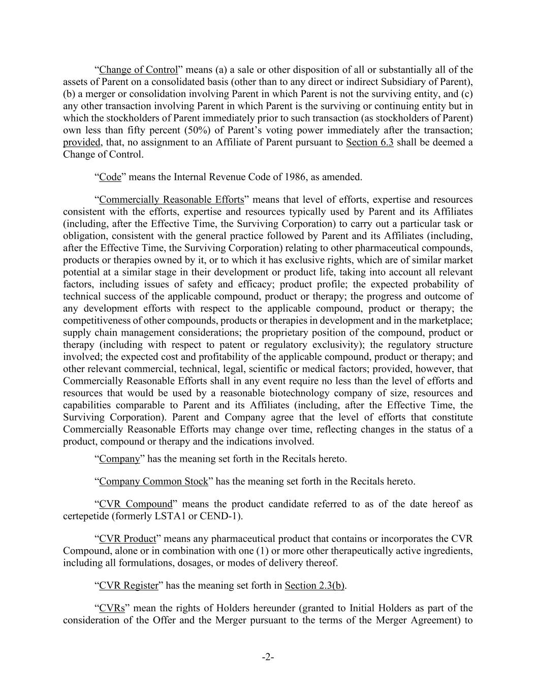 -2- “Change of Control” means (a) a sale or other disposition of all or substantially all of the assets of Parent on a consolidated basis (other than to any direct or indirect Subsidiary of Parent), (b) a merger or consolidation involving Parent in which Parent is not the surviving entity, and (c) any other transaction involving Parent in which Parent is the surviving or continuing entity but in which the stockholders of Parent immediately prior to such transaction (as stockholders of Parent) own less than fifty percent (50%) of Parent’s voting power immediately after the transaction; provided, that, no assignment to an Affiliate of Parent pursuant to Section 6.3 shall be deemed a Change of Control. “Code” means the Internal Revenue Code of 1986, as amended. “Commercially Reasonable Efforts” means that level of efforts, expertise and resources consistent with the efforts, expertise and resources typically used by Parent and its Affiliates (including, after the Effective Time, the Surviving Corporation) to carry out a particular task or obligation, consistent with the general practice followed by Parent and its Affiliates (including, after the Effective Time, the Surviving Corporation) relating to other pharmaceutical compounds, products or therapies owned by it, or to which it has exclusive rights, which are of similar market potential at a similar stage in their development or product life, taking into account all relevant factors, including issues of safety and efficacy; product profile; the expected probability of technical success of the applicable compound, product or therapy; the progress and outcome of any development efforts with respect to the applicable compound, product or therapy; the competitiveness of other compounds, products or therapies in development and in the marketplace; supply chain management considerations; the proprietary position of the compound, product or therapy (including with respect to patent or regulatory exclusivity); the regulatory structure involved; the expected cost and profitability of the applicable compound, product or therapy; and other relevant commercial, technical, legal, scientific or medical factors; provided, however, that Commercially Reasonable Efforts shall in any event require no less than the level of efforts and resources that would be used by a reasonable biotechnology company of size, resources and capabilities comparable to Parent and its Affiliates (including, after the Effective Time, the Surviving Corporation). Parent and Company agree that the level of efforts that constitute Commercially Reasonable Efforts may change over time, reflecting changes in the status of a product, compound or therapy and the indications involved. “Company” has the meaning set forth in the Recitals hereto. “Company Common Stock” has the meaning set forth in the Recitals hereto. “CVR Compound” means the product candidate referred to as of the date hereof as certepetide (formerly LSTA1 or CEND-1). “CVR Product” means any pharmaceutical product that contains or incorporates the CVR Compound, alone or in combination with one (1) or more other therapeutically active ingredients, including all formulations, dosages, or modes of delivery thereof. “CVR Register” has the meaning set forth in Section 2.3(b). “CVRs” mean the rights of Holders hereunder (granted to Initial Holders as part of the consideration of the Offer and the Merger pursuant to the terms of the Merger Agreement) to