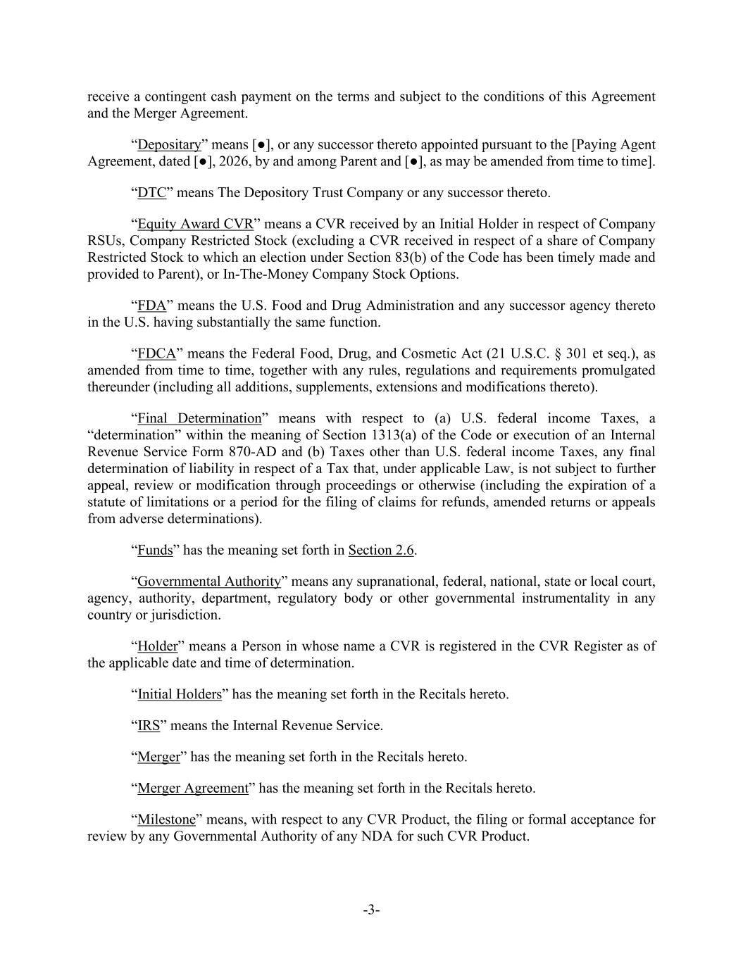 -3- receive a contingent cash payment on the terms and subject to the conditions of this Agreement and the Merger Agreement. “Depositary” means [●], or any successor thereto appointed pursuant to the [Paying Agent Agreement, dated [●], 2026, by and among Parent and [●], as may be amended from time to time]. “DTC” means The Depository Trust Company or any successor thereto. “Equity Award CVR” means a CVR received by an Initial Holder in respect of Company RSUs, Company Restricted Stock (excluding a CVR received in respect of a share of Company Restricted Stock to which an election under Section 83(b) of the Code has been timely made and provided to Parent), or In-The-Money Company Stock Options. “FDA” means the U.S. Food and Drug Administration and any successor agency thereto in the U.S. having substantially the same function. “FDCA” means the Federal Food, Drug, and Cosmetic Act (21 U.S.C. § 301 et seq.), as amended from time to time, together with any rules, regulations and requirements promulgated thereunder (including all additions, supplements, extensions and modifications thereto). “Final Determination” means with respect to (a) U.S. federal income Taxes, a “determination” within the meaning of Section 1313(a) of the Code or execution of an Internal Revenue Service Form 870-AD and (b) Taxes other than U.S. federal income Taxes, any final determination of liability in respect of a Tax that, under applicable Law, is not subject to further appeal, review or modification through proceedings or otherwise (including the expiration of a statute of limitations or a period for the filing of claims for refunds, amended returns or appeals from adverse determinations). “Funds” has the meaning set forth in Section 2.6. “Governmental Authority” means any supranational, federal, national, state or local court, agency, authority, department, regulatory body or other governmental instrumentality in any country or jurisdiction. “Holder” means a Person in whose name a CVR is registered in the CVR Register as of the applicable date and time of determination. “Initial Holders” has the meaning set forth in the Recitals hereto. “IRS” means the Internal Revenue Service. “Merger” has the meaning set forth in the Recitals hereto. “Merger Agreement” has the meaning set forth in the Recitals hereto. “Milestone” means, with respect to any CVR Product, the filing or formal acceptance for review by any Governmental Authority of any NDA for such CVR Product.