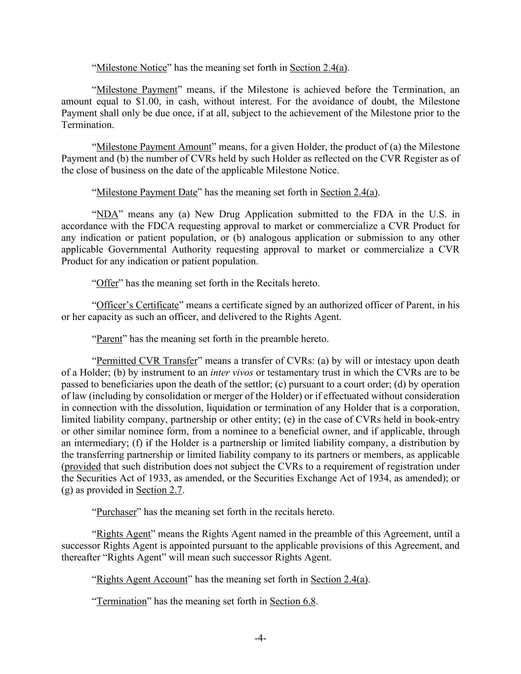 -4- “Milestone Notice” has the meaning set forth in Section 2.4(a). “Milestone Payment” means, if the Milestone is achieved before the Termination, an amount equal to $1.00, in cash, without interest. For the avoidance of doubt, the Milestone Payment shall only be due once, if at all, subject to the achievement of the Milestone prior to the Termination. “Milestone Payment Amount” means, for a given Holder, the product of (a) the Milestone Payment and (b) the number of CVRs held by such Holder as reflected on the CVR Register as of the close of business on the date of the applicable Milestone Notice. “Milestone Payment Date” has the meaning set forth in Section 2.4(a). “NDA” means any (a) New Drug Application submitted to the FDA in the U.S. in accordance with the FDCA requesting approval to market or commercialize a CVR Product for any indication or patient population, or (b) analogous application or submission to any other applicable Governmental Authority requesting approval to market or commercialize a CVR Product for any indication or patient population. “Offer” has the meaning set forth in the Recitals hereto. “Officer’s Certificate” means a certificate signed by an authorized officer of Parent, in his or her capacity as such an officer, and delivered to the Rights Agent. “Parent” has the meaning set forth in the preamble hereto. “Permitted CVR Transfer” means a transfer of CVRs: (a) by will or intestacy upon death of a Holder; (b) by instrument to an inter vivos or testamentary trust in which the CVRs are to be passed to beneficiaries upon the death of the settlor; (c) pursuant to a court order; (d) by operation of law (including by consolidation or merger of the Holder) or if effectuated without consideration in connection with the dissolution, liquidation or termination of any Holder that is a corporation, limited liability company, partnership or other entity; (e) in the case of CVRs held in book-entry or other similar nominee form, from a nominee to a beneficial owner, and if applicable, through an intermediary; (f) if the Holder is a partnership or limited liability company, a distribution by the transferring partnership or limited liability company to its partners or members, as applicable (provided that such distribution does not subject the CVRs to a requirement of registration under the Securities Act of 1933, as amended, or the Securities Exchange Act of 1934, as amended); or (g) as provided in Section 2.7. “Purchaser” has the meaning set forth in the recitals hereto. “Rights Agent” means the Rights Agent named in the preamble of this Agreement, until a successor Rights Agent is appointed pursuant to the applicable provisions of this Agreement, and thereafter “Rights Agent” will mean such successor Rights Agent. “Rights Agent Account” has the meaning set forth in Section 2.4(a). “Termination” has the meaning set forth in Section 6.8.