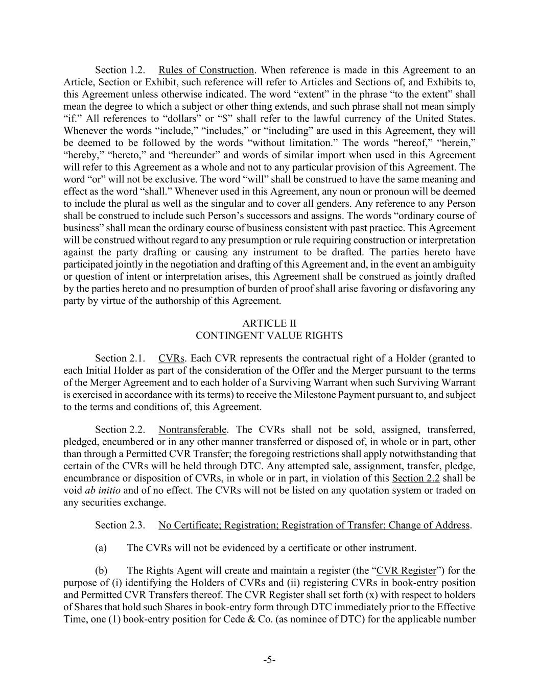 -5- Section 1.2. Rules of Construction. When reference is made in this Agreement to an Article, Section or Exhibit, such reference will refer to Articles and Sections of, and Exhibits to, this Agreement unless otherwise indicated. The word “extent” in the phrase “to the extent” shall mean the degree to which a subject or other thing extends, and such phrase shall not mean simply “if.” All references to “dollars” or “$” shall refer to the lawful currency of the United States. Whenever the words “include,” “includes,” or “including” are used in this Agreement, they will be deemed to be followed by the words “without limitation.” The words “hereof,” “herein,” “hereby,” “hereto,” and “hereunder” and words of similar import when used in this Agreement will refer to this Agreement as a whole and not to any particular provision of this Agreement. The word “or” will not be exclusive. The word “will” shall be construed to have the same meaning and effect as the word “shall.” Whenever used in this Agreement, any noun or pronoun will be deemed to include the plural as well as the singular and to cover all genders. Any reference to any Person shall be construed to include such Person’s successors and assigns. The words “ordinary course of business” shall mean the ordinary course of business consistent with past practice. This Agreement will be construed without regard to any presumption or rule requiring construction or interpretation against the party drafting or causing any instrument to be drafted. The parties hereto have participated jointly in the negotiation and drafting of this Agreement and, in the event an ambiguity or question of intent or interpretation arises, this Agreement shall be construed as jointly drafted by the parties hereto and no presumption of burden of proof shall arise favoring or disfavoring any party by virtue of the authorship of this Agreement. ARTICLE II CONTINGENT VALUE RIGHTS Section 2.1. CVRs. Each CVR represents the contractual right of a Holder (granted to each Initial Holder as part of the consideration of the Offer and the Merger pursuant to the terms of the Merger Agreement and to each holder of a Surviving Warrant when such Surviving Warrant is exercised in accordance with its terms) to receive the Milestone Payment pursuant to, and subject to the terms and conditions of, this Agreement. Section 2.2. Nontransferable. The CVRs shall not be sold, assigned, transferred, pledged, encumbered or in any other manner transferred or disposed of, in whole or in part, other than through a Permitted CVR Transfer; the foregoing restrictions shall apply notwithstanding that certain of the CVRs will be held through DTC. Any attempted sale, assignment, transfer, pledge, encumbrance or disposition of CVRs, in whole or in part, in violation of this Section 2.2 shall be void ab initio and of no effect. The CVRs will not be listed on any quotation system or traded on any securities exchange. Section 2.3. No Certificate; Registration; Registration of Transfer; Change of Address. (a) The CVRs will not be evidenced by a certificate or other instrument. (b) The Rights Agent will create and maintain a register (the “CVR Register”) for the purpose of (i) identifying the Holders of CVRs and (ii) registering CVRs in book-entry position and Permitted CVR Transfers thereof. The CVR Register shall set forth (x) with respect to holders of Shares that hold such Shares in book-entry form through DTC immediately prior to the Effective Time, one (1) book-entry position for Cede & Co. (as nominee of DTC) for the applicable number