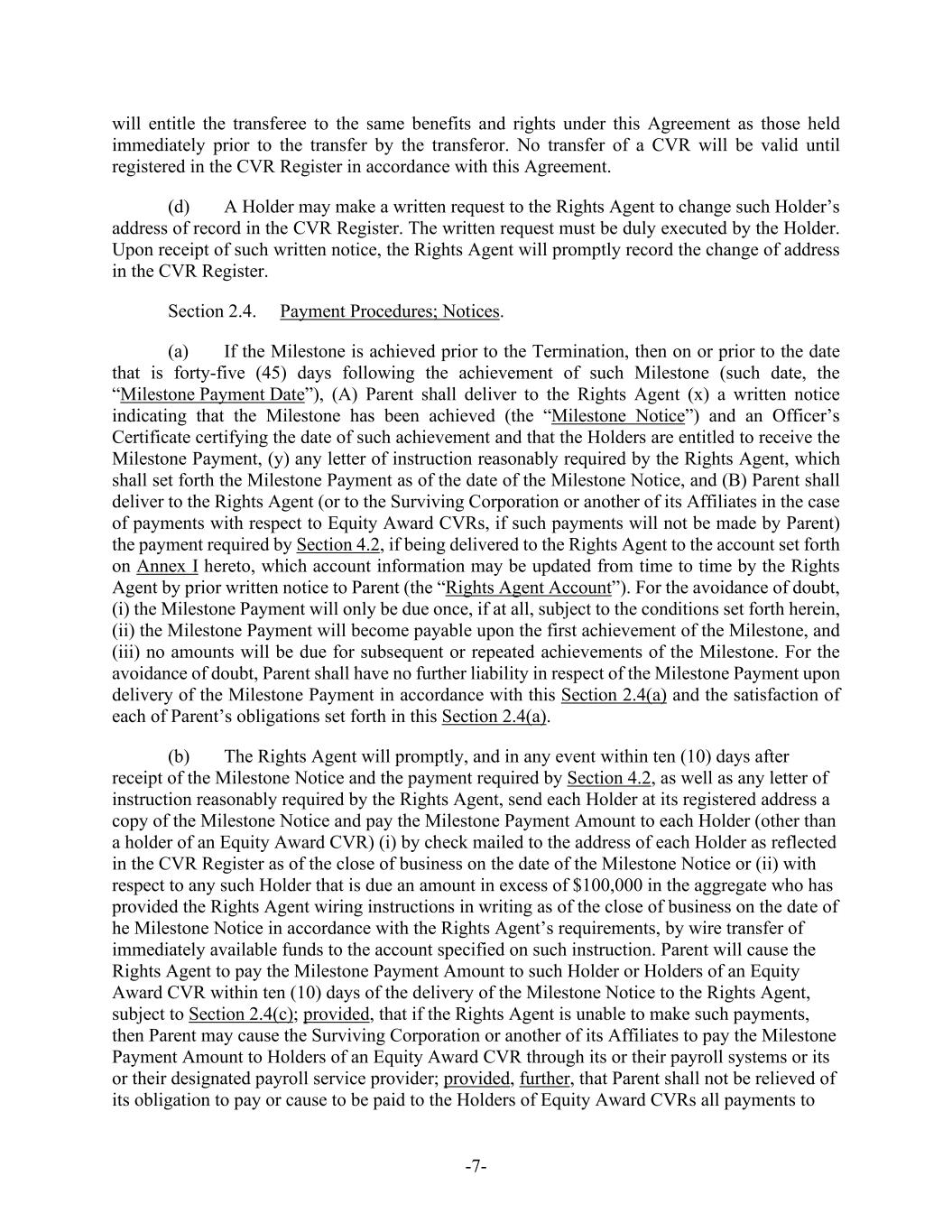 -7- will entitle the transferee to the same benefits and rights under this Agreement as those held immediately prior to the transfer by the transferor. No transfer of a CVR will be valid until registered in the CVR Register in accordance with this Agreement. (d) A Holder may make a written request to the Rights Agent to change such Holder’s address of record in the CVR Register. The written request must be duly executed by the Holder. Upon receipt of such written notice, the Rights Agent will promptly record the change of address in the CVR Register. Section 2.4. Payment Procedures; Notices. (a) If the Milestone is achieved prior to the Termination, then on or prior to the date that is forty-five (45) days following the achievement of such Milestone (such date, the “Milestone Payment Date”), (A) Parent shall deliver to the Rights Agent (x) a written notice indicating that the Milestone has been achieved (the “Milestone Notice”) and an Officer’s Certificate certifying the date of such achievement and that the Holders are entitled to receive the Milestone Payment, (y) any letter of instruction reasonably required by the Rights Agent, which shall set forth the Milestone Payment as of the date of the Milestone Notice, and (B) Parent shall deliver to the Rights Agent (or to the Surviving Corporation or another of its Affiliates in the case of payments with respect to Equity Award CVRs, if such payments will not be made by Parent) the payment required by Section 4.2, if being delivered to the Rights Agent to the account set forth on Annex I hereto, which account information may be updated from time to time by the Rights Agent by prior written notice to Parent (the “Rights Agent Account”). For the avoidance of doubt, (i) the Milestone Payment will only be due once, if at all, subject to the conditions set forth herein, (ii) the Milestone Payment will become payable upon the first achievement of the Milestone, and (iii) no amounts will be due for subsequent or repeated achievements of the Milestone. For the avoidance of doubt, Parent shall have no further liability in respect of the Milestone Payment upon delivery of the Milestone Payment in accordance with this Section 2.4(a) and the satisfaction of each of Parent’s obligations set forth in this Section 2.4(a). (b) The Rights Agent will promptly, and in any event within ten (10) days after receipt of the Milestone Notice and the payment required by Section 4.2, as well as any letter of instruction reasonably required by the Rights Agent, send each Holder at its registered address a copy of the Milestone Notice and pay the Milestone Payment Amount to each Holder (other than a holder of an Equity Award CVR) (i) by check mailed to the address of each Holder as reflected in the CVR Register as of the close of business on the date of the Milestone Notice or (ii) with respect to any such Holder that is due an amount in excess of $100,000 in the aggregate who has provided the Rights Agent wiring instructions in writing as of the close of business on the date of he Milestone Notice in accordance with the Rights Agent’s requirements, by wire transfer of immediately available funds to the account specified on such instruction. Parent will cause the Rights Agent to pay the Milestone Payment Amount to such Holder or Holders of an Equity Award CVR within ten (10) days of the delivery of the Milestone Notice to the Rights Agent, subject to Section 2.4(c); provided, that if the Rights Agent is unable to make such payments, then Parent may cause the Surviving Corporation or another of its Affiliates to pay the Milestone Payment Amount to Holders of an Equity Award CVR through its or their payroll systems or its or their designated payroll service provider; provided, further, that Parent shall not be relieved of its obligation to pay or cause to be paid to the Holders of Equity Award CVRs all payments to
