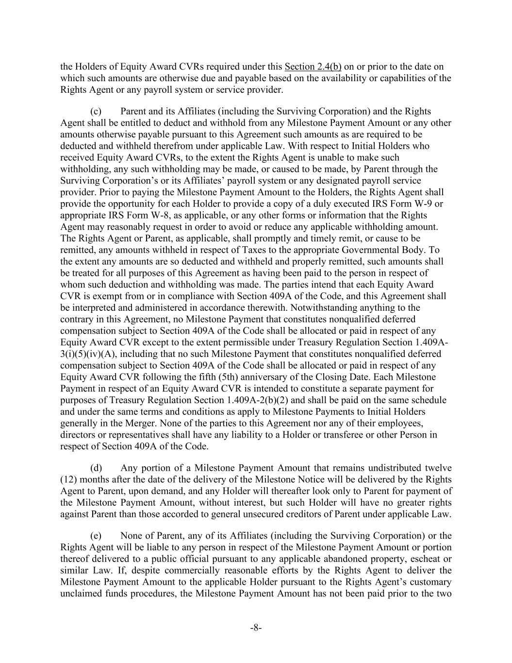 -8- the Holders of Equity Award CVRs required under this Section 2.4(b) on or prior to the date on which such amounts are otherwise due and payable based on the availability or capabilities of the Rights Agent or any payroll system or service provider. (c) Parent and its Affiliates (including the Surviving Corporation) and the Rights Agent shall be entitled to deduct and withhold from any Milestone Payment Amount or any other amounts otherwise payable pursuant to this Agreement such amounts as are required to be deducted and withheld therefrom under applicable Law. With respect to Initial Holders who received Equity Award CVRs, to the extent the Rights Agent is unable to make such withholding, any such withholding may be made, or caused to be made, by Parent through the Surviving Corporation’s or its Affiliates’ payroll system or any designated payroll service provider. Prior to paying the Milestone Payment Amount to the Holders, the Rights Agent shall provide the opportunity for each Holder to provide a copy of a duly executed IRS Form W-9 or appropriate IRS Form W-8, as applicable, or any other forms or information that the Rights Agent may reasonably request in order to avoid or reduce any applicable withholding amount. The Rights Agent or Parent, as applicable, shall promptly and timely remit, or cause to be remitted, any amounts withheld in respect of Taxes to the appropriate Governmental Body. To the extent any amounts are so deducted and withheld and properly remitted, such amounts shall be treated for all purposes of this Agreement as having been paid to the person in respect of whom such deduction and withholding was made. The parties intend that each Equity Award CVR is exempt from or in compliance with Section 409A of the Code, and this Agreement shall be interpreted and administered in accordance therewith. Notwithstanding anything to the contrary in this Agreement, no Milestone Payment that constitutes nonqualified deferred compensation subject to Section 409A of the Code shall be allocated or paid in respect of any Equity Award CVR except to the extent permissible under Treasury Regulation Section 1.409A- 3(i)(5)(iv)(A), including that no such Milestone Payment that constitutes nonqualified deferred compensation subject to Section 409A of the Code shall be allocated or paid in respect of any Equity Award CVR following the fifth (5th) anniversary of the Closing Date. Each Milestone Payment in respect of an Equity Award CVR is intended to constitute a separate payment for purposes of Treasury Regulation Section 1.409A-2(b)(2) and shall be paid on the same schedule and under the same terms and conditions as apply to Milestone Payments to Initial Holders generally in the Merger. None of the parties to this Agreement nor any of their employees, directors or representatives shall have any liability to a Holder or transferee or other Person in respect of Section 409A of the Code. (d) Any portion of a Milestone Payment Amount that remains undistributed twelve (12) months after the date of the delivery of the Milestone Notice will be delivered by the Rights Agent to Parent, upon demand, and any Holder will thereafter look only to Parent for payment of the Milestone Payment Amount, without interest, but such Holder will have no greater rights against Parent than those accorded to general unsecured creditors of Parent under applicable Law. (e) None of Parent, any of its Affiliates (including the Surviving Corporation) or the Rights Agent will be liable to any person in respect of the Milestone Payment Amount or portion thereof delivered to a public official pursuant to any applicable abandoned property, escheat or similar Law. If, despite commercially reasonable efforts by the Rights Agent to deliver the Milestone Payment Amount to the applicable Holder pursuant to the Rights Agent’s customary unclaimed funds procedures, the Milestone Payment Amount has not been paid prior to the two