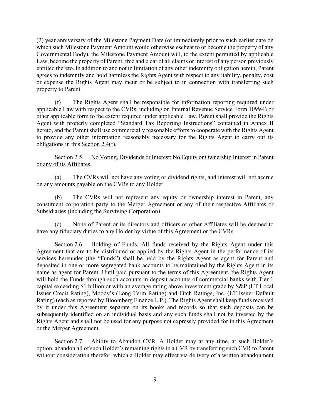 -9- (2) year anniversary of the Milestone Payment Date (or immediately prior to such earlier date on which such Milestone Payment Amount would otherwise escheat to or become the property of any Governmental Body), the Milestone Payment Amount will, to the extent permitted by applicable Law, become the property of Parent, free and clear of all claims or interest of any person previously entitled thereto. In addition to and not in limitation of any other indemnity obligation herein, Parent agrees to indemnify and hold harmless the Rights Agent with respect to any liability, penalty, cost or expense the Rights Agent may incur or be subject to in connection with transferring such property to Parent. (f) The Rights Agent shall be responsible for information reporting required under applicable Law with respect to the CVRs, including on Internal Revenue Service Form 1099-B or other applicable form to the extent required under applicable Law. Parent shall provide the Rights Agent with properly completed “Standard Tax Reporting Instructions” contained in Annex II hereto, and the Parent shall use commercially reasonable efforts to cooperate with the Rights Agent to provide any other information reasonably necessary for the Rights Agent to carry out its obligations in this Section 2.4(f). Section 2.5. No Voting, Dividends or Interest; No Equity or Ownership Interest in Parent or any of its Affiliates. (a) The CVRs will not have any voting or dividend rights, and interest will not accrue on any amounts payable on the CVRs to any Holder. (b) The CVRs will not represent any equity or ownership interest in Parent, any constituent corporation party to the Merger Agreement or any of their respective Affiliates or Subsidiaries (including the Surviving Corporation). (c) None of Parent or its directors and officers or other Affiliates will be deemed to have any fiduciary duties to any Holder by virtue of this Agreement or the CVRs. Section 2.6. Holding of Funds. All funds received by the Rights Agent under this Agreement that are to be distributed or applied by the Rights Agent in the performance of its services hereunder (the “Funds”) shall be held by the Rights Agent as agent for Parent and deposited in one or more segregated bank accounts to be maintained by the Rights Agent in its name as agent for Parent. Until paid pursuant to the terms of this Agreement, the Rights Agent will hold the Funds through such accounts in deposit accounts of commercial banks with Tier 1 capital exceeding $1 billion or with an average rating above investment grade by S&P (LT Local Issuer Credit Rating), Moody’s (Long Term Rating) and Fitch Ratings, Inc. (LT Issuer Default Rating) (each as reported by Bloomberg Finance L.P.). The Rights Agent shall keep funds received by it under this Agreement separate on its books and records so that such deposits can be subsequently identified on an individual basis and any such funds shall not be invested by the Rights Agent and shall not be used for any purpose not expressly provided for in this Agreement or the Merger Agreement. Section 2.7. Ability to Abandon CVR. A Holder may at any time, at such Holder’s option, abandon all of such Holder’s remaining rights in a CVR by transferring such CVR to Parent without consideration therefor, which a Holder may effect via delivery of a written abandonment