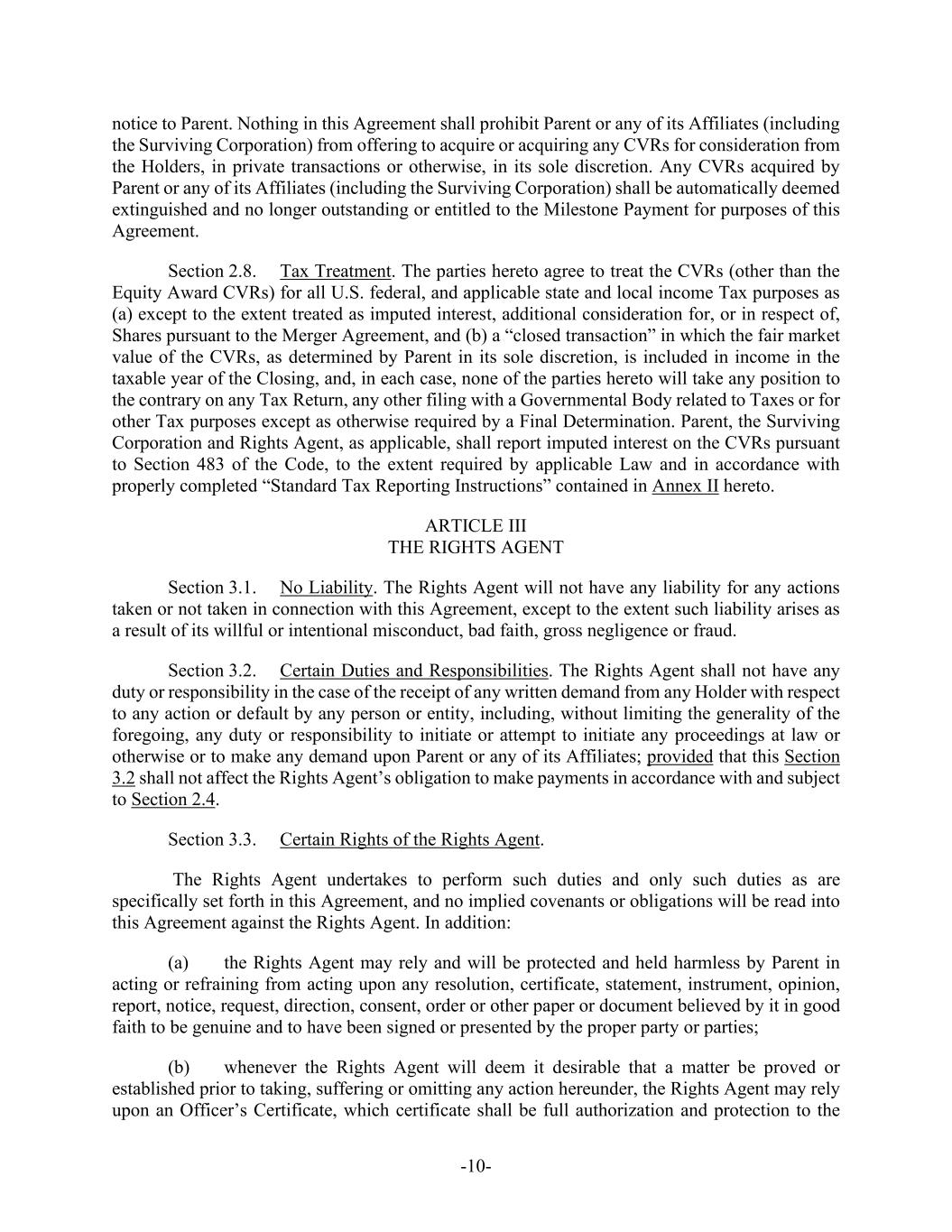 -10- notice to Parent. Nothing in this Agreement shall prohibit Parent or any of its Affiliates (including the Surviving Corporation) from offering to acquire or acquiring any CVRs for consideration from the Holders, in private transactions or otherwise, in its sole discretion. Any CVRs acquired by Parent or any of its Affiliates (including the Surviving Corporation) shall be automatically deemed extinguished and no longer outstanding or entitled to the Milestone Payment for purposes of this Agreement. Section 2.8. Tax Treatment. The parties hereto agree to treat the CVRs (other than the Equity Award CVRs) for all U.S. federal, and applicable state and local income Tax purposes as (a) except to the extent treated as imputed interest, additional consideration for, or in respect of, Shares pursuant to the Merger Agreement, and (b) a “closed transaction” in which the fair market value of the CVRs, as determined by Parent in its sole discretion, is included in income in the taxable year of the Closing, and, in each case, none of the parties hereto will take any position to the contrary on any Tax Return, any other filing with a Governmental Body related to Taxes or for other Tax purposes except as otherwise required by a Final Determination. Parent, the Surviving Corporation and Rights Agent, as applicable, shall report imputed interest on the CVRs pursuant to Section 483 of the Code, to the extent required by applicable Law and in accordance with properly completed “Standard Tax Reporting Instructions” contained in Annex II hereto. ARTICLE III THE RIGHTS AGENT Section 3.1. No Liability. The Rights Agent will not have any liability for any actions taken or not taken in connection with this Agreement, except to the extent such liability arises as a result of its willful or intentional misconduct, bad faith, gross negligence or fraud. Section 3.2. Certain Duties and Responsibilities. The Rights Agent shall not have any duty or responsibility in the case of the receipt of any written demand from any Holder with respect to any action or default by any person or entity, including, without limiting the generality of the foregoing, any duty or responsibility to initiate or attempt to initiate any proceedings at law or otherwise or to make any demand upon Parent or any of its Affiliates; provided that this Section 3.2 shall not affect the Rights Agent’s obligation to make payments in accordance with and subject to Section 2.4. Section 3.3. Certain Rights of the Rights Agent. The Rights Agent undertakes to perform such duties and only such duties as are specifically set forth in this Agreement, and no implied covenants or obligations will be read into this Agreement against the Rights Agent. In addition: (a) the Rights Agent may rely and will be protected and held harmless by Parent in acting or refraining from acting upon any resolution, certificate, statement, instrument, opinion, report, notice, request, direction, consent, order or other paper or document believed by it in good faith to be genuine and to have been signed or presented by the proper party or parties; (b) whenever the Rights Agent will deem it desirable that a matter be proved or established prior to taking, suffering or omitting any action hereunder, the Rights Agent may rely upon an Officer’s Certificate, which certificate shall be full authorization and protection to the