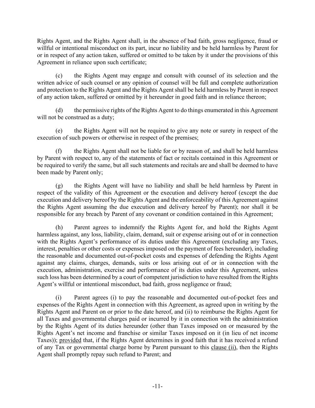 -11- Rights Agent, and the Rights Agent shall, in the absence of bad faith, gross negligence, fraud or willful or intentional misconduct on its part, incur no liability and be held harmless by Parent for or in respect of any action taken, suffered or omitted to be taken by it under the provisions of this Agreement in reliance upon such certificate; (c) the Rights Agent may engage and consult with counsel of its selection and the written advice of such counsel or any opinion of counsel will be full and complete authorization and protection to the Rights Agent and the Rights Agent shall be held harmless by Parent in respect of any action taken, suffered or omitted by it hereunder in good faith and in reliance thereon; (d) the permissive rights of the Rights Agent to do things enumerated in this Agreement will not be construed as a duty; (e) the Rights Agent will not be required to give any note or surety in respect of the execution of such powers or otherwise in respect of the premises; (f) the Rights Agent shall not be liable for or by reason of, and shall be held harmless by Parent with respect to, any of the statements of fact or recitals contained in this Agreement or be required to verify the same, but all such statements and recitals are and shall be deemed to have been made by Parent only; (g) the Rights Agent will have no liability and shall be held harmless by Parent in respect of the validity of this Agreement or the execution and delivery hereof (except the due execution and delivery hereof by the Rights Agent and the enforceability of this Agreement against the Rights Agent assuming the due execution and delivery hereof by Parent); nor shall it be responsible for any breach by Parent of any covenant or condition contained in this Agreement; (h) Parent agrees to indemnify the Rights Agent for, and hold the Rights Agent harmless against, any loss, liability, claim, demand, suit or expense arising out of or in connection with the Rights Agent’s performance of its duties under this Agreement (excluding any Taxes, interest, penalties or other costs or expenses imposed on the payment of fees hereunder), including the reasonable and documented out-of-pocket costs and expenses of defending the Rights Agent against any claims, charges, demands, suits or loss arising out of or in connection with the execution, administration, exercise and performance of its duties under this Agreement, unless such loss has been determined by a court of competent jurisdiction to have resulted from the Rights Agent’s willful or intentional misconduct, bad faith, gross negligence or fraud; (i) Parent agrees (i) to pay the reasonable and documented out-of-pocket fees and expenses of the Rights Agent in connection with this Agreement, as agreed upon in writing by the Rights Agent and Parent on or prior to the date hereof, and (ii) to reimburse the Rights Agent for all Taxes and governmental charges paid or incurred by it in connection with the administration by the Rights Agent of its duties hereunder (other than Taxes imposed on or measured by the Rights Agent’s net income and franchise or similar Taxes imposed on it (in lieu of net income Taxes)); provided that, if the Rights Agent determines in good faith that it has received a refund of any Tax or governmental charge borne by Parent pursuant to this clause (ii), then the Rights Agent shall promptly repay such refund to Parent; and
