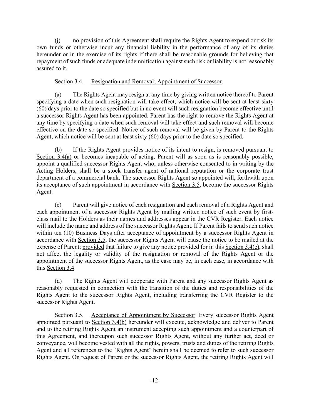 -12- (j) no provision of this Agreement shall require the Rights Agent to expend or risk its own funds or otherwise incur any financial liability in the performance of any of its duties hereunder or in the exercise of its rights if there shall be reasonable grounds for believing that repayment of such funds or adequate indemnification against such risk or liability is not reasonably assured to it. Section 3.4. Resignation and Removal; Appointment of Successor. (a) The Rights Agent may resign at any time by giving written notice thereof to Parent specifying a date when such resignation will take effect, which notice will be sent at least sixty (60) days prior to the date so specified but in no event will such resignation become effective until a successor Rights Agent has been appointed. Parent has the right to remove the Rights Agent at any time by specifying a date when such removal will take effect and such removal will become effective on the date so specified. Notice of such removal will be given by Parent to the Rights Agent, which notice will be sent at least sixty (60) days prior to the date so specified. (b) If the Rights Agent provides notice of its intent to resign, is removed pursuant to Section 3.4(a) or becomes incapable of acting, Parent will as soon as is reasonably possible, appoint a qualified successor Rights Agent who, unless otherwise consented to in writing by the Acting Holders, shall be a stock transfer agent of national reputation or the corporate trust department of a commercial bank. The successor Rights Agent so appointed will, forthwith upon its acceptance of such appointment in accordance with Section 3.5, become the successor Rights Agent. (c) Parent will give notice of each resignation and each removal of a Rights Agent and each appointment of a successor Rights Agent by mailing written notice of such event by first- class mail to the Holders as their names and addresses appear in the CVR Register. Each notice will include the name and address of the successor Rights Agent. If Parent fails to send such notice within ten (10) Business Days after acceptance of appointment by a successor Rights Agent in accordance with Section 3.5, the successor Rights Agent will cause the notice to be mailed at the expense of Parent; provided that failure to give any notice provided for in this Section 3.4(c), shall not affect the legality or validity of the resignation or removal of the Rights Agent or the appointment of the successor Rights Agent, as the case may be, in each case, in accordance with this Section 3.4. (d) The Rights Agent will cooperate with Parent and any successor Rights Agent as reasonably requested in connection with the transition of the duties and responsibilities of the Rights Agent to the successor Rights Agent, including transferring the CVR Register to the successor Rights Agent. Section 3.5. Acceptance of Appointment by Successor. Every successor Rights Agent appointed pursuant to Section 3.4(b) hereunder will execute, acknowledge and deliver to Parent and to the retiring Rights Agent an instrument accepting such appointment and a counterpart of this Agreement, and thereupon such successor Rights Agent, without any further act, deed or conveyance, will become vested with all the rights, powers, trusts and duties of the retiring Rights Agent and all references to the “Rights Agent” herein shall be deemed to refer to such successor Rights Agent. On request of Parent or the successor Rights Agent, the retiring Rights Agent will