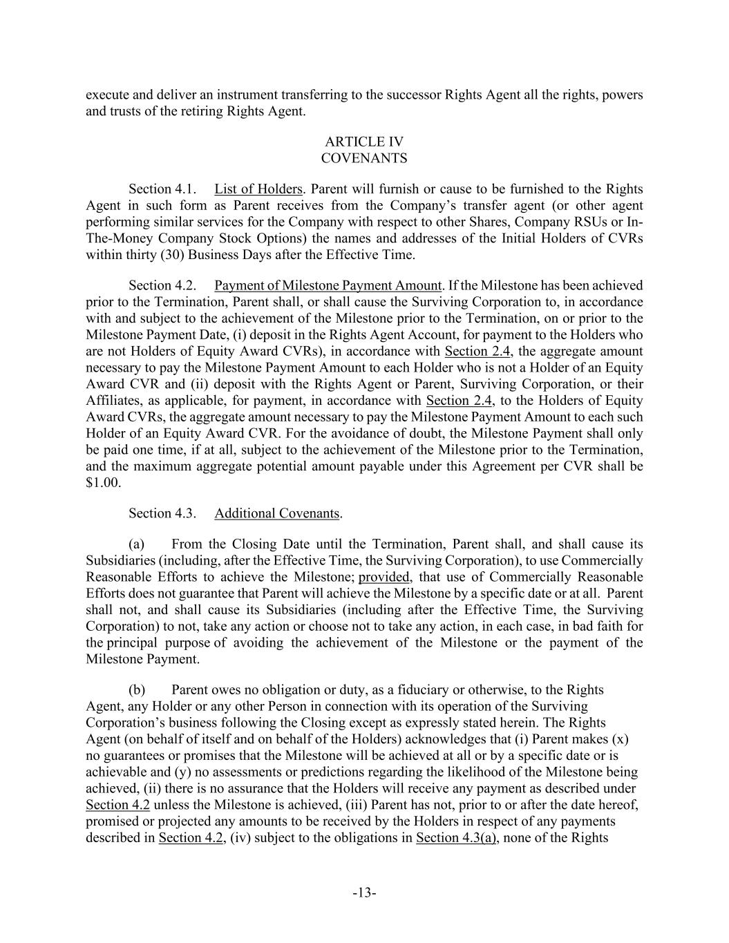 -13- execute and deliver an instrument transferring to the successor Rights Agent all the rights, powers and trusts of the retiring Rights Agent. ARTICLE IV COVENANTS Section 4.1. List of Holders. Parent will furnish or cause to be furnished to the Rights Agent in such form as Parent receives from the Company’s transfer agent (or other agent performing similar services for the Company with respect to other Shares, Company RSUs or In- The-Money Company Stock Options) the names and addresses of the Initial Holders of CVRs within thirty (30) Business Days after the Effective Time. Section 4.2. Payment of Milestone Payment Amount. If the Milestone has been achieved prior to the Termination, Parent shall, or shall cause the Surviving Corporation to, in accordance with and subject to the achievement of the Milestone prior to the Termination, on or prior to the Milestone Payment Date, (i) deposit in the Rights Agent Account, for payment to the Holders who are not Holders of Equity Award CVRs), in accordance with Section 2.4, the aggregate amount necessary to pay the Milestone Payment Amount to each Holder who is not a Holder of an Equity Award CVR and (ii) deposit with the Rights Agent or Parent, Surviving Corporation, or their Affiliates, as applicable, for payment, in accordance with Section 2.4, to the Holders of Equity Award CVRs, the aggregate amount necessary to pay the Milestone Payment Amount to each such Holder of an Equity Award CVR. For the avoidance of doubt, the Milestone Payment shall only be paid one time, if at all, subject to the achievement of the Milestone prior to the Termination, and the maximum aggregate potential amount payable under this Agreement per CVR shall be $1.00. Section 4.3. Additional Covenants. (a) From the Closing Date until the Termination, Parent shall, and shall cause its Subsidiaries (including, after the Effective Time, the Surviving Corporation), to use Commercially Reasonable Efforts to achieve the Milestone; provided, that use of Commercially Reasonable Efforts does not guarantee that Parent will achieve the Milestone by a specific date or at all. Parent shall not, and shall cause its Subsidiaries (including after the Effective Time, the Surviving Corporation) to not, take any action or choose not to take any action, in each case, in bad faith for the principal purpose of avoiding the achievement of the Milestone or the payment of the Milestone Payment. (b) Parent owes no obligation or duty, as a fiduciary or otherwise, to the Rights Agent, any Holder or any other Person in connection with its operation of the Surviving Corporation’s business following the Closing except as expressly stated herein. The Rights Agent (on behalf of itself and on behalf of the Holders) acknowledges that (i) Parent makes (x) no guarantees or promises that the Milestone will be achieved at all or by a specific date or is achievable and (y) no assessments or predictions regarding the likelihood of the Milestone being achieved, (ii) there is no assurance that the Holders will receive any payment as described under Section 4.2 unless the Milestone is achieved, (iii) Parent has not, prior to or after the date hereof, promised or projected any amounts to be received by the Holders in respect of any payments described in Section 4.2, (iv) subject to the obligations in Section 4.3(a), none of the Rights