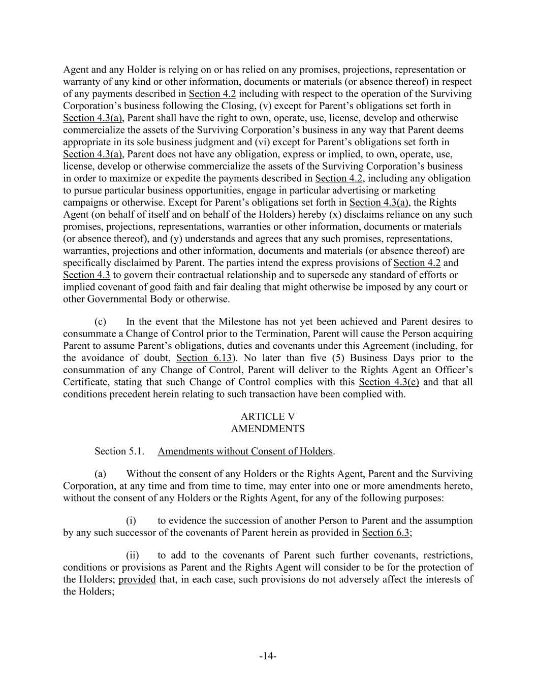 -14- Agent and any Holder is relying on or has relied on any promises, projections, representation or warranty of any kind or other information, documents or materials (or absence thereof) in respect of any payments described in Section 4.2 including with respect to the operation of the Surviving Corporation’s business following the Closing, (v) except for Parent’s obligations set forth in Section 4.3(a), Parent shall have the right to own, operate, use, license, develop and otherwise commercialize the assets of the Surviving Corporation’s business in any way that Parent deems appropriate in its sole business judgment and (vi) except for Parent’s obligations set forth in Section 4.3(a), Parent does not have any obligation, express or implied, to own, operate, use, license, develop or otherwise commercialize the assets of the Surviving Corporation’s business in order to maximize or expedite the payments described in Section 4.2, including any obligation to pursue particular business opportunities, engage in particular advertising or marketing campaigns or otherwise. Except for Parent’s obligations set forth in Section 4.3(a), the Rights Agent (on behalf of itself and on behalf of the Holders) hereby (x) disclaims reliance on any such promises, projections, representations, warranties or other information, documents or materials (or absence thereof), and (y) understands and agrees that any such promises, representations, warranties, projections and other information, documents and materials (or absence thereof) are specifically disclaimed by Parent. The parties intend the express provisions of Section 4.2 and Section 4.3 to govern their contractual relationship and to supersede any standard of efforts or implied covenant of good faith and fair dealing that might otherwise be imposed by any court or other Governmental Body or otherwise. (c) In the event that the Milestone has not yet been achieved and Parent desires to consummate a Change of Control prior to the Termination, Parent will cause the Person acquiring Parent to assume Parent’s obligations, duties and covenants under this Agreement (including, for the avoidance of doubt, Section 6.13). No later than five (5) Business Days prior to the consummation of any Change of Control, Parent will deliver to the Rights Agent an Officer’s Certificate, stating that such Change of Control complies with this Section 4.3(c) and that all conditions precedent herein relating to such transaction have been complied with. ARTICLE V AMENDMENTS Section 5.1. Amendments without Consent of Holders. (a) Without the consent of any Holders or the Rights Agent, Parent and the Surviving Corporation, at any time and from time to time, may enter into one or more amendments hereto, without the consent of any Holders or the Rights Agent, for any of the following purposes: (i) to evidence the succession of another Person to Parent and the assumption by any such successor of the covenants of Parent herein as provided in Section 6.3; (ii) to add to the covenants of Parent such further covenants, restrictions, conditions or provisions as Parent and the Rights Agent will consider to be for the protection of the Holders; provided that, in each case, such provisions do not adversely affect the interests of the Holders;