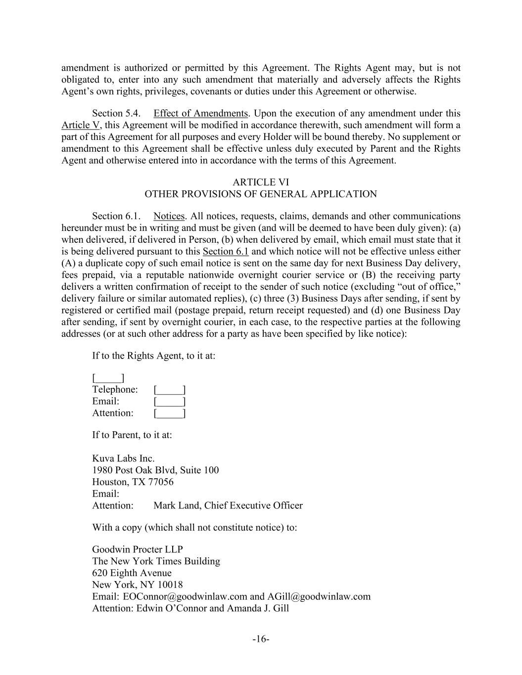 -16- amendment is authorized or permitted by this Agreement. The Rights Agent may, but is not obligated to, enter into any such amendment that materially and adversely affects the Rights Agent’s own rights, privileges, covenants or duties under this Agreement or otherwise. Section 5.4. Effect of Amendments. Upon the execution of any amendment under this Article V, this Agreement will be modified in accordance therewith, such amendment will form a part of this Agreement for all purposes and every Holder will be bound thereby. No supplement or amendment to this Agreement shall be effective unless duly executed by Parent and the Rights Agent and otherwise entered into in accordance with the terms of this Agreement. ARTICLE VI OTHER PROVISIONS OF GENERAL APPLICATION Section 6.1. Notices. All notices, requests, claims, demands and other communications hereunder must be in writing and must be given (and will be deemed to have been duly given): (a) when delivered, if delivered in Person, (b) when delivered by email, which email must state that it is being delivered pursuant to this Section 6.1 and which notice will not be effective unless either (A) a duplicate copy of such email notice is sent on the same day for next Business Day delivery, fees prepaid, via a reputable nationwide overnight courier service or (B) the receiving party delivers a written confirmation of receipt to the sender of such notice (excluding “out of office,” delivery failure or similar automated replies), (c) three (3) Business Days after sending, if sent by registered or certified mail (postage prepaid, return receipt requested) and (d) one Business Day after sending, if sent by overnight courier, in each case, to the respective parties at the following addresses (or at such other address for a party as have been specified by like notice): If to the Rights Agent, to it at: [_____] Telephone: [_____] Email: [_____] Attention: [_____] If to Parent, to it at: Kuva Labs Inc. 1980 Post Oak Blvd, Suite 100 Houston, TX 77056 Email: Attention: Mark Land, Chief Executive Officer With a copy (which shall not constitute notice) to: Goodwin Procter LLP The New York Times Building 620 Eighth Avenue New York, NY 10018 Email: EOConnor@goodwinlaw.com and AGill@goodwinlaw.com Attention: Edwin O’Connor and Amanda J. Gill
