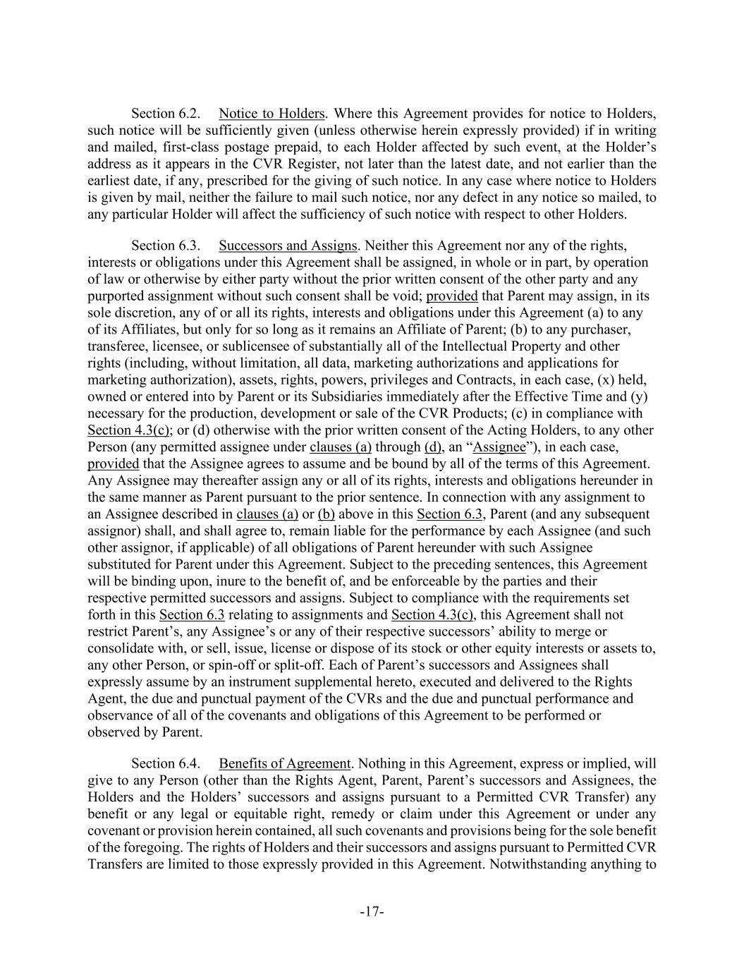 -17- Section 6.2. Notice to Holders. Where this Agreement provides for notice to Holders, such notice will be sufficiently given (unless otherwise herein expressly provided) if in writing and mailed, first-class postage prepaid, to each Holder affected by such event, at the Holder’s address as it appears in the CVR Register, not later than the latest date, and not earlier than the earliest date, if any, prescribed for the giving of such notice. In any case where notice to Holders is given by mail, neither the failure to mail such notice, nor any defect in any notice so mailed, to any particular Holder will affect the sufficiency of such notice with respect to other Holders. Section 6.3. Successors and Assigns. Neither this Agreement nor any of the rights, interests or obligations under this Agreement shall be assigned, in whole or in part, by operation of law or otherwise by either party without the prior written consent of the other party and any purported assignment without such consent shall be void; provided that Parent may assign, in its sole discretion, any of or all its rights, interests and obligations under this Agreement (a) to any of its Affiliates, but only for so long as it remains an Affiliate of Parent; (b) to any purchaser, transferee, licensee, or sublicensee of substantially all of the Intellectual Property and other rights (including, without limitation, all data, marketing authorizations and applications for marketing authorization), assets, rights, powers, privileges and Contracts, in each case, (x) held, owned or entered into by Parent or its Subsidiaries immediately after the Effective Time and (y) necessary for the production, development or sale of the CVR Products; (c) in compliance with Section 4.3(c); or (d) otherwise with the prior written consent of the Acting Holders, to any other Person (any permitted assignee under clauses (a) through (d), an “Assignee”), in each case, provided that the Assignee agrees to assume and be bound by all of the terms of this Agreement. Any Assignee may thereafter assign any or all of its rights, interests and obligations hereunder in the same manner as Parent pursuant to the prior sentence. In connection with any assignment to an Assignee described in clauses (a) or (b) above in this Section 6.3, Parent (and any subsequent assignor) shall, and shall agree to, remain liable for the performance by each Assignee (and such other assignor, if applicable) of all obligations of Parent hereunder with such Assignee substituted for Parent under this Agreement. Subject to the preceding sentences, this Agreement will be binding upon, inure to the benefit of, and be enforceable by the parties and their respective permitted successors and assigns. Subject to compliance with the requirements set forth in this Section 6.3 relating to assignments and Section 4.3(c), this Agreement shall not restrict Parent’s, any Assignee’s or any of their respective successors’ ability to merge or consolidate with, or sell, issue, license or dispose of its stock or other equity interests or assets to, any other Person, or spin-off or split-off. Each of Parent’s successors and Assignees shall expressly assume by an instrument supplemental hereto, executed and delivered to the Rights Agent, the due and punctual payment of the CVRs and the due and punctual performance and observance of all of the covenants and obligations of this Agreement to be performed or observed by Parent. Section 6.4. Benefits of Agreement. Nothing in this Agreement, express or implied, will give to any Person (other than the Rights Agent, Parent, Parent’s successors and Assignees, the Holders and the Holders’ successors and assigns pursuant to a Permitted CVR Transfer) any benefit or any legal or equitable right, remedy or claim under this Agreement or under any covenant or provision herein contained, all such covenants and provisions being for the sole benefit of the foregoing. The rights of Holders and their successors and assigns pursuant to Permitted CVR Transfers are limited to those expressly provided in this Agreement. Notwithstanding anything to