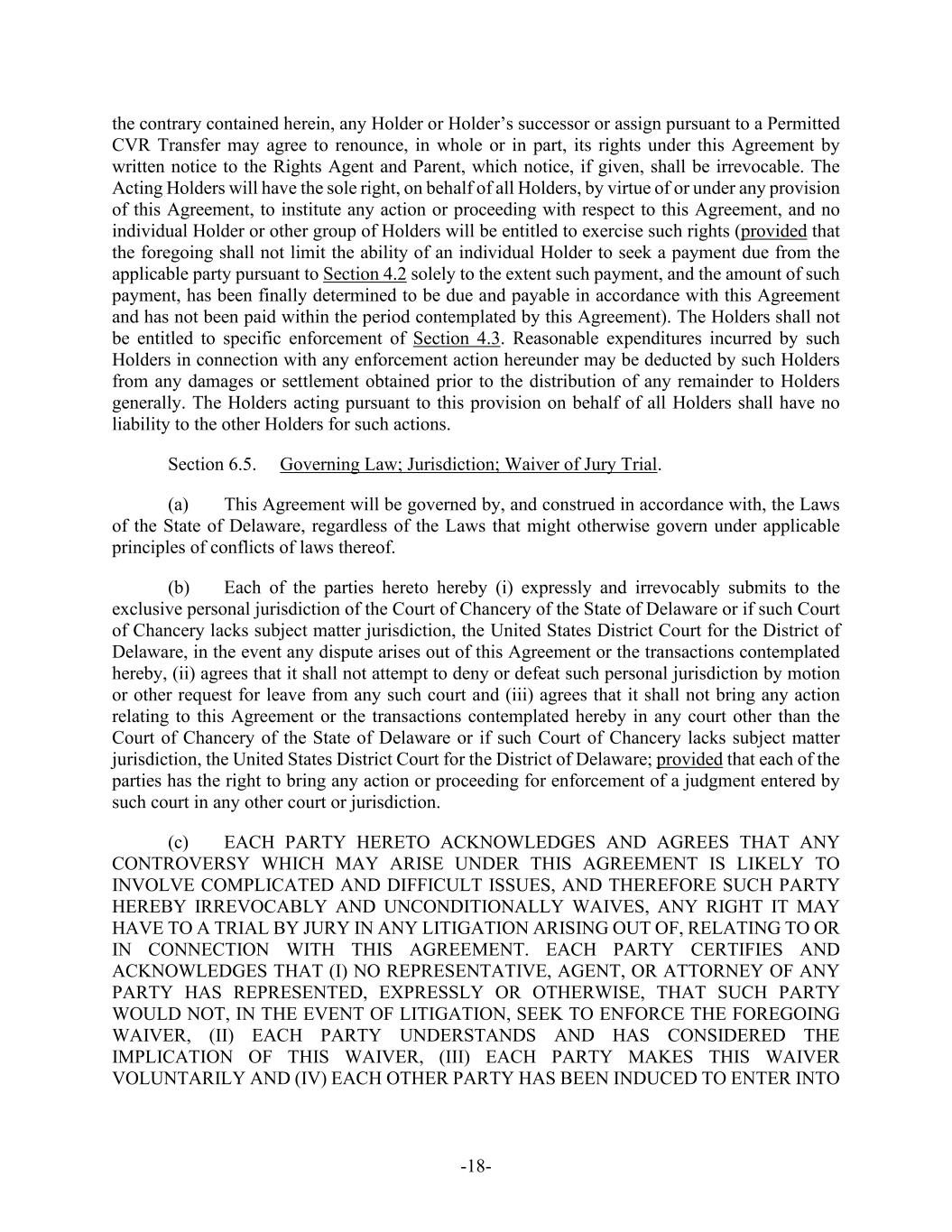 -18- the contrary contained herein, any Holder or Holder’s successor or assign pursuant to a Permitted CVR Transfer may agree to renounce, in whole or in part, its rights under this Agreement by written notice to the Rights Agent and Parent, which notice, if given, shall be irrevocable. The Acting Holders will have the sole right, on behalf of all Holders, by virtue of or under any provision of this Agreement, to institute any action or proceeding with respect to this Agreement, and no individual Holder or other group of Holders will be entitled to exercise such rights (provided that the foregoing shall not limit the ability of an individual Holder to seek a payment due from the applicable party pursuant to Section 4.2 solely to the extent such payment, and the amount of such payment, has been finally determined to be due and payable in accordance with this Agreement and has not been paid within the period contemplated by this Agreement). The Holders shall not be entitled to specific enforcement of Section 4.3. Reasonable expenditures incurred by such Holders in connection with any enforcement action hereunder may be deducted by such Holders from any damages or settlement obtained prior to the distribution of any remainder to Holders generally. The Holders acting pursuant to this provision on behalf of all Holders shall have no liability to the other Holders for such actions. Section 6.5. Governing Law; Jurisdiction; Waiver of Jury Trial. (a) This Agreement will be governed by, and construed in accordance with, the Laws of the State of Delaware, regardless of the Laws that might otherwise govern under applicable principles of conflicts of laws thereof. (b) Each of the parties hereto hereby (i) expressly and irrevocably submits to the exclusive personal jurisdiction of the Court of Chancery of the State of Delaware or if such Court of Chancery lacks subject matter jurisdiction, the United States District Court for the District of Delaware, in the event any dispute arises out of this Agreement or the transactions contemplated hereby, (ii) agrees that it shall not attempt to deny or defeat such personal jurisdiction by motion or other request for leave from any such court and (iii) agrees that it shall not bring any action relating to this Agreement or the transactions contemplated hereby in any court other than the Court of Chancery of the State of Delaware or if such Court of Chancery lacks subject matter jurisdiction, the United States District Court for the District of Delaware; provided that each of the parties has the right to bring any action or proceeding for enforcement of a judgment entered by such court in any other court or jurisdiction. (c) EACH PARTY HERETO ACKNOWLEDGES AND AGREES THAT ANY CONTROVERSY WHICH MAY ARISE UNDER THIS AGREEMENT IS LIKELY TO INVOLVE COMPLICATED AND DIFFICULT ISSUES, AND THEREFORE SUCH PARTY HEREBY IRREVOCABLY AND UNCONDITIONALLY WAIVES, ANY RIGHT IT MAY HAVE TO A TRIAL BY JURY IN ANY LITIGATION ARISING OUT OF, RELATING TO OR IN CONNECTION WITH THIS AGREEMENT. EACH PARTY CERTIFIES AND ACKNOWLEDGES THAT (I) NO REPRESENTATIVE, AGENT, OR ATTORNEY OF ANY PARTY HAS REPRESENTED, EXPRESSLY OR OTHERWISE, THAT SUCH PARTY WOULD NOT, IN THE EVENT OF LITIGATION, SEEK TO ENFORCE THE FOREGOING WAIVER, (II) EACH PARTY UNDERSTANDS AND HAS CONSIDERED THE IMPLICATION OF THIS WAIVER, (III) EACH PARTY MAKES THIS WAIVER VOLUNTARILY AND (IV) EACH OTHER PARTY HAS BEEN INDUCED TO ENTER INTO