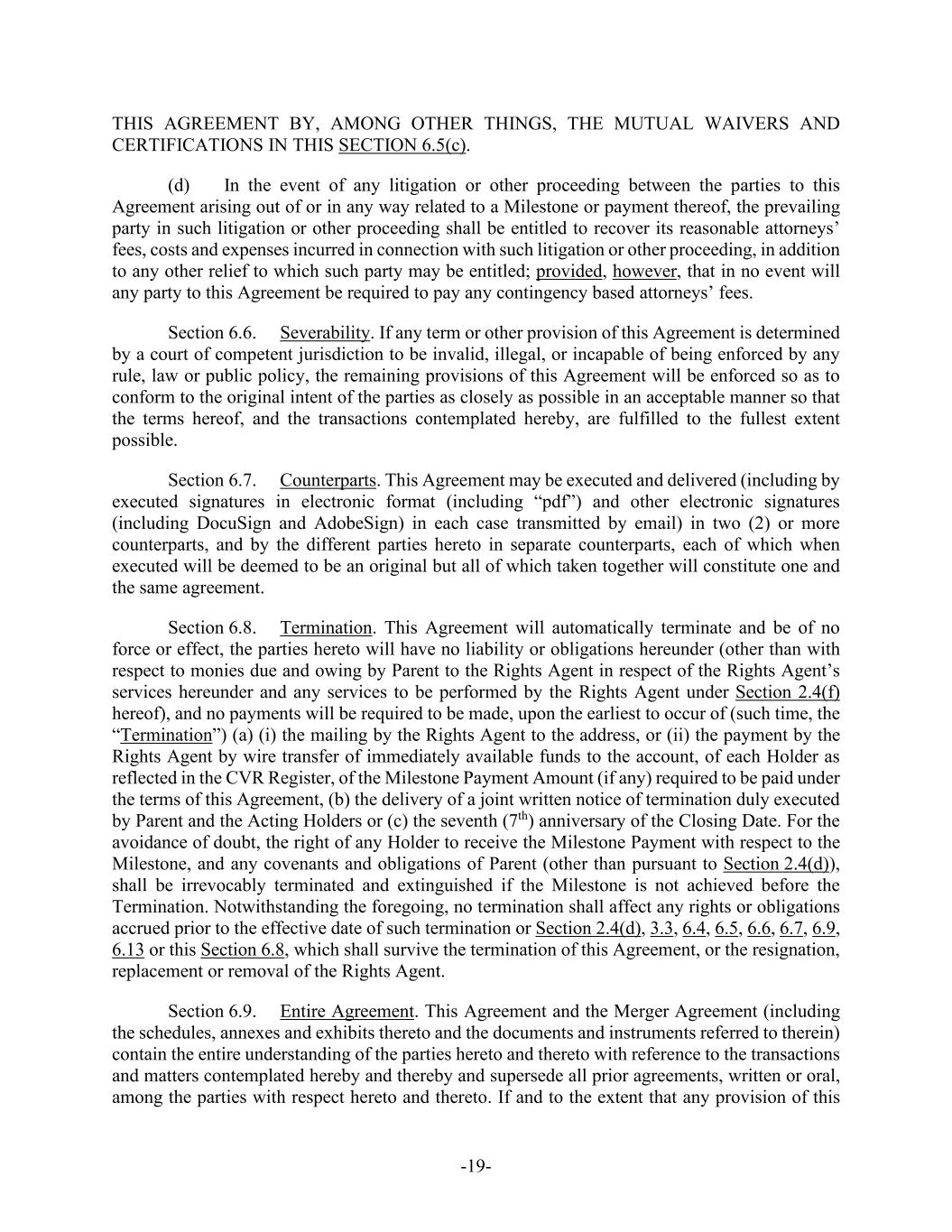 -19- THIS AGREEMENT BY, AMONG OTHER THINGS, THE MUTUAL WAIVERS AND CERTIFICATIONS IN THIS SECTION 6.5(c). (d) In the event of any litigation or other proceeding between the parties to this Agreement arising out of or in any way related to a Milestone or payment thereof, the prevailing party in such litigation or other proceeding shall be entitled to recover its reasonable attorneys’ fees, costs and expenses incurred in connection with such litigation or other proceeding, in addition to any other relief to which such party may be entitled; provided, however, that in no event will any party to this Agreement be required to pay any contingency based attorneys’ fees. Section 6.6. Severability. If any term or other provision of this Agreement is determined by a court of competent jurisdiction to be invalid, illegal, or incapable of being enforced by any rule, law or public policy, the remaining provisions of this Agreement will be enforced so as to conform to the original intent of the parties as closely as possible in an acceptable manner so that the terms hereof, and the transactions contemplated hereby, are fulfilled to the fullest extent possible. Section 6.7. Counterparts. This Agreement may be executed and delivered (including by executed signatures in electronic format (including “pdf”) and other electronic signatures (including DocuSign and AdobeSign) in each case transmitted by email) in two (2) or more counterparts, and by the different parties hereto in separate counterparts, each of which when executed will be deemed to be an original but all of which taken together will constitute one and the same agreement. Section 6.8. Termination. This Agreement will automatically terminate and be of no force or effect, the parties hereto will have no liability or obligations hereunder (other than with respect to monies due and owing by Parent to the Rights Agent in respect of the Rights Agent’s services hereunder and any services to be performed by the Rights Agent under Section 2.4(f) hereof), and no payments will be required to be made, upon the earliest to occur of (such time, the “Termination”) (a) (i) the mailing by the Rights Agent to the address, or (ii) the payment by the Rights Agent by wire transfer of immediately available funds to the account, of each Holder as reflected in the CVR Register, of the Milestone Payment Amount (if any) required to be paid under the terms of this Agreement, (b) the delivery of a joint written notice of termination duly executed by Parent and the Acting Holders or (c) the seventh (7th) anniversary of the Closing Date. For the avoidance of doubt, the right of any Holder to receive the Milestone Payment with respect to the Milestone, and any covenants and obligations of Parent (other than pursuant to Section 2.4(d)), shall be irrevocably terminated and extinguished if the Milestone is not achieved before the Termination. Notwithstanding the foregoing, no termination shall affect any rights or obligations accrued prior to the effective date of such termination or Section 2.4(d), 3.3, 6.4, 6.5, 6.6, 6.7, 6.9, 6.13 or this Section 6.8, which shall survive the termination of this Agreement, or the resignation, replacement or removal of the Rights Agent. Section 6.9. Entire Agreement. This Agreement and the Merger Agreement (including the schedules, annexes and exhibits thereto and the documents and instruments referred to therein) contain the entire understanding of the parties hereto and thereto with reference to the transactions and matters contemplated hereby and thereby and supersede all prior agreements, written or oral, among the parties with respect hereto and thereto. If and to the extent that any provision of this