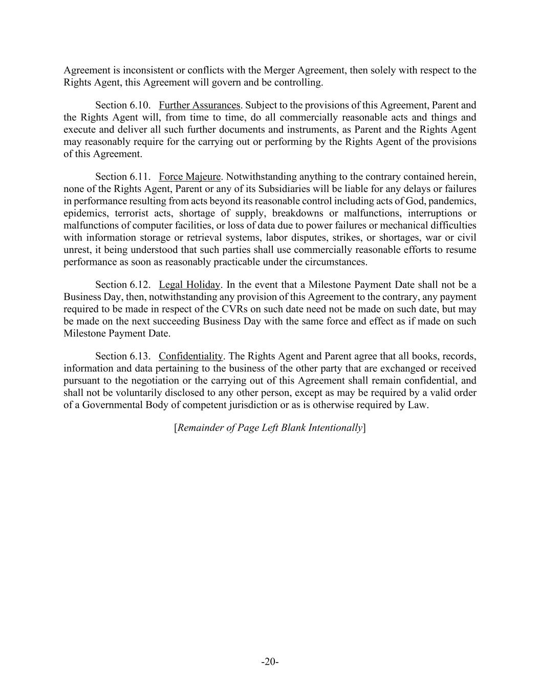 -20- Agreement is inconsistent or conflicts with the Merger Agreement, then solely with respect to the Rights Agent, this Agreement will govern and be controlling. Section 6.10. Further Assurances. Subject to the provisions of this Agreement, Parent and the Rights Agent will, from time to time, do all commercially reasonable acts and things and execute and deliver all such further documents and instruments, as Parent and the Rights Agent may reasonably require for the carrying out or performing by the Rights Agent of the provisions of this Agreement. Section 6.11. Force Majeure. Notwithstanding anything to the contrary contained herein, none of the Rights Agent, Parent or any of its Subsidiaries will be liable for any delays or failures in performance resulting from acts beyond its reasonable control including acts of God, pandemics, epidemics, terrorist acts, shortage of supply, breakdowns or malfunctions, interruptions or malfunctions of computer facilities, or loss of data due to power failures or mechanical difficulties with information storage or retrieval systems, labor disputes, strikes, or shortages, war or civil unrest, it being understood that such parties shall use commercially reasonable efforts to resume performance as soon as reasonably practicable under the circumstances. Section 6.12. Legal Holiday. In the event that a Milestone Payment Date shall not be a Business Day, then, notwithstanding any provision of this Agreement to the contrary, any payment required to be made in respect of the CVRs on such date need not be made on such date, but may be made on the next succeeding Business Day with the same force and effect as if made on such Milestone Payment Date. Section 6.13. Confidentiality. The Rights Agent and Parent agree that all books, records, information and data pertaining to the business of the other party that are exchanged or received pursuant to the negotiation or the carrying out of this Agreement shall remain confidential, and shall not be voluntarily disclosed to any other person, except as may be required by a valid order of a Governmental Body of competent jurisdiction or as is otherwise required by Law. [Remainder of Page Left Blank Intentionally]