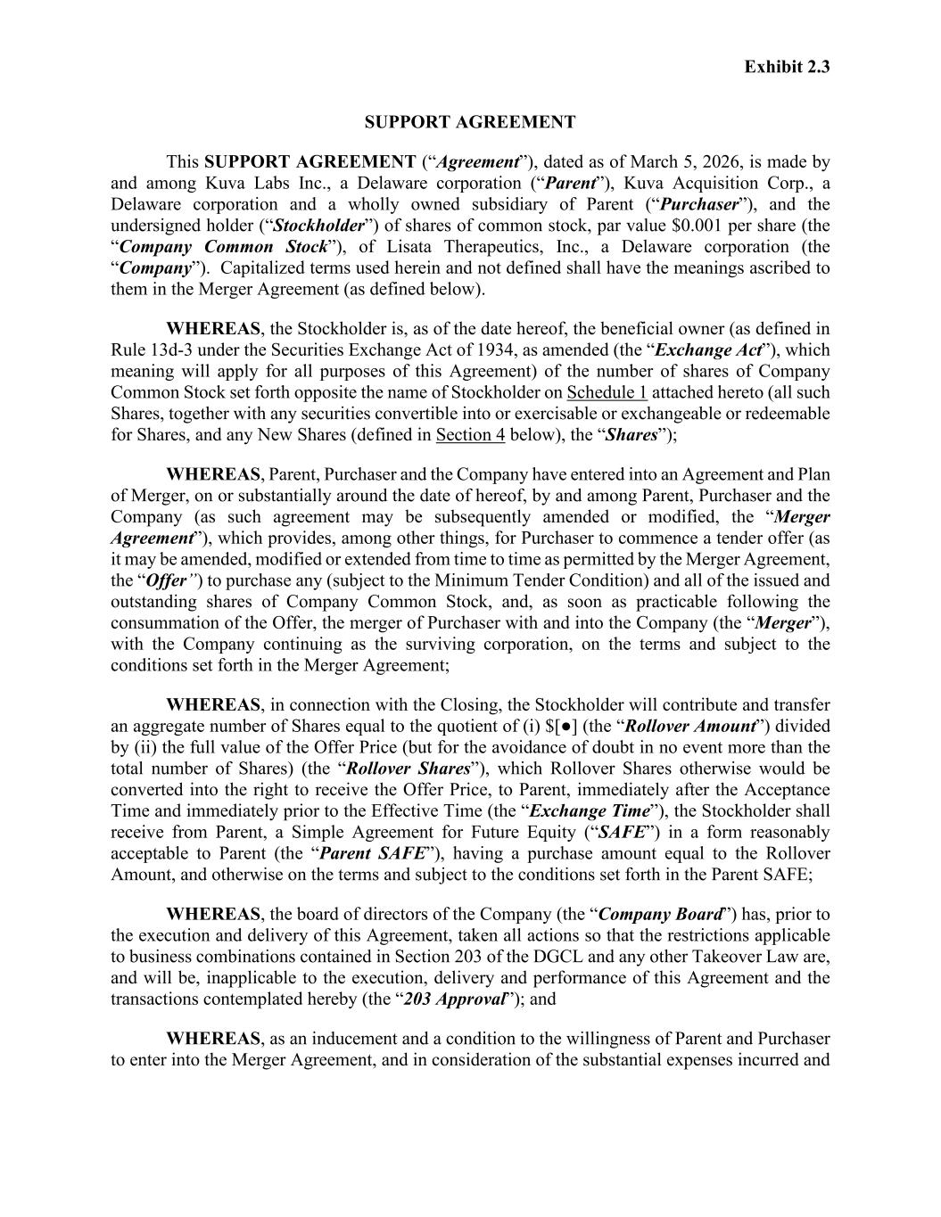 Exhibit 2.3 SUPPORT AGREEMENT This SUPPORT AGREEMENT (“Agreement”), dated as of March 5, 2026, is made by and among Kuva Labs Inc., a Delaware corporation (“Parent”), Kuva Acquisition Corp., a Delaware corporation and a wholly owned subsidiary of Parent (“Purchaser”), and the undersigned holder (“Stockholder”) of shares of common stock, par value $0.001 per share (the “Company Common Stock”), of Lisata Therapeutics, Inc., a Delaware corporation (the “Company”). Capitalized terms used herein and not defined shall have the meanings ascribed to them in the Merger Agreement (as defined below). WHEREAS, the Stockholder is, as of the date hereof, the beneficial owner (as defined in Rule 13d-3 under the Securities Exchange Act of 1934, as amended (the “Exchange Act”), which meaning will apply for all purposes of this Agreement) of the number of shares of Company Common Stock set forth opposite the name of Stockholder on Schedule 1 attached hereto (all such Shares, together with any securities convertible into or exercisable or exchangeable or redeemable for Shares, and any New Shares (defined in Section 4 below), the “Shares”); WHEREAS, Parent, Purchaser and the Company have entered into an Agreement and Plan of Merger, on or substantially around the date of hereof, by and among Parent, Purchaser and the Company (as such agreement may be subsequently amended or modified, the “Merger Agreement”), which provides, among other things, for Purchaser to commence a tender offer (as it may be amended, modified or extended from time to time as permitted by the Merger Agreement, the “Offer”) to purchase any (subject to the Minimum Tender Condition) and all of the issued and outstanding shares of Company Common Stock, and, as soon as practicable following the consummation of the Offer, the merger of Purchaser with and into the Company (the “Merger”), with the Company continuing as the surviving corporation, on the terms and subject to the conditions set forth in the Merger Agreement; WHEREAS, in connection with the Closing, the Stockholder will contribute and transfer an aggregate number of Shares equal to the quotient of (i) $[●] (the “Rollover Amount”) divided by (ii) the full value of the Offer Price (but for the avoidance of doubt in no event more than the total number of Shares) (the “Rollover Shares”), which Rollover Shares otherwise would be converted into the right to receive the Offer Price, to Parent, immediately after the Acceptance Time and immediately prior to the Effective Time (the “Exchange Time”), the Stockholder shall receive from Parent, a Simple Agreement for Future Equity (“SAFE”) in a form reasonably acceptable to Parent (the “Parent SAFE”), having a purchase amount equal to the Rollover Amount, and otherwise on the terms and subject to the conditions set forth in the Parent SAFE; WHEREAS, the board of directors of the Company (the “Company Board”) has, prior to the execution and delivery of this Agreement, taken all actions so that the restrictions applicable to business combinations contained in Section 203 of the DGCL and any other Takeover Law are, and will be, inapplicable to the execution, delivery and performance of this Agreement and the transactions contemplated hereby (the “203 Approval”); and WHEREAS, as an inducement and a condition to the willingness of Parent and Purchaser to enter into the Merger Agreement, and in consideration of the substantial expenses incurred and