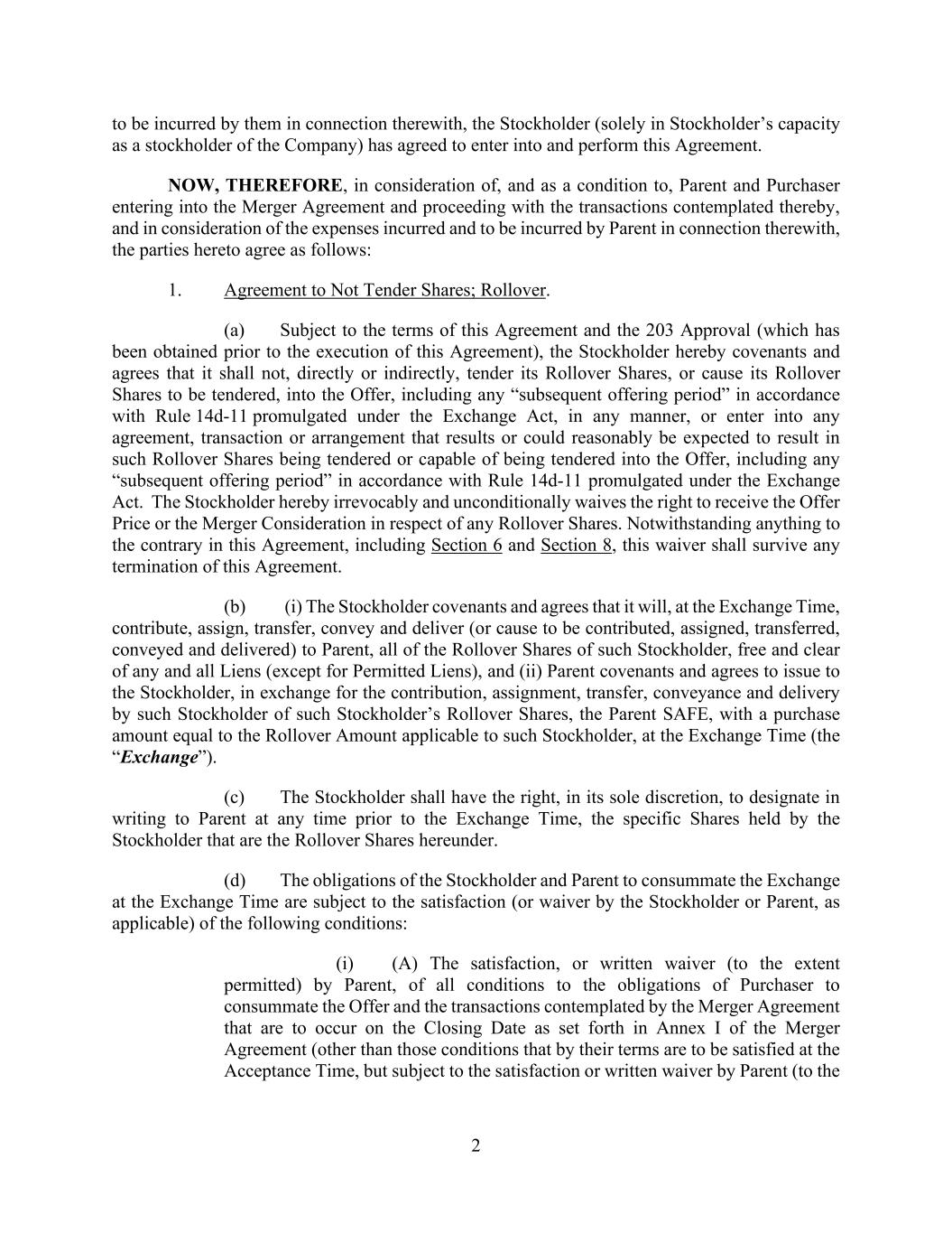 2 to be incurred by them in connection therewith, the Stockholder (solely in Stockholder’s capacity as a stockholder of the Company) has agreed to enter into and perform this Agreement. NOW, THEREFORE, in consideration of, and as a condition to, Parent and Purchaser entering into the Merger Agreement and proceeding with the transactions contemplated thereby, and in consideration of the expenses incurred and to be incurred by Parent in connection therewith, the parties hereto agree as follows: 1. Agreement to Not Tender Shares; Rollover. (a) Subject to the terms of this Agreement and the 203 Approval (which has been obtained prior to the execution of this Agreement), the Stockholder hereby covenants and agrees that it shall not, directly or indirectly, tender its Rollover Shares, or cause its Rollover Shares to be tendered, into the Offer, including any “subsequent offering period” in accordance with Rule 14d-11 promulgated under the Exchange Act, in any manner, or enter into any agreement, transaction or arrangement that results or could reasonably be expected to result in such Rollover Shares being tendered or capable of being tendered into the Offer, including any “subsequent offering period” in accordance with Rule 14d-11 promulgated under the Exchange Act. The Stockholder hereby irrevocably and unconditionally waives the right to receive the Offer Price or the Merger Consideration in respect of any Rollover Shares. Notwithstanding anything to the contrary in this Agreement, including Section 6 and Section 8, this waiver shall survive any termination of this Agreement. (b) (i) The Stockholder covenants and agrees that it will, at the Exchange Time, contribute, assign, transfer, convey and deliver (or cause to be contributed, assigned, transferred, conveyed and delivered) to Parent, all of the Rollover Shares of such Stockholder, free and clear of any and all Liens (except for Permitted Liens), and (ii) Parent covenants and agrees to issue to the Stockholder, in exchange for the contribution, assignment, transfer, conveyance and delivery by such Stockholder of such Stockholder’s Rollover Shares, the Parent SAFE, with a purchase amount equal to the Rollover Amount applicable to such Stockholder, at the Exchange Time (the “Exchange”). (c) The Stockholder shall have the right, in its sole discretion, to designate in writing to Parent at any time prior to the Exchange Time, the specific Shares held by the Stockholder that are the Rollover Shares hereunder. (d) The obligations of the Stockholder and Parent to consummate the Exchange at the Exchange Time are subject to the satisfaction (or waiver by the Stockholder or Parent, as applicable) of the following conditions: (i) (A) The satisfaction, or written waiver (to the extent permitted) by Parent, of all conditions to the obligations of Purchaser to consummate the Offer and the transactions contemplated by the Merger Agreement that are to occur on the Closing Date as set forth in Annex I of the Merger Agreement (other than those conditions that by their terms are to be satisfied at the Acceptance Time, but subject to the satisfaction or written waiver by Parent (to the