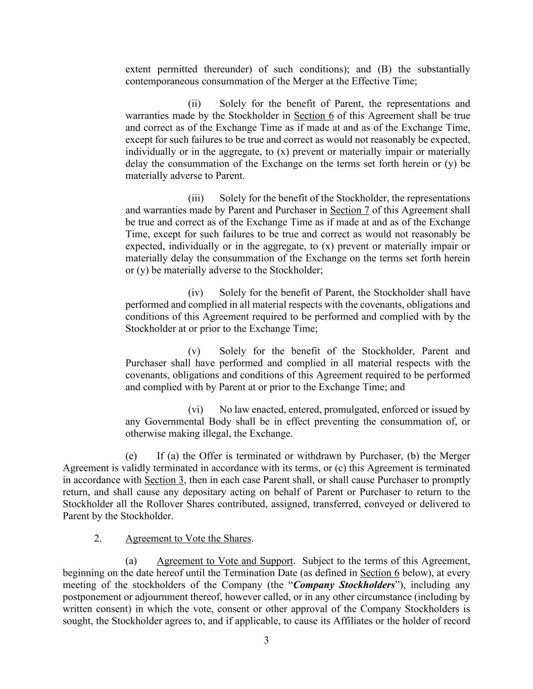 3 extent permitted thereunder) of such conditions); and (B) the substantially contemporaneous consummation of the Merger at the Effective Time; (ii) Solely for the benefit of Parent, the representations and warranties made by the Stockholder in Section 6 of this Agreement shall be true and correct as of the Exchange Time as if made at and as of the Exchange Time, except for such failures to be true and correct as would not reasonably be expected, individually or in the aggregate, to (x) prevent or materially impair or materially delay the consummation of the Exchange on the terms set forth herein or (y) be materially adverse to Parent. (iii) Solely for the benefit of the Stockholder, the representations and warranties made by Parent and Purchaser in Section 7 of this Agreement shall be true and correct as of the Exchange Time as if made at and as of the Exchange Time, except for such failures to be true and correct as would not reasonably be expected, individually or in the aggregate, to (x) prevent or materially impair or materially delay the consummation of the Exchange on the terms set forth herein or (y) be materially adverse to the Stockholder; (iv) Solely for the benefit of Parent, the Stockholder shall have performed and complied in all material respects with the covenants, obligations and conditions of this Agreement required to be performed and complied with by the Stockholder at or prior to the Exchange Time; (v) Solely for the benefit of the Stockholder, Parent and Purchaser shall have performed and complied in all material respects with the covenants, obligations and conditions of this Agreement required to be performed and complied with by Parent at or prior to the Exchange Time; and (vi) No law enacted, entered, promulgated, enforced or issued by any Governmental Body shall be in effect preventing the consummation of, or otherwise making illegal, the Exchange. (e) If (a) the Offer is terminated or withdrawn by Purchaser, (b) the Merger Agreement is validly terminated in accordance with its terms, or (c) this Agreement is terminated in accordance with Section 3, then in each case Parent shall, or shall cause Purchaser to promptly return, and shall cause any depositary acting on behalf of Parent or Purchaser to return to the Stockholder all the Rollover Shares contributed, assigned, transferred, conveyed or delivered to Parent by the Stockholder. 2. Agreement to Vote the Shares. (a) Agreement to Vote and Support. Subject to the terms of this Agreement, beginning on the date hereof until the Termination Date (as defined in Section 6 below), at every meeting of the stockholders of the Company (the “Company Stockholders”), including any postponement or adjournment thereof, however called, or in any other circumstance (including by written consent) in which the vote, consent or other approval of the Company Stockholders is sought, the Stockholder agrees to, and if applicable, to cause its Affiliates or the holder of record