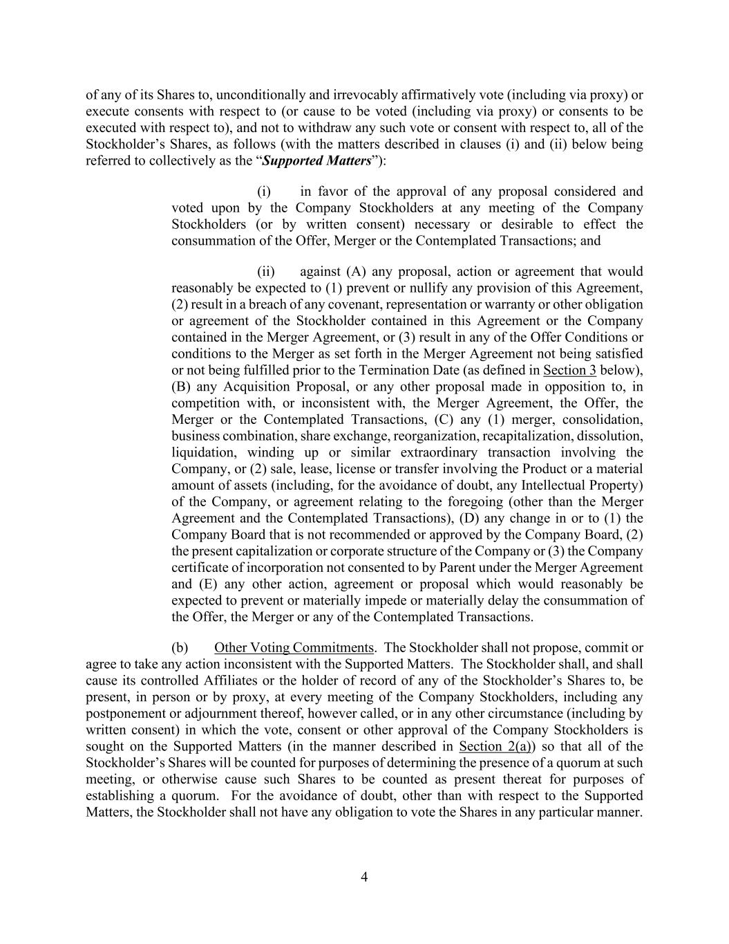 4 of any of its Shares to, unconditionally and irrevocably affirmatively vote (including via proxy) or execute consents with respect to (or cause to be voted (including via proxy) or consents to be executed with respect to), and not to withdraw any such vote or consent with respect to, all of the Stockholder’s Shares, as follows (with the matters described in clauses (i) and (ii) below being referred to collectively as the “Supported Matters”): (i) in favor of the approval of any proposal considered and voted upon by the Company Stockholders at any meeting of the Company Stockholders (or by written consent) necessary or desirable to effect the consummation of the Offer, Merger or the Contemplated Transactions; and (ii) against (A) any proposal, action or agreement that would reasonably be expected to (1) prevent or nullify any provision of this Agreement, (2) result in a breach of any covenant, representation or warranty or other obligation or agreement of the Stockholder contained in this Agreement or the Company contained in the Merger Agreement, or (3) result in any of the Offer Conditions or conditions to the Merger as set forth in the Merger Agreement not being satisfied or not being fulfilled prior to the Termination Date (as defined in Section 3 below), (B) any Acquisition Proposal, or any other proposal made in opposition to, in competition with, or inconsistent with, the Merger Agreement, the Offer, the Merger or the Contemplated Transactions, (C) any (1) merger, consolidation, business combination, share exchange, reorganization, recapitalization, dissolution, liquidation, winding up or similar extraordinary transaction involving the Company, or (2) sale, lease, license or transfer involving the Product or a material amount of assets (including, for the avoidance of doubt, any Intellectual Property) of the Company, or agreement relating to the foregoing (other than the Merger Agreement and the Contemplated Transactions), (D) any change in or to (1) the Company Board that is not recommended or approved by the Company Board, (2) the present capitalization or corporate structure of the Company or (3) the Company certificate of incorporation not consented to by Parent under the Merger Agreement and (E) any other action, agreement or proposal which would reasonably be expected to prevent or materially impede or materially delay the consummation of the Offer, the Merger or any of the Contemplated Transactions. (b) Other Voting Commitments. The Stockholder shall not propose, commit or agree to take any action inconsistent with the Supported Matters. The Stockholder shall, and shall cause its controlled Affiliates or the holder of record of any of the Stockholder’s Shares to, be present, in person or by proxy, at every meeting of the Company Stockholders, including any postponement or adjournment thereof, however called, or in any other circumstance (including by written consent) in which the vote, consent or other approval of the Company Stockholders is sought on the Supported Matters (in the manner described in Section 2(a)) so that all of the Stockholder’s Shares will be counted for purposes of determining the presence of a quorum at such meeting, or otherwise cause such Shares to be counted as present thereat for purposes of establishing a quorum. For the avoidance of doubt, other than with respect to the Supported Matters, the Stockholder shall not have any obligation to vote the Shares in any particular manner.