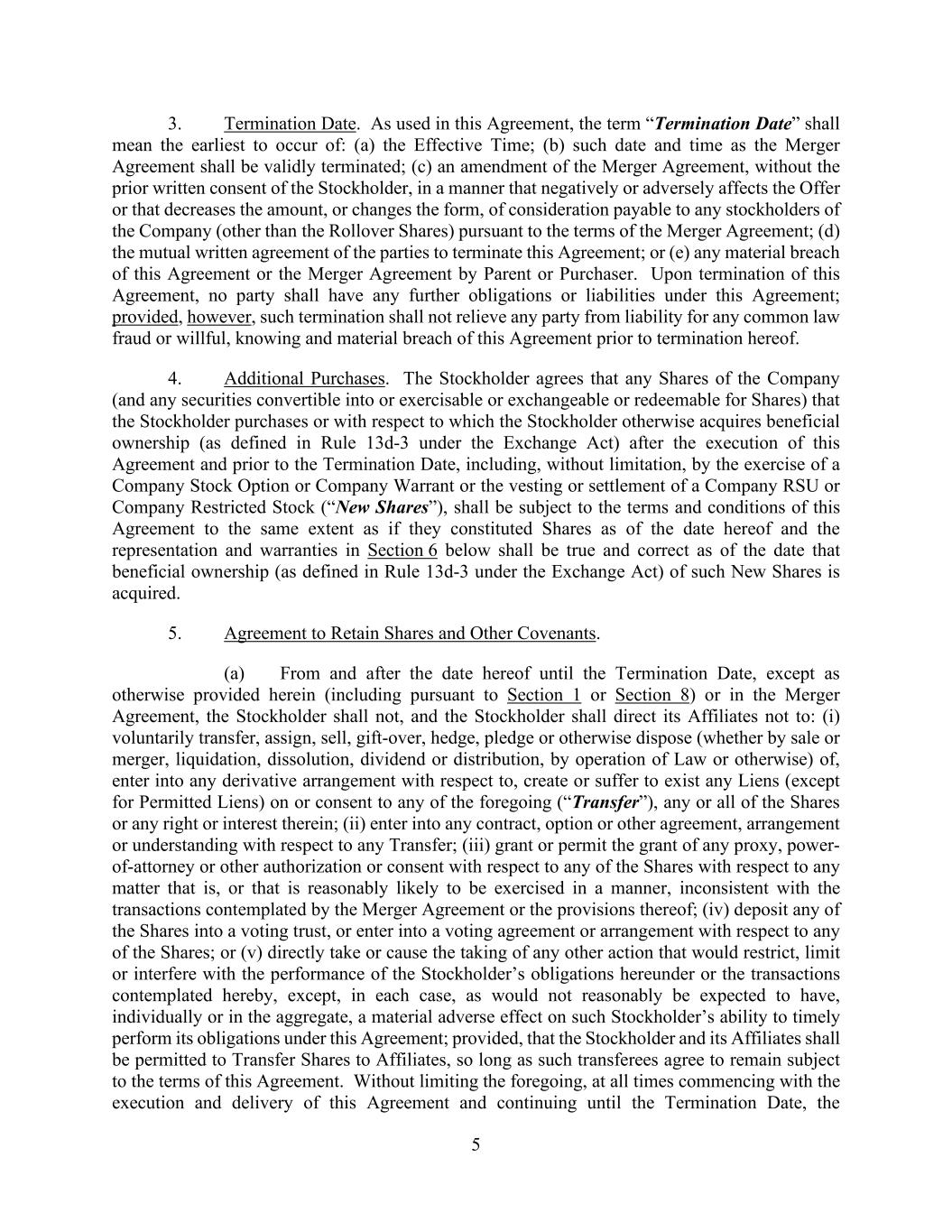 5 3. Termination Date. As used in this Agreement, the term “Termination Date” shall mean the earliest to occur of: (a) the Effective Time; (b) such date and time as the Merger Agreement shall be validly terminated; (c) an amendment of the Merger Agreement, without the prior written consent of the Stockholder, in a manner that negatively or adversely affects the Offer or that decreases the amount, or changes the form, of consideration payable to any stockholders of the Company (other than the Rollover Shares) pursuant to the terms of the Merger Agreement; (d) the mutual written agreement of the parties to terminate this Agreement; or (e) any material breach of this Agreement or the Merger Agreement by Parent or Purchaser. Upon termination of this Agreement, no party shall have any further obligations or liabilities under this Agreement; provided, however, such termination shall not relieve any party from liability for any common law fraud or willful, knowing and material breach of this Agreement prior to termination hereof. 4. Additional Purchases. The Stockholder agrees that any Shares of the Company (and any securities convertible into or exercisable or exchangeable or redeemable for Shares) that the Stockholder purchases or with respect to which the Stockholder otherwise acquires beneficial ownership (as defined in Rule 13d-3 under the Exchange Act) after the execution of this Agreement and prior to the Termination Date, including, without limitation, by the exercise of a Company Stock Option or Company Warrant or the vesting or settlement of a Company RSU or Company Restricted Stock (“New Shares”), shall be subject to the terms and conditions of this Agreement to the same extent as if they constituted Shares as of the date hereof and the representation and warranties in Section 6 below shall be true and correct as of the date that beneficial ownership (as defined in Rule 13d-3 under the Exchange Act) of such New Shares is acquired. 5. Agreement to Retain Shares and Other Covenants. (a) From and after the date hereof until the Termination Date, except as otherwise provided herein (including pursuant to Section 1 or Section 8) or in the Merger Agreement, the Stockholder shall not, and the Stockholder shall direct its Affiliates not to: (i) voluntarily transfer, assign, sell, gift-over, hedge, pledge or otherwise dispose (whether by sale or merger, liquidation, dissolution, dividend or distribution, by operation of Law or otherwise) of, enter into any derivative arrangement with respect to, create or suffer to exist any Liens (except for Permitted Liens) on or consent to any of the foregoing (“Transfer”), any or all of the Shares or any right or interest therein; (ii) enter into any contract, option or other agreement, arrangement or understanding with respect to any Transfer; (iii) grant or permit the grant of any proxy, power- of-attorney or other authorization or consent with respect to any of the Shares with respect to any matter that is, or that is reasonably likely to be exercised in a manner, inconsistent with the transactions contemplated by the Merger Agreement or the provisions thereof; (iv) deposit any of the Shares into a voting trust, or enter into a voting agreement or arrangement with respect to any of the Shares; or (v) directly take or cause the taking of any other action that would restrict, limit or interfere with the performance of the Stockholder’s obligations hereunder or the transactions contemplated hereby, except, in each case, as would not reasonably be expected to have, individually or in the aggregate, a material adverse effect on such Stockholder’s ability to timely perform its obligations under this Agreement; provided, that the Stockholder and its Affiliates shall be permitted to Transfer Shares to Affiliates, so long as such transferees agree to remain subject to the terms of this Agreement. Without limiting the foregoing, at all times commencing with the execution and delivery of this Agreement and continuing until the Termination Date, the