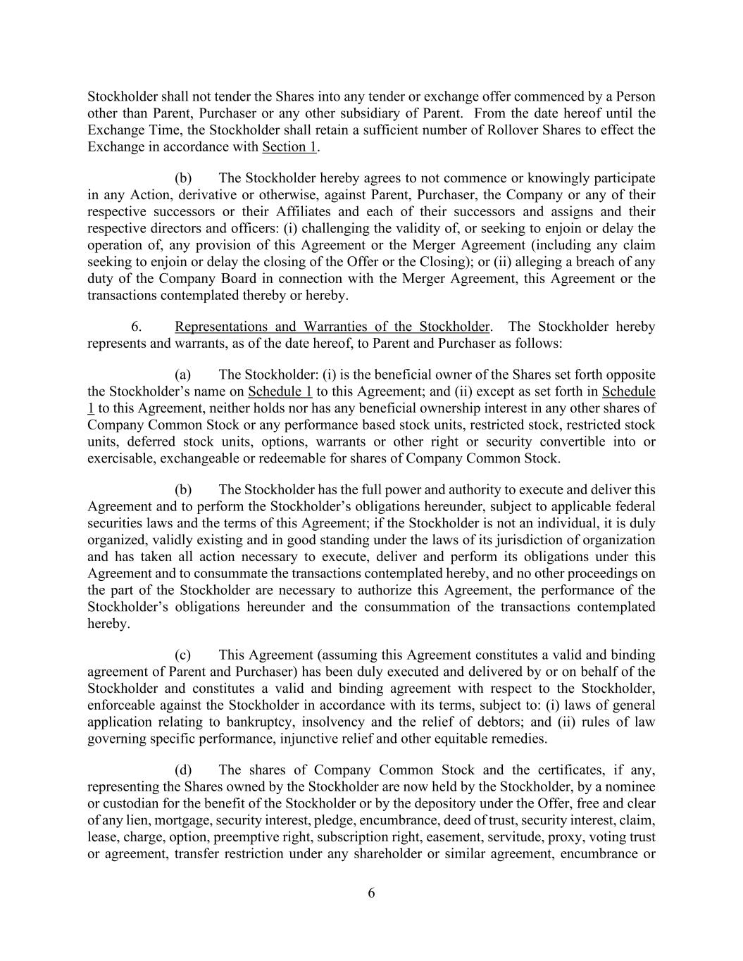 6 Stockholder shall not tender the Shares into any tender or exchange offer commenced by a Person other than Parent, Purchaser or any other subsidiary of Parent. From the date hereof until the Exchange Time, the Stockholder shall retain a sufficient number of Rollover Shares to effect the Exchange in accordance with Section 1. (b) The Stockholder hereby agrees to not commence or knowingly participate in any Action, derivative or otherwise, against Parent, Purchaser, the Company or any of their respective successors or their Affiliates and each of their successors and assigns and their respective directors and officers: (i) challenging the validity of, or seeking to enjoin or delay the operation of, any provision of this Agreement or the Merger Agreement (including any claim seeking to enjoin or delay the closing of the Offer or the Closing); or (ii) alleging a breach of any duty of the Company Board in connection with the Merger Agreement, this Agreement or the transactions contemplated thereby or hereby. 6. Representations and Warranties of the Stockholder. The Stockholder hereby represents and warrants, as of the date hereof, to Parent and Purchaser as follows: (a) The Stockholder: (i) is the beneficial owner of the Shares set forth opposite the Stockholder’s name on Schedule 1 to this Agreement; and (ii) except as set forth in Schedule 1 to this Agreement, neither holds nor has any beneficial ownership interest in any other shares of Company Common Stock or any performance based stock units, restricted stock, restricted stock units, deferred stock units, options, warrants or other right or security convertible into or exercisable, exchangeable or redeemable for shares of Company Common Stock. (b) The Stockholder has the full power and authority to execute and deliver this Agreement and to perform the Stockholder’s obligations hereunder, subject to applicable federal securities laws and the terms of this Agreement; if the Stockholder is not an individual, it is duly organized, validly existing and in good standing under the laws of its jurisdiction of organization and has taken all action necessary to execute, deliver and perform its obligations under this Agreement and to consummate the transactions contemplated hereby, and no other proceedings on the part of the Stockholder are necessary to authorize this Agreement, the performance of the Stockholder’s obligations hereunder and the consummation of the transactions contemplated hereby. (c) This Agreement (assuming this Agreement constitutes a valid and binding agreement of Parent and Purchaser) has been duly executed and delivered by or on behalf of the Stockholder and constitutes a valid and binding agreement with respect to the Stockholder, enforceable against the Stockholder in accordance with its terms, subject to: (i) laws of general application relating to bankruptcy, insolvency and the relief of debtors; and (ii) rules of law governing specific performance, injunctive relief and other equitable remedies. (d) The shares of Company Common Stock and the certificates, if any, representing the Shares owned by the Stockholder are now held by the Stockholder, by a nominee or custodian for the benefit of the Stockholder or by the depository under the Offer, free and clear of any lien, mortgage, security interest, pledge, encumbrance, deed of trust, security interest, claim, lease, charge, option, preemptive right, subscription right, easement, servitude, proxy, voting trust or agreement, transfer restriction under any shareholder or similar agreement, encumbrance or